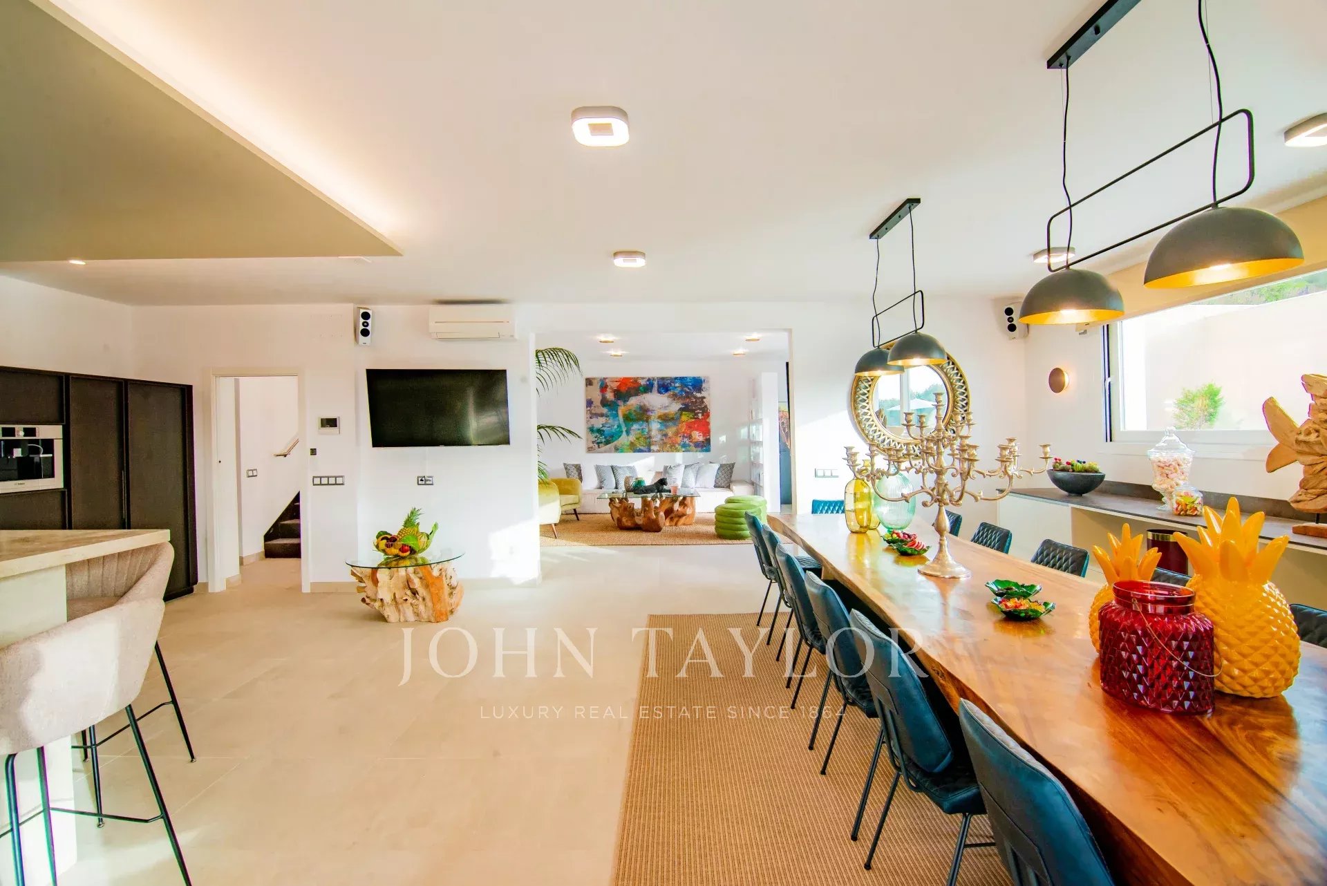 Située dans un cadre naturel et serein, entre le charmant village de Santa Eulalia et la vibrante Ibiza, cette villa vous offre une expérience inégalée. Entourée d'une vague luxuriante de pins, cette résidence se distingue par son confort et son design incomparables, parfaitement adaptés aux familles nombreuses et aux groupes d'amis.