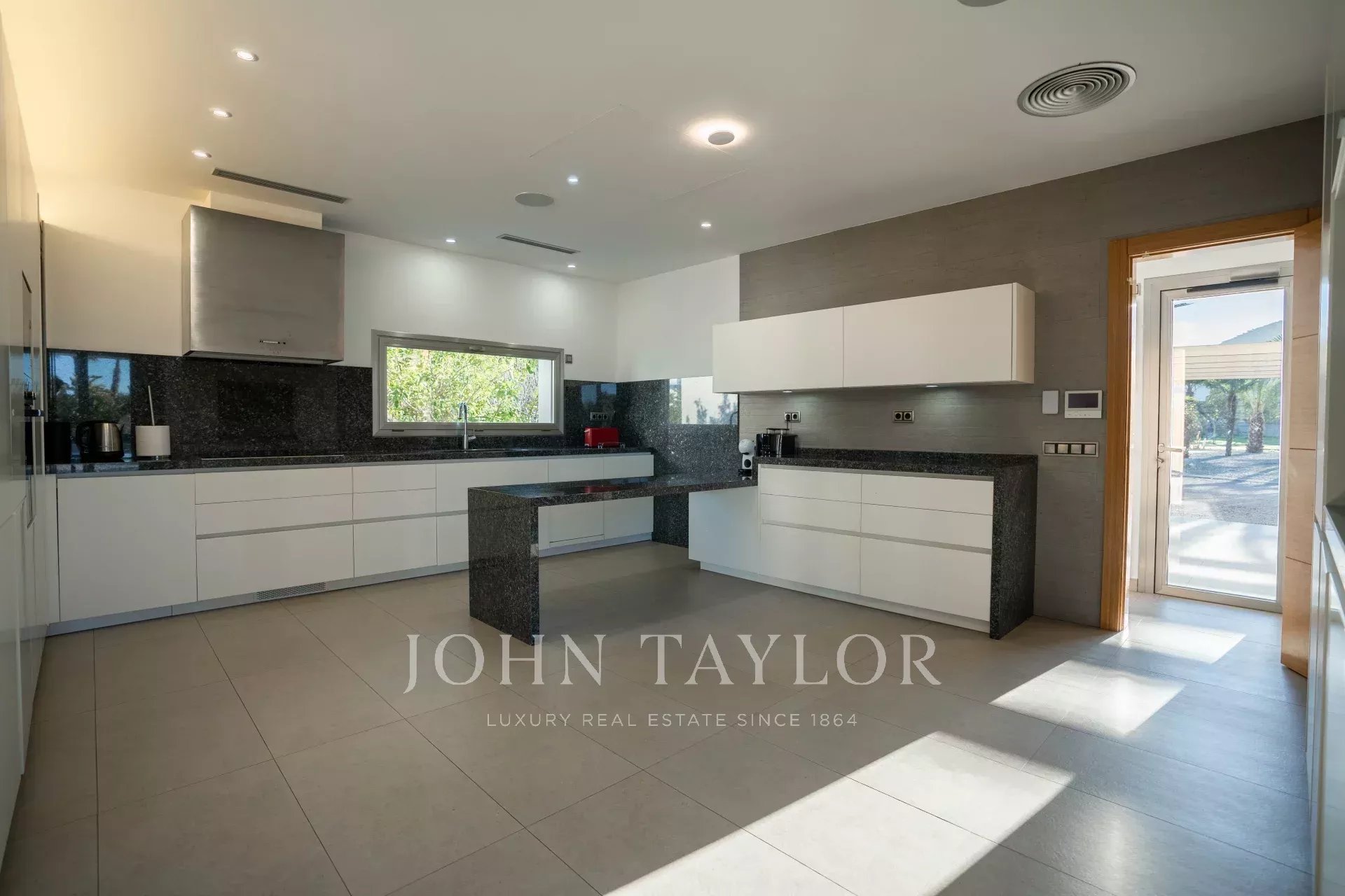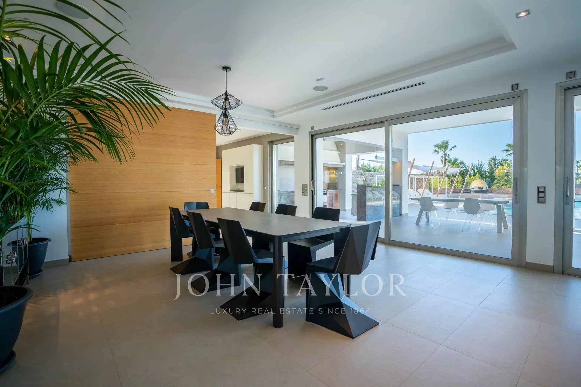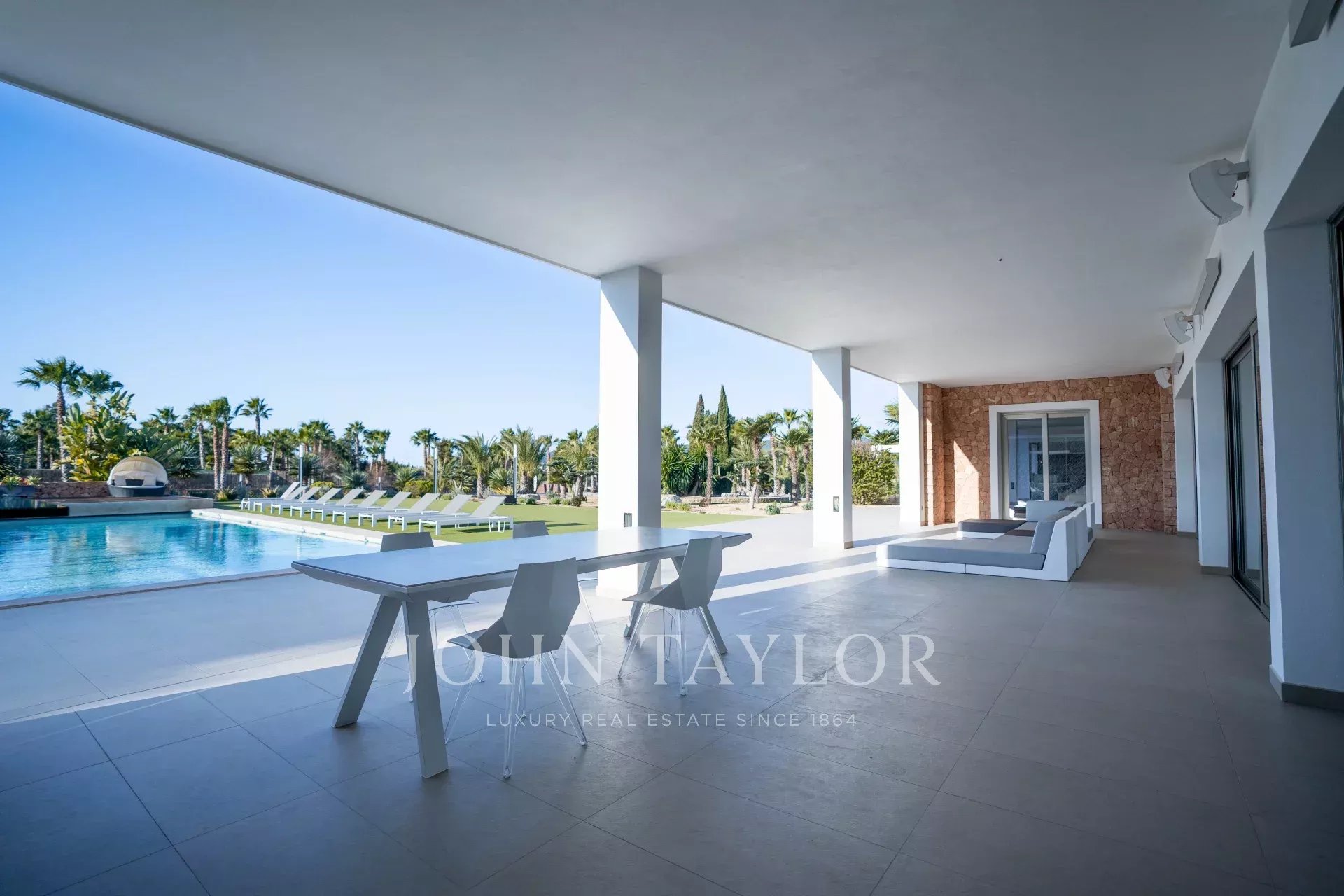 Cette luxueuse villa est immergée dans un grand jardin avec une piscine et une terrasse, ainsi qu'une maison d'hôtes, un espace barbecue, une salle de sport et un mini club, entre autres équipements.