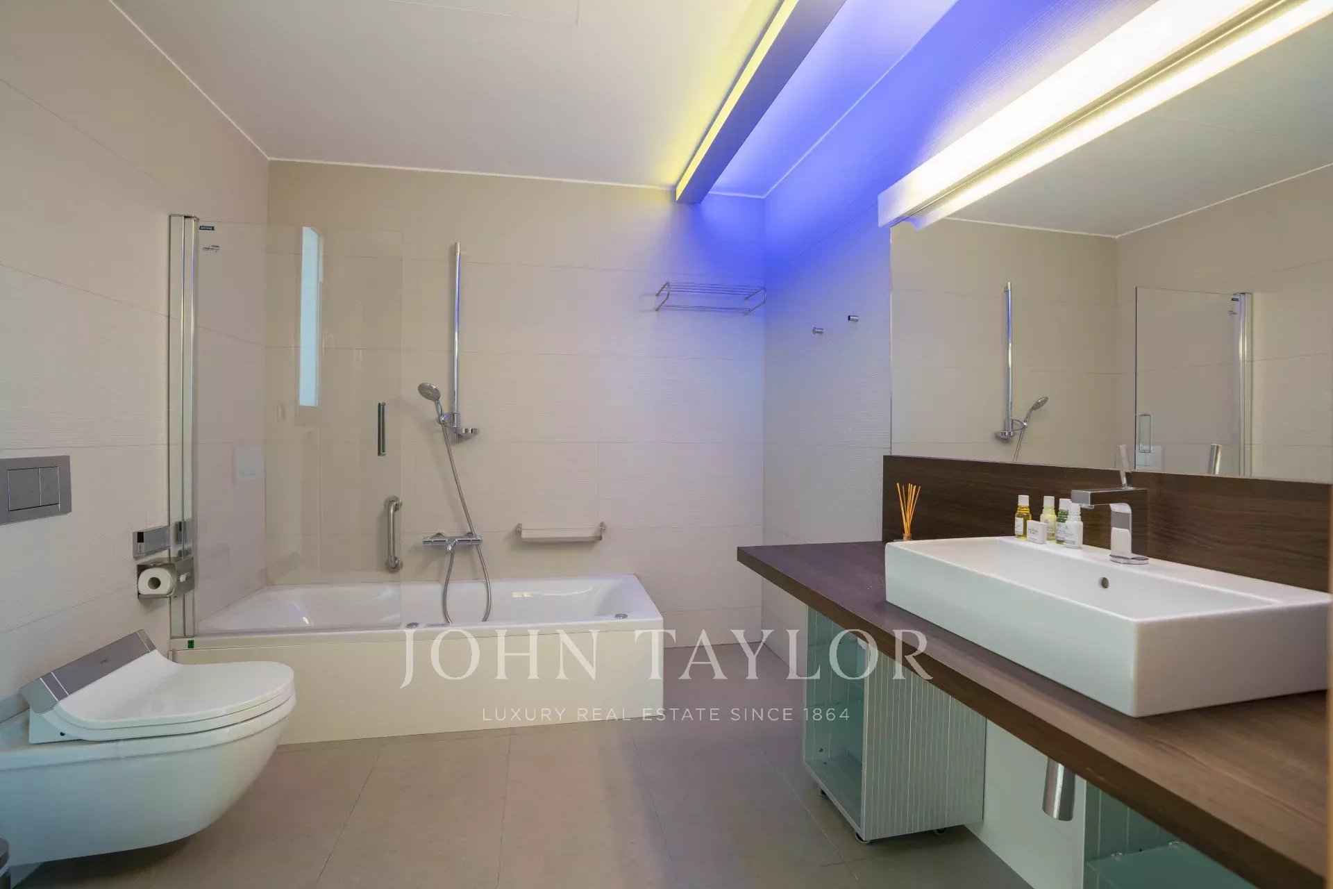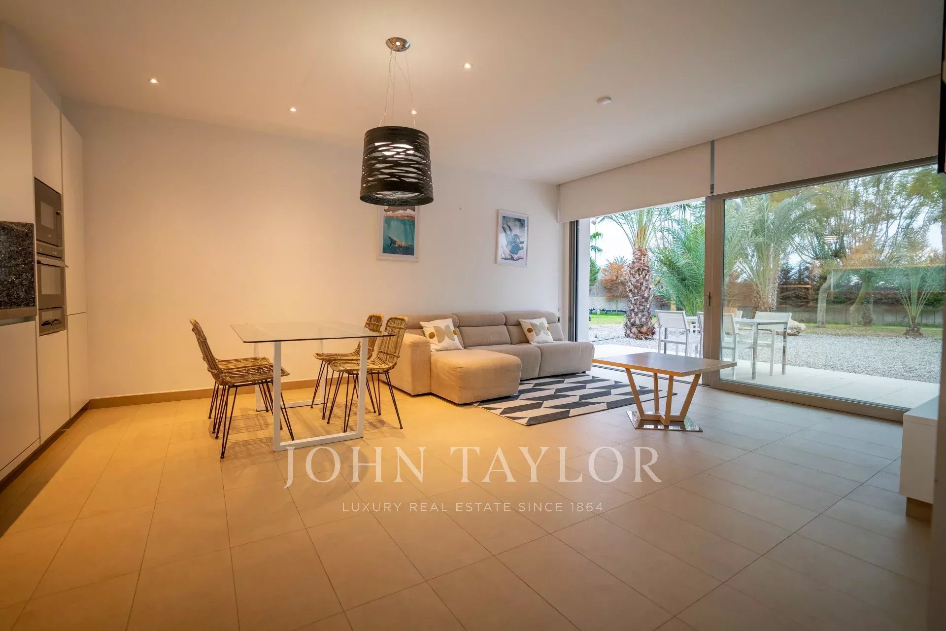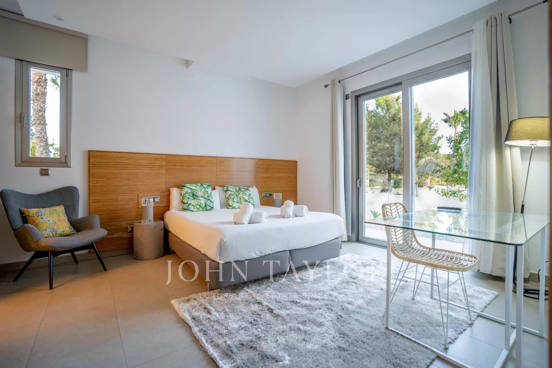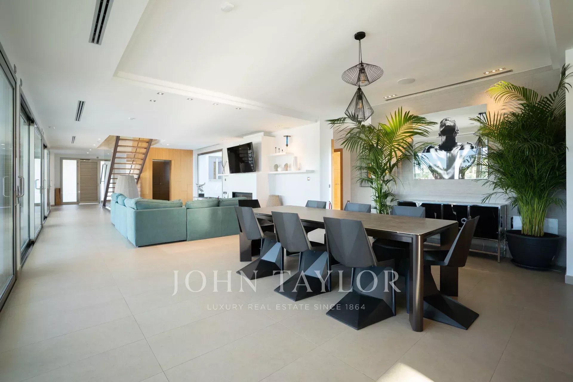 Cette luxueuse villa est immergée dans un grand jardin avec une piscine et une terrasse, ainsi qu'une maison d'hôtes, un espace barbecue, une salle de sport et un mini club, entre autres équipements.