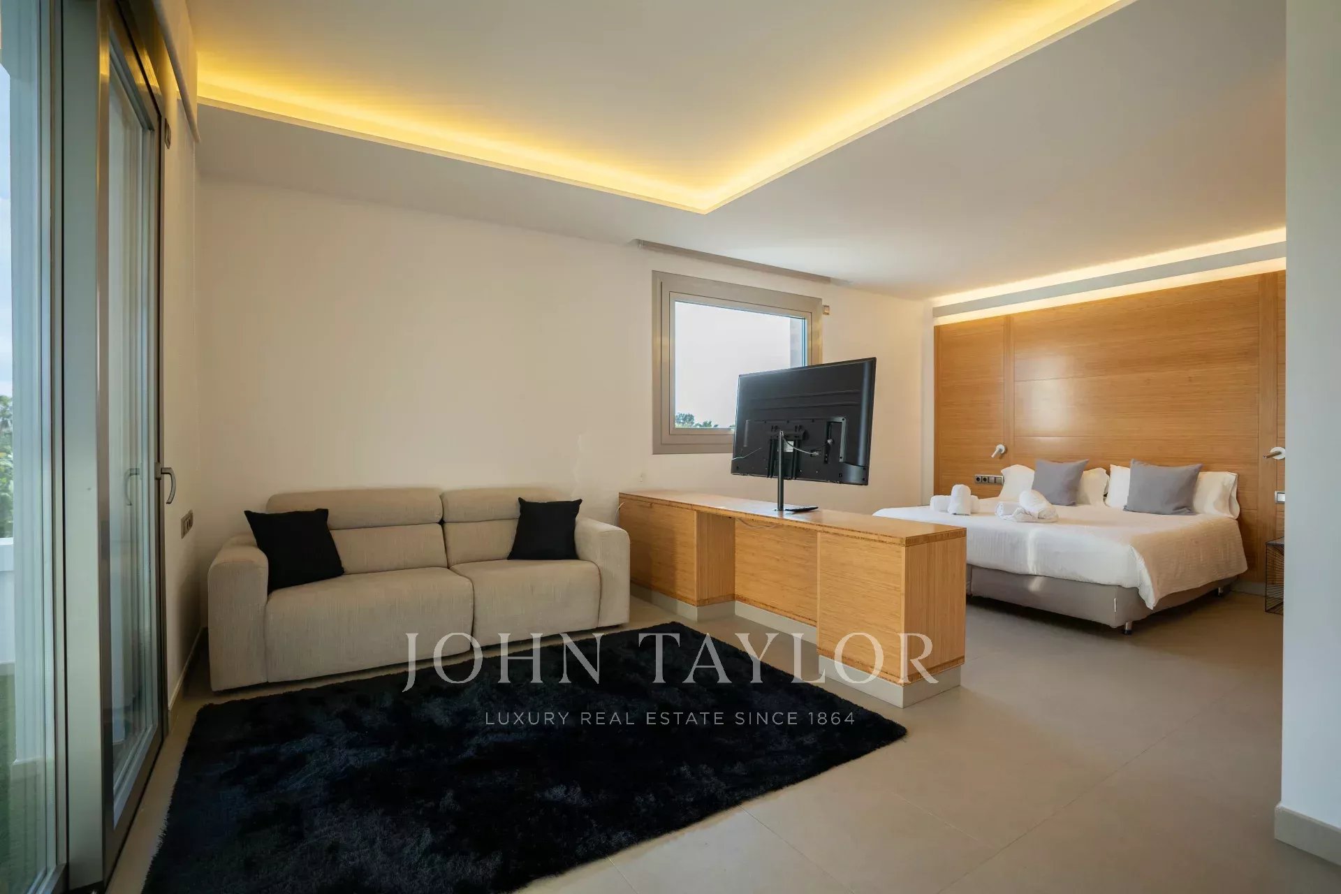 À l'intérieur, la villa peut accueillir jusqu'à 14 personnes. Dans la maison principale, six chambres sont réparties sur deux étages : trois au rez-de-chaussée et trois autres au premier étage, dont cinq ont leur propre salle de bains. En outre, à l'étage supérieur, il y a une chambre double avec une baignoire d'hydromassage et une terrasse privée. De plus, l'appartement attenant, avec accès privé, dispose de deux chambres supplémentaires, de salles de bains, d'une cuisine entièrement équipée et d'un salon.