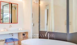 Au rez-de-chaussée, une chambre en suite se trouve, tandis qu'à l'étage supérieur, il y a deux autres chambres, dont la suite parentale avec baignoire, douche et une fabuleuse terrasse privée. Depuis cette dernière, vous pouvez admirer la vue sur le jardin et la mer au loin.
