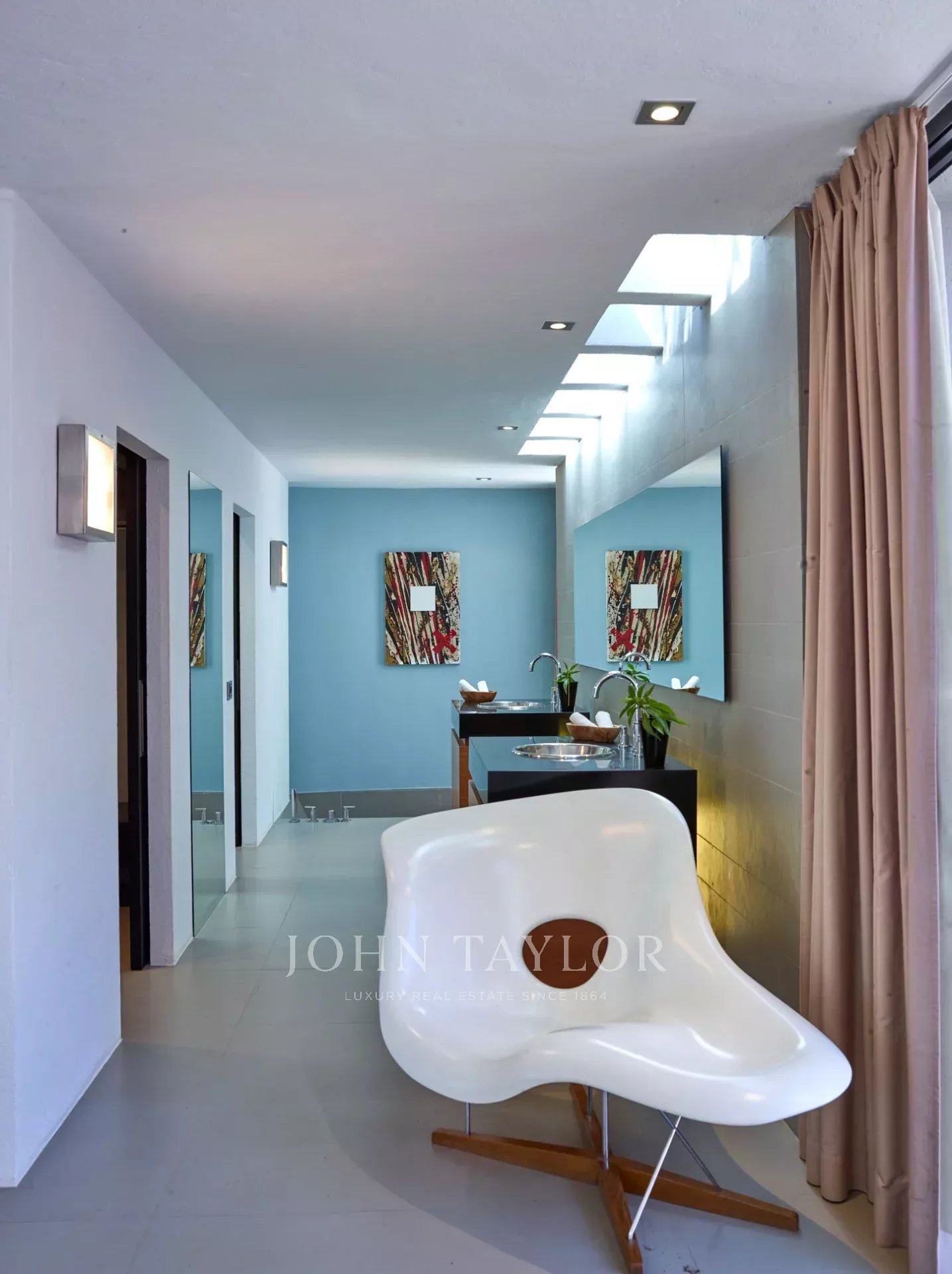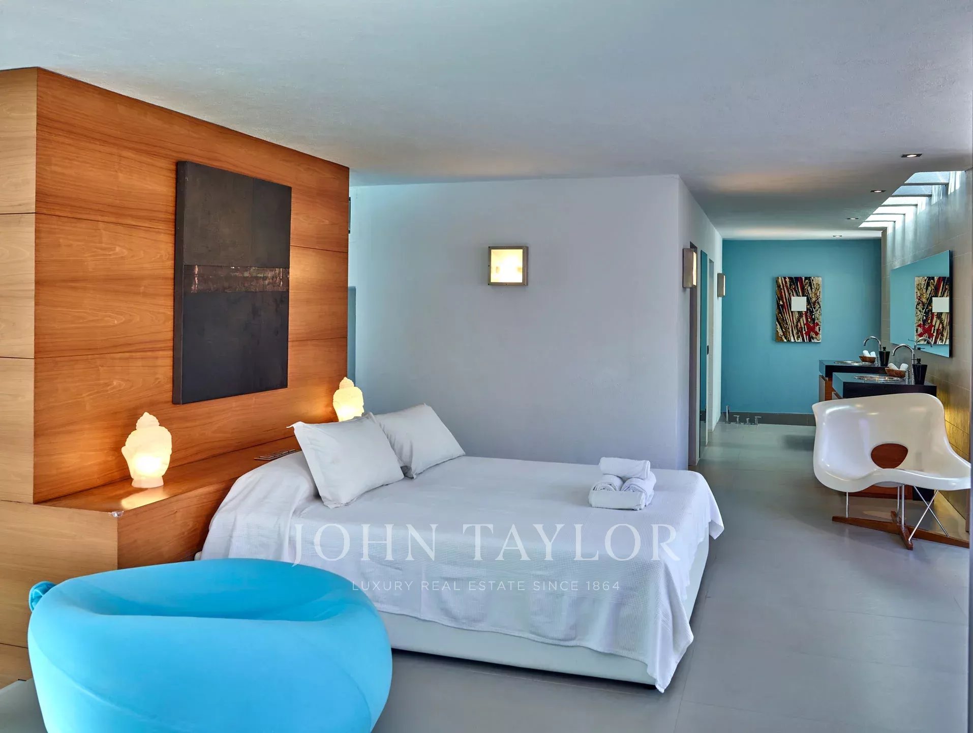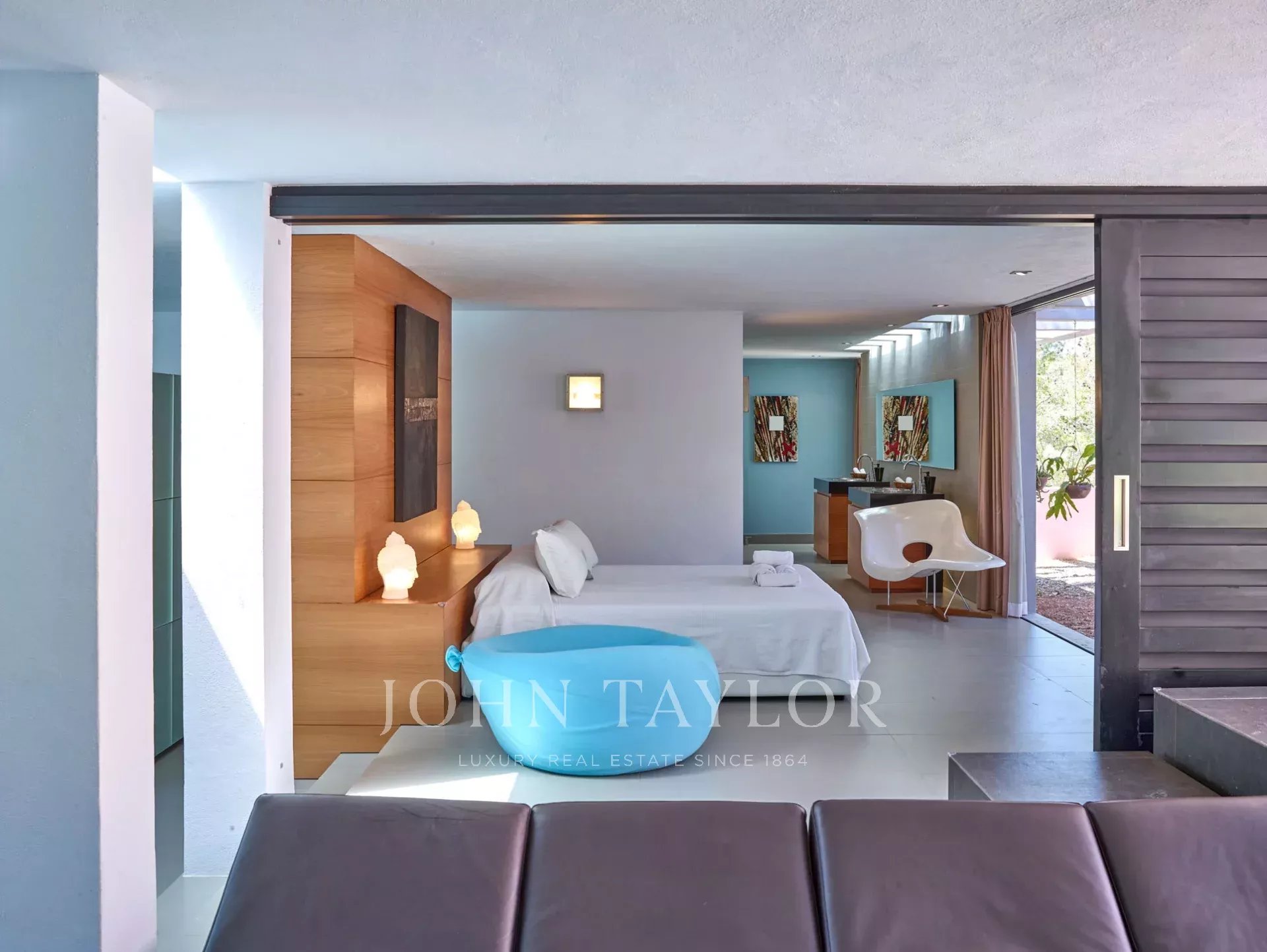 La villa dispose de plusieurs chambres avec salle de bains attenante, toutes avec accès à l'extérieur via de grandes portes coulissantes. La chambre principale, avec une salle de bains privative comprenant une douche séparée avec jets latéraux, est connectée à la pièce principale, mais offre également de l'intimité grâce à des portes coulissantes. D'autres chambres ont un accès direct au jardin ou à une terrasse en bois sous la piscine, créant une ambiance unique et relaxante.