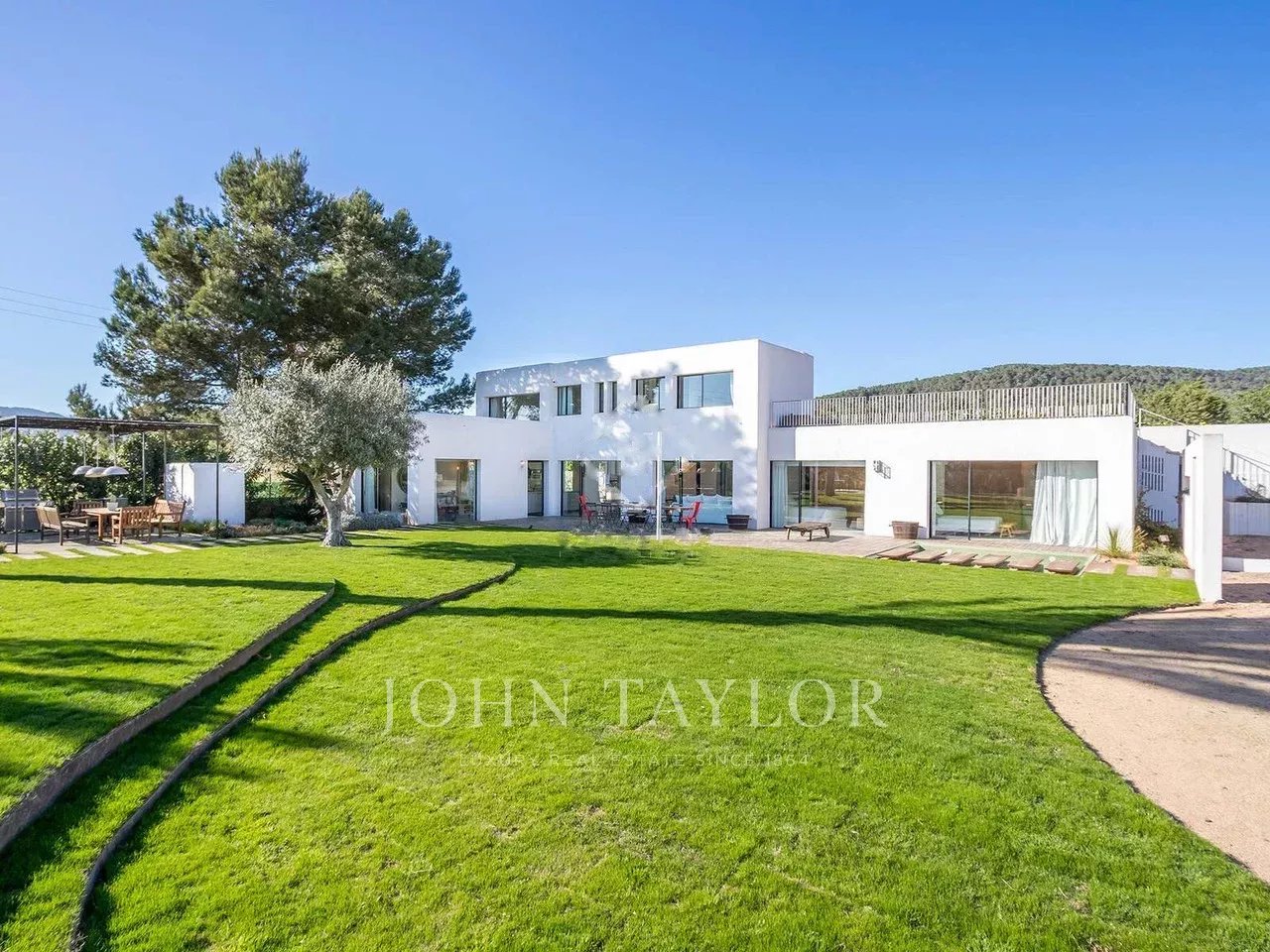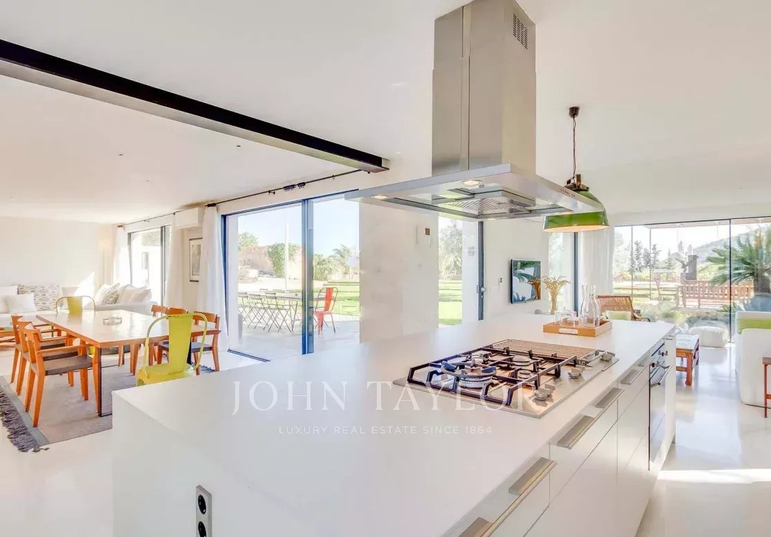 Entourée d'un jardin plat avec pelouse naturelle et une piscine carrelée en émeraude, cette propriété baignée de lumière respire la sérénité et l'élégance.