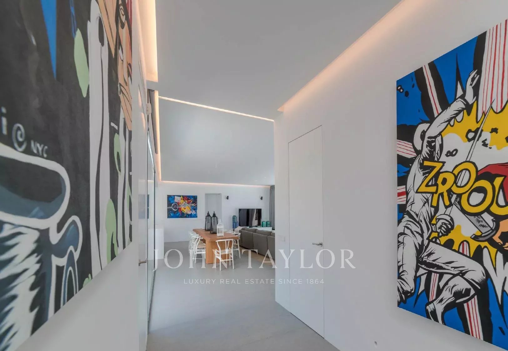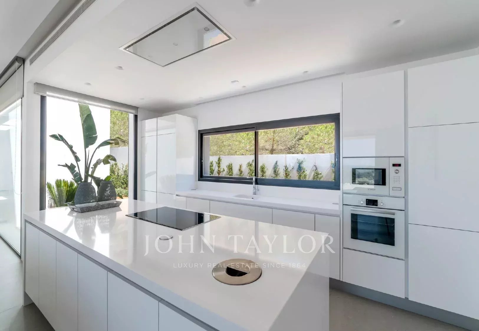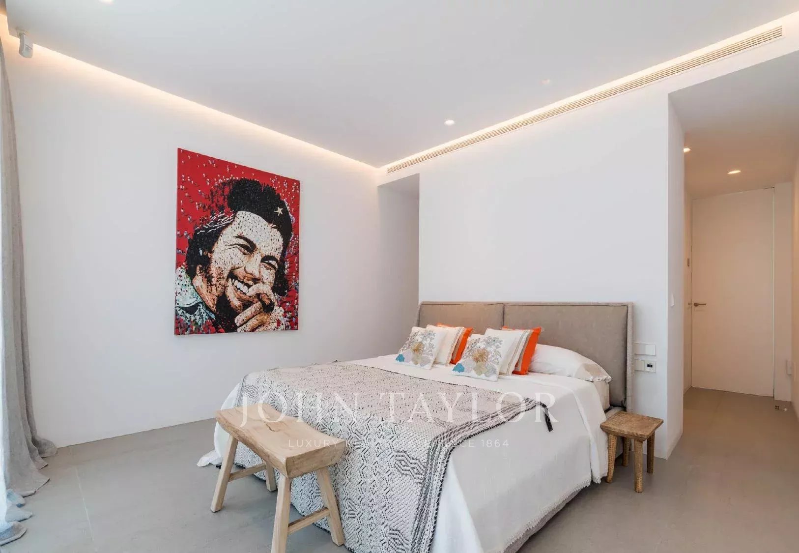 De plain-pied, la maison est idéale pour un confort quotidien. Elle dispose de cinq chambres doubles, toutes avec salle de bain privative, d’un salon élégant à aire ouverte et d’une cuisine moderne équipée d’électroménagers haut de gamme. Les espaces communs s’ouvrent directement sur les terrasses, le jardin et une piscine à débordement de 20 mètres, chauffable en avril, mai, octobre et novembre, sans frais supplémentaires.