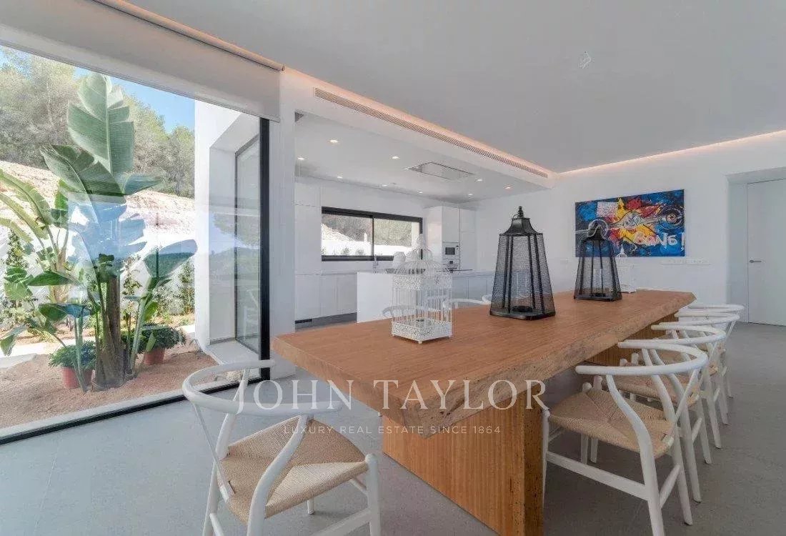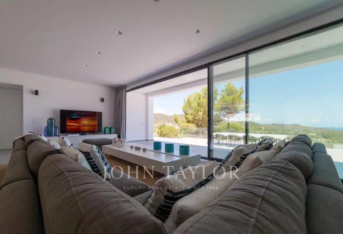 Superbe villa de cinq chambres située dans une zone montagneuse exclusive le long de la route de Sant Josep, offrant une intimité totale tout en étant à seulement dix minutes en voiture de l’aéroport et à proximité des meilleures plages, restaurants et clubs d’Ibiza.