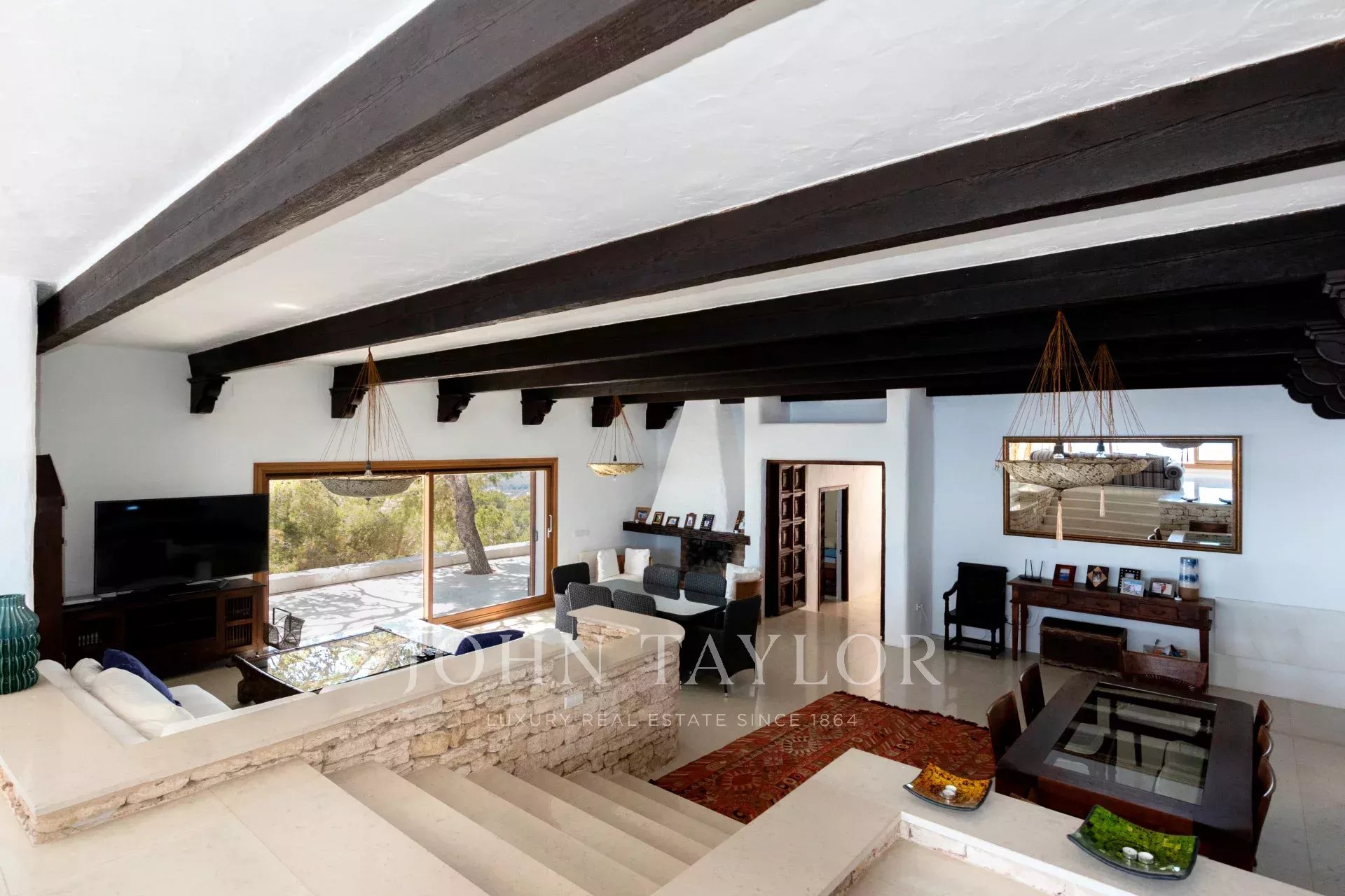 La propriété se compose de trois villas de luxe contiguës : une dans le style romantique de l'ancienne Ibiza, une dans le style moderne des vacances et une troisième avec une maison pour le personnel. Elles disposent au total de 9 chambres, 8 salles de bains, de vastes espaces de vie, d'une bibliothèque, d'un sauna et d'un jacuzzi.