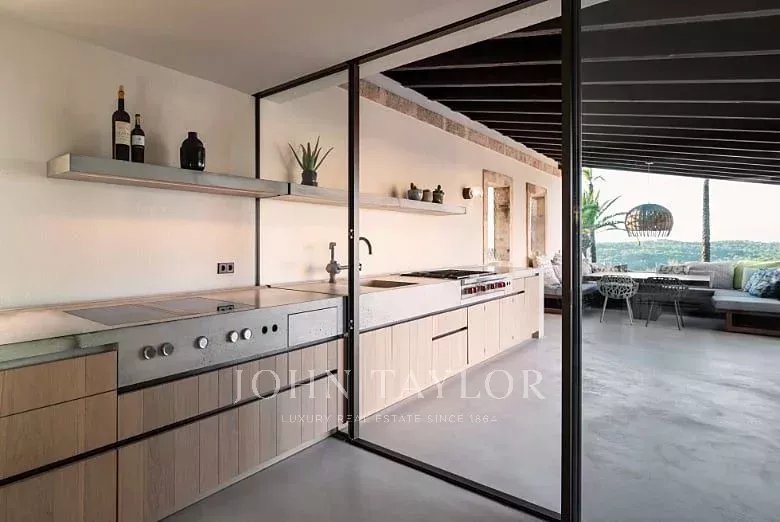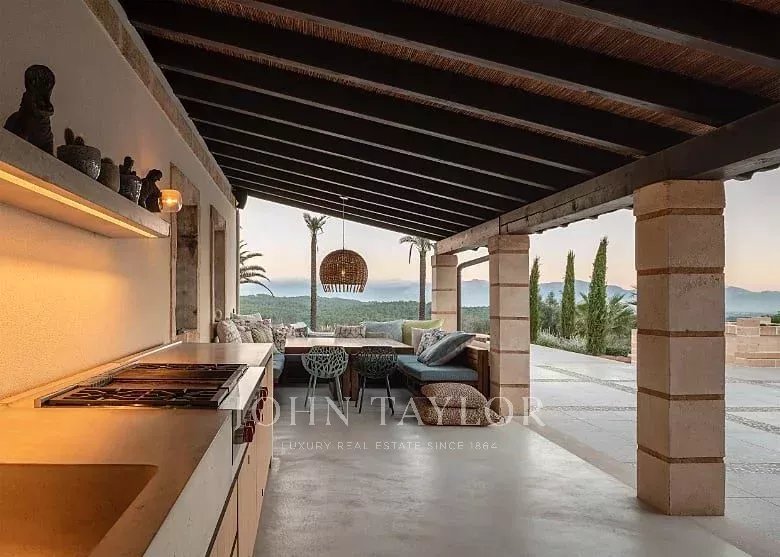 Finca de luxe exceptionnelle sur un terrain de 33 000 m2. La maison peut accueillir jusqu'à 10 personnes. 4 chambres, dont 3 avec salle de bains en-suite et une avec salle de bains séparée, sont situées dans la maison principale. Une autre chambre avec salle de bains se trouve dans la maison d'amis séparée et non climatisée. Les éléments d'une finca traditionnelle rencontrent ici des matériaux de haute qualité et des meubles design. La salle de séjour spacieuse, aux murs exceptionnellement hauts de 5,5 m de long, la table à manger, le grand comptoir de bar et l'éclairage indirect créent une ambiance très particulière. La grande cuisine design à l'intérieur de la maison donne sur une cuisine extérieure couverte. L'espace extérieur offre également plusieurs équipements qui feront de votre séjour une expérience très spéciale. Profitez d'une vue panoramique imprenable sur le paysage majorquin et sur toute la chaîne de montagnes de Tramnuntana. Plusieurs terrasses couvertes et non couvertes avec des espaces de détente et des meubles de salon offrent suffisamment d'espace pour savourer un verre de vin en toute intimité au milieu de la nature. La piscine à débordement de 5m x 16m est chauffée et peut être utilisée toute l'année. Un grand sauna avec une vue magnifique vous attend également. Une salle de fitness est également disponible pour les amateurs de fitness. Le système d'osmose de la maison alimente toute la maison en eau potable.