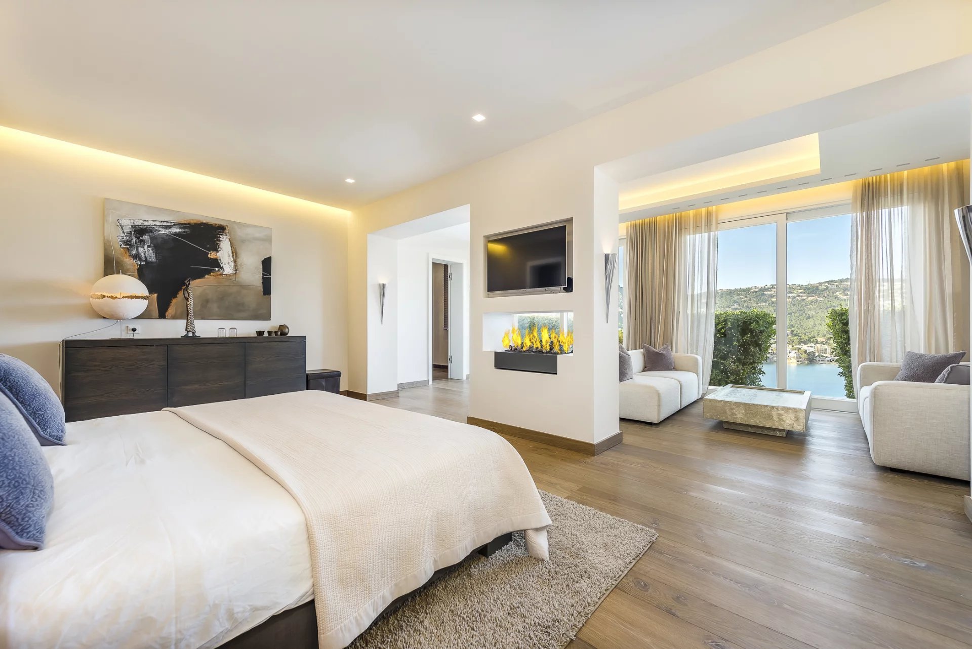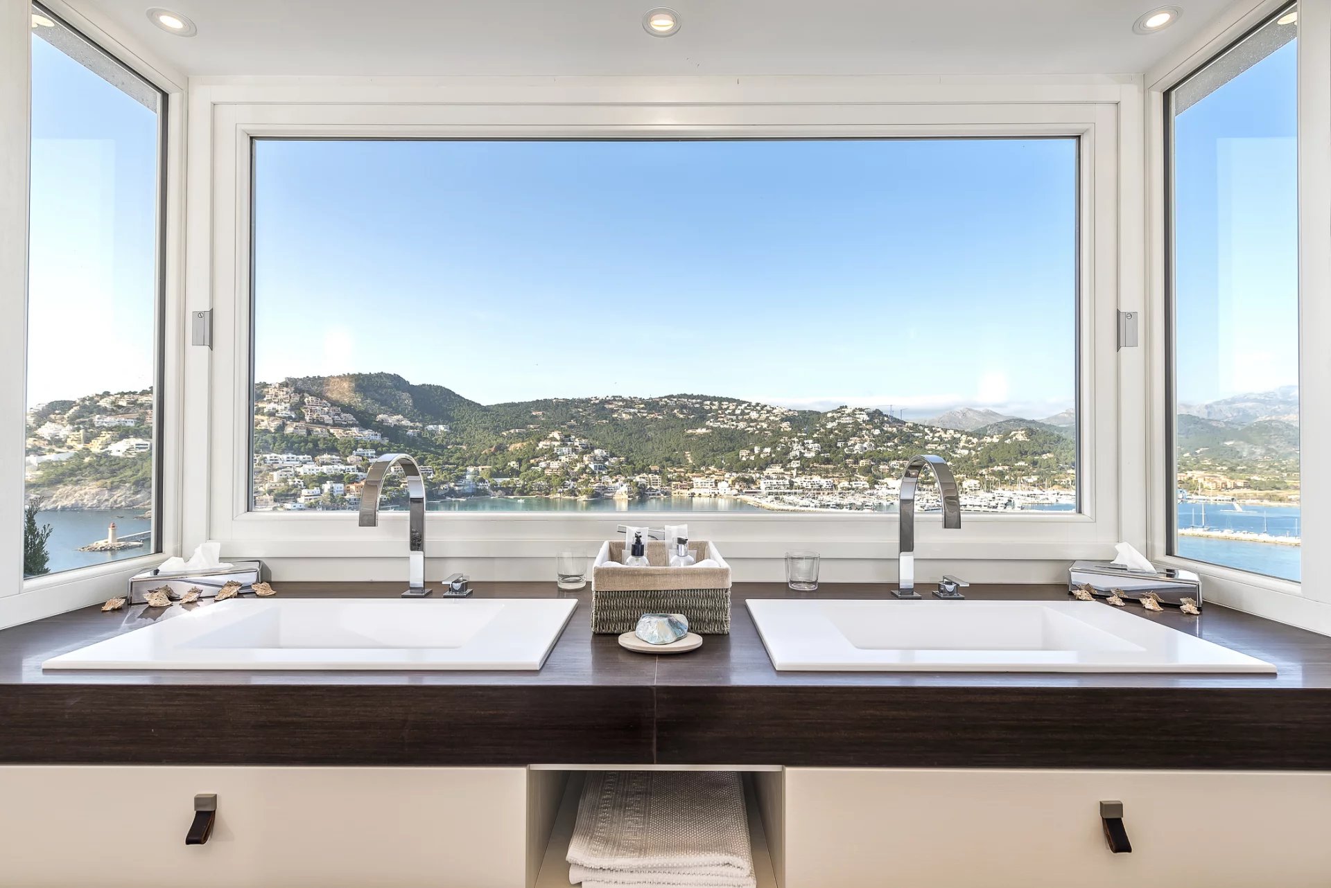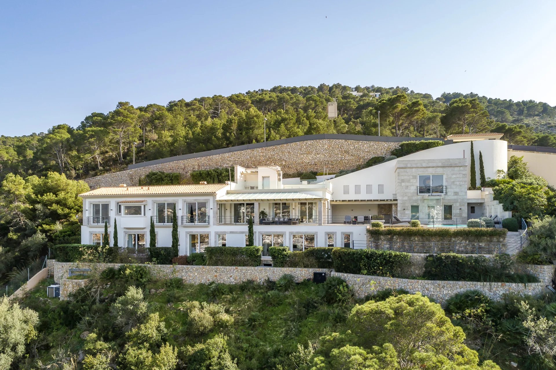 Villa de luxe dans un emplacement de choix. Dans cette villa de construction récente, 5 chambres à coucher avec salles de bains attenantes sont réparties sur 600 m2 d'espace habitable. La construction et le design modernes sont présents dans toute la maison. La cuisine ouverte entièrement équipée ne laisse rien à désirer. Que ce soit depuis la chambre à coucher, le salon confortable avec cheminée ou la cuisine, chaque pièce offre une vue imprenable sur la baie de Puerto de Andratx et le port. À l'extérieur, vous trouverez une piscine chauffée à débordement avec une zone de détente et une grande table à manger avec un barbecue. Le sauna de l'hôtel est un point fort, car il offre une vue magnifique sur la mer grâce à sa grande façade vitrée. Des couchers de soleil à couper le souffle sont garantis ici.