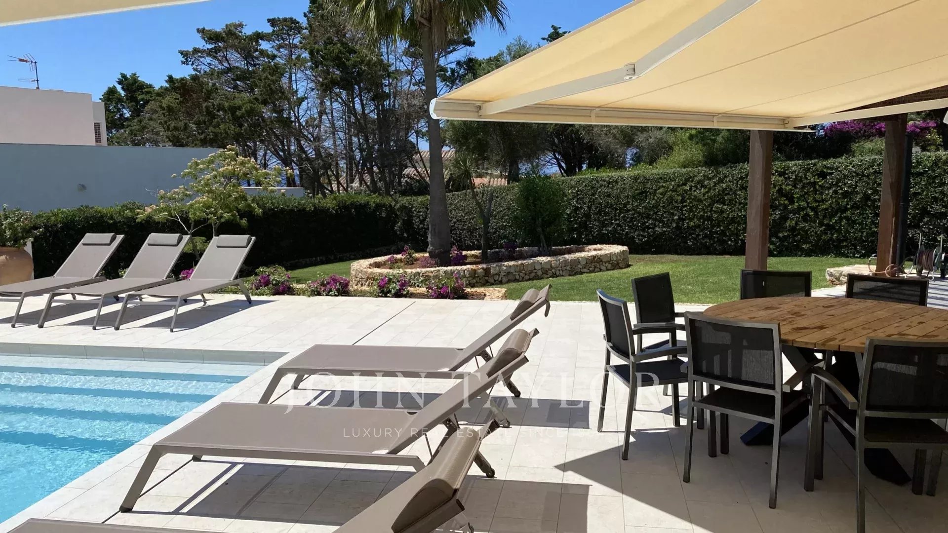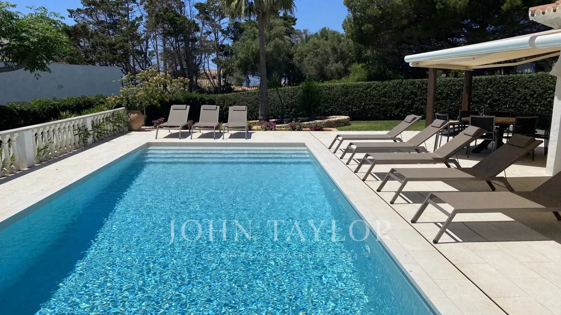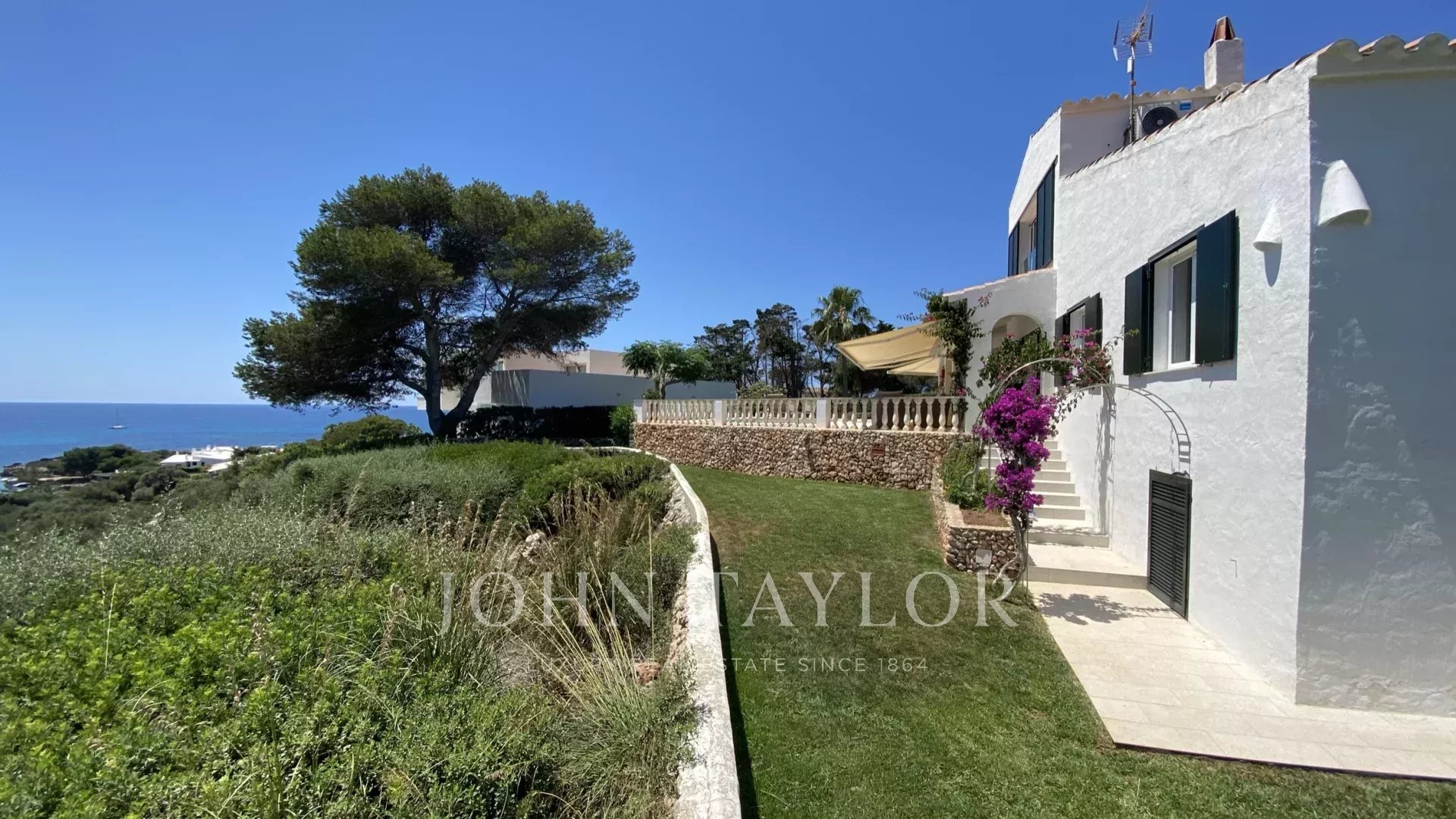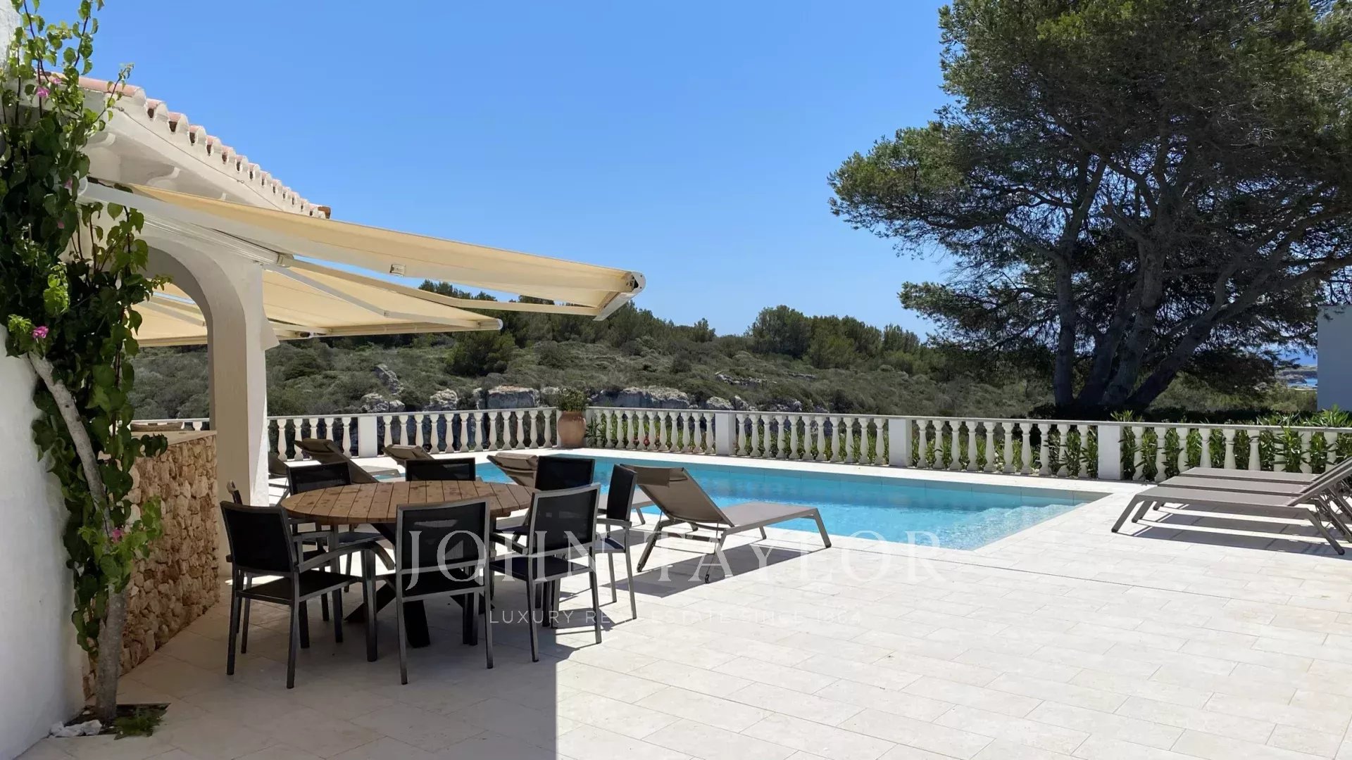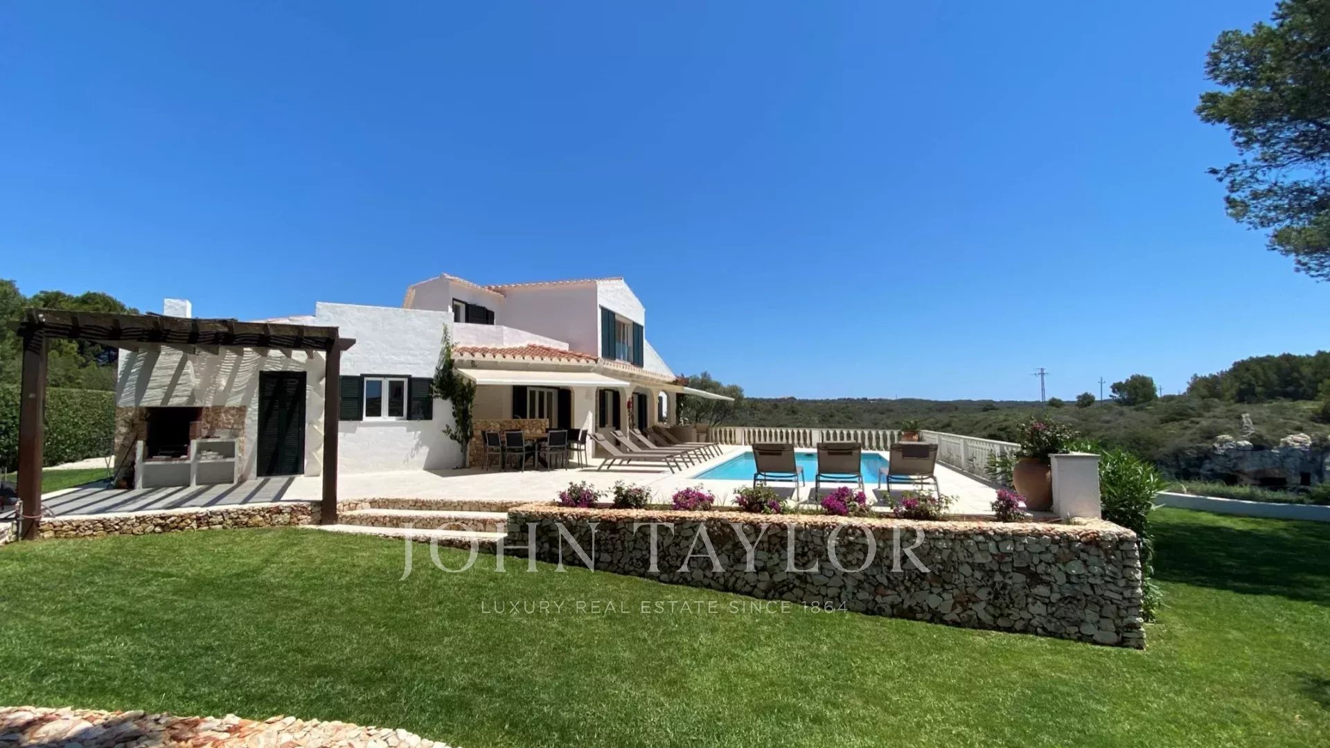 Extérieur: La propriété offre de belles vues sur la mer depuis le porche et la terrasse de la piscine. Sous le porche, à côté d'une pergola avec une table et des chaises, il y a une petite cuisine américaine avec un barbecue intégré pour manger en plein air. La partie inférieure du jardin dispose d'une grande pelouse idéale pour les enfants.