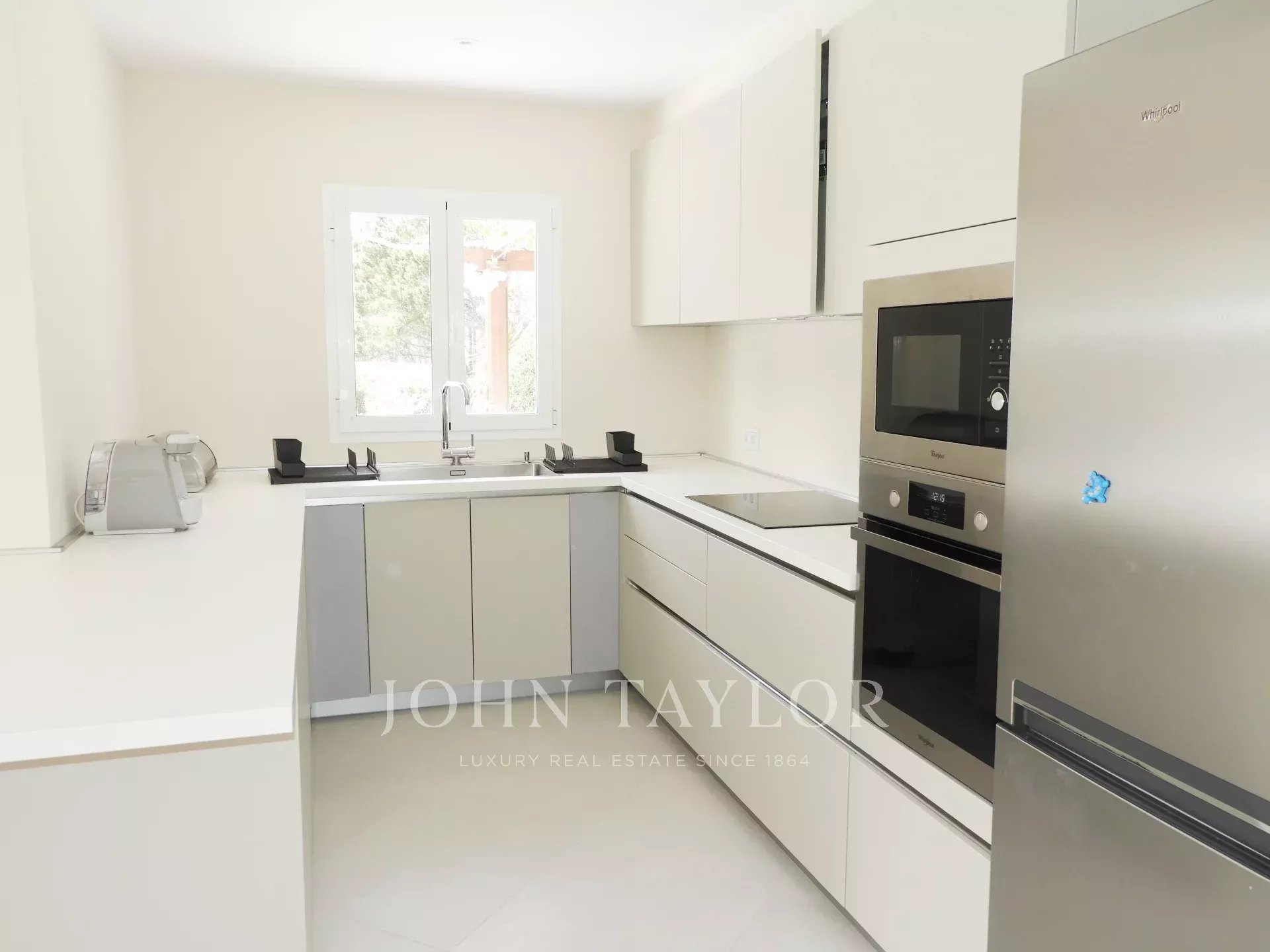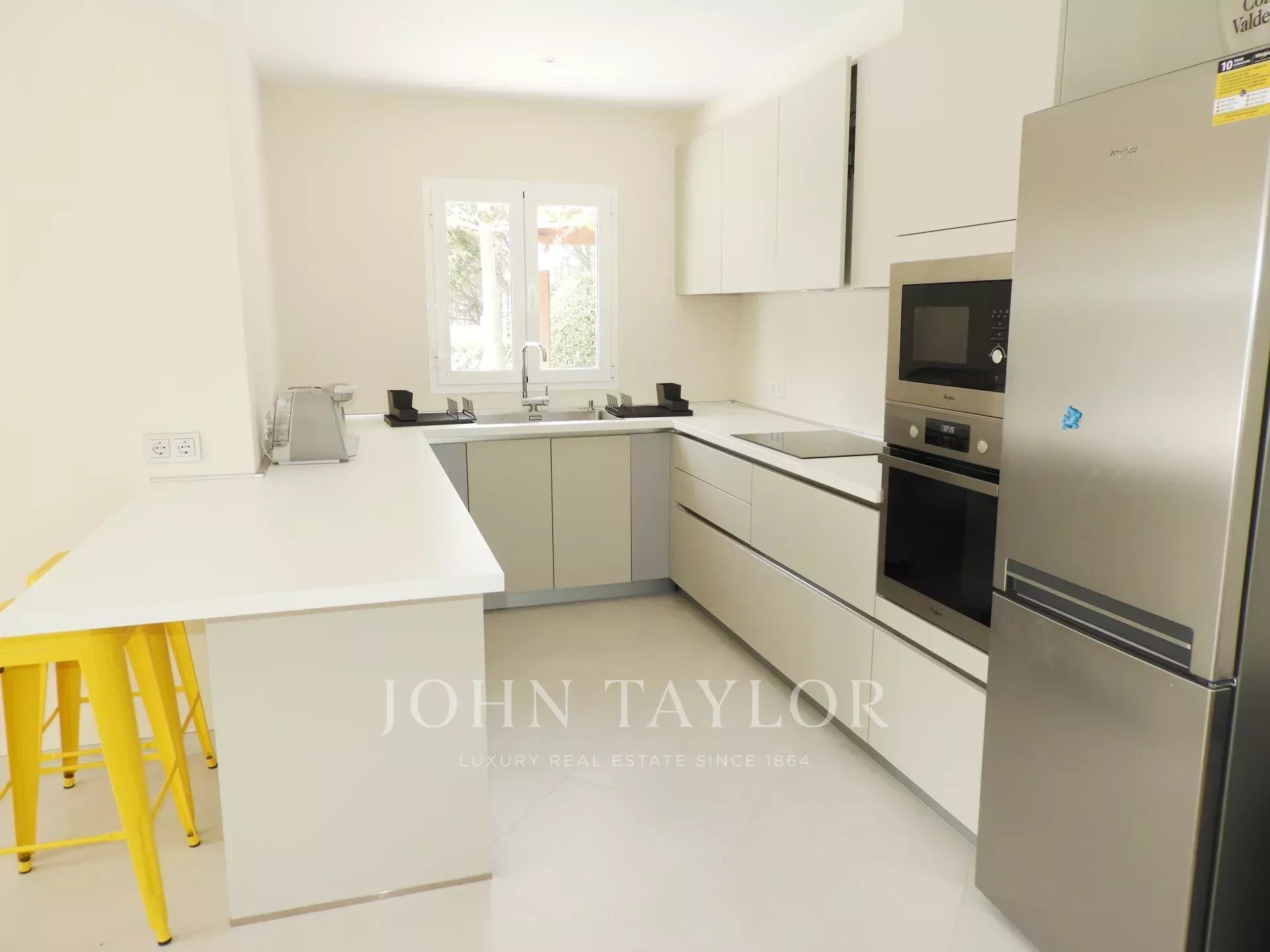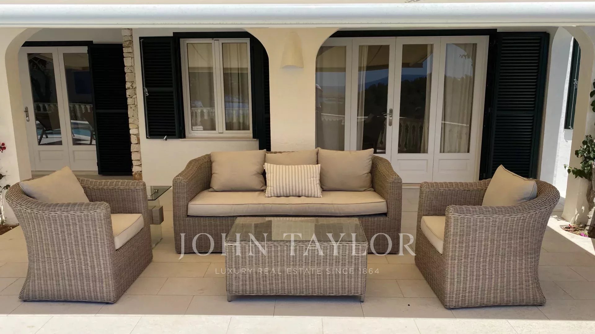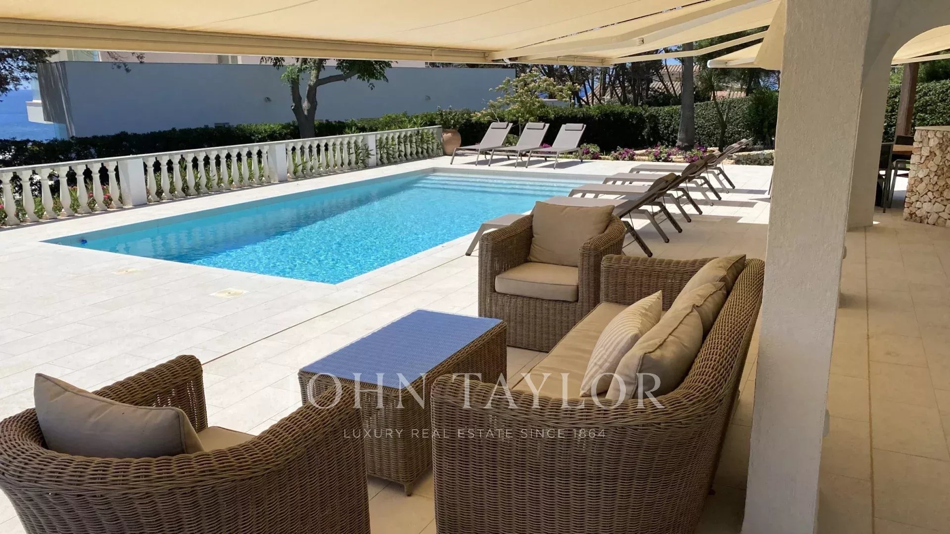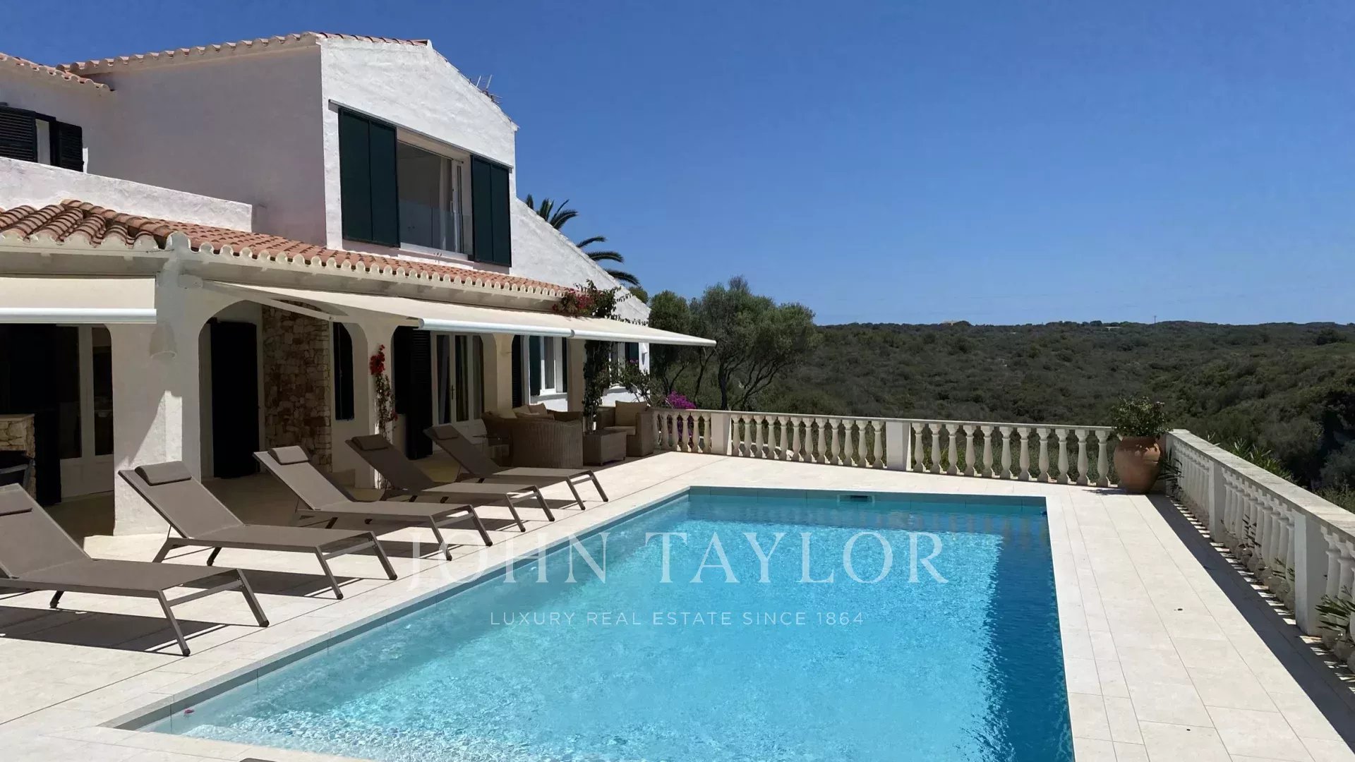 Extérieur: La propriété offre de belles vues sur la mer depuis le porche et la terrasse de la piscine. Sous le porche, à côté d'une pergola avec une table et des chaises, il y a une petite cuisine américaine avec un barbecue intégré pour manger en plein air. La partie inférieure du jardin dispose d'une grande pelouse idéale pour les enfants.