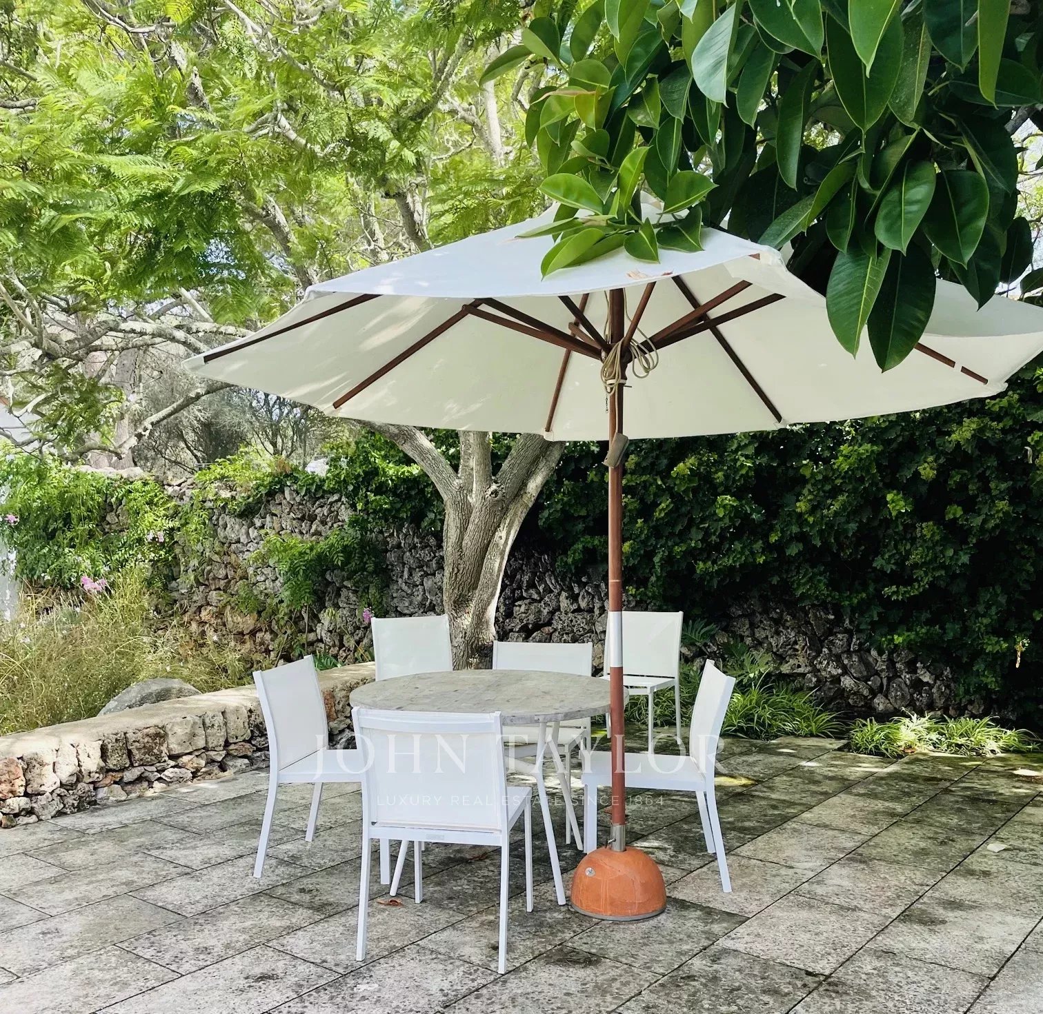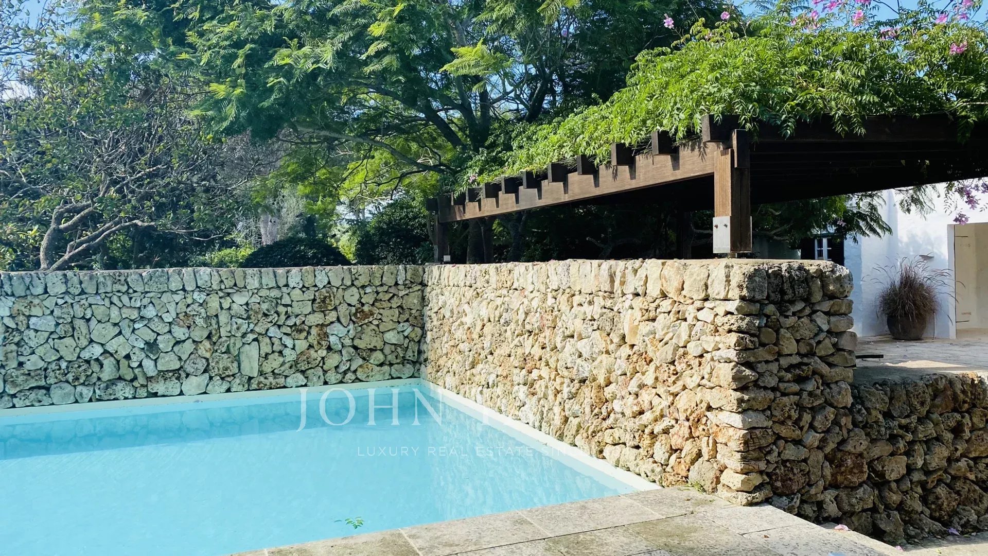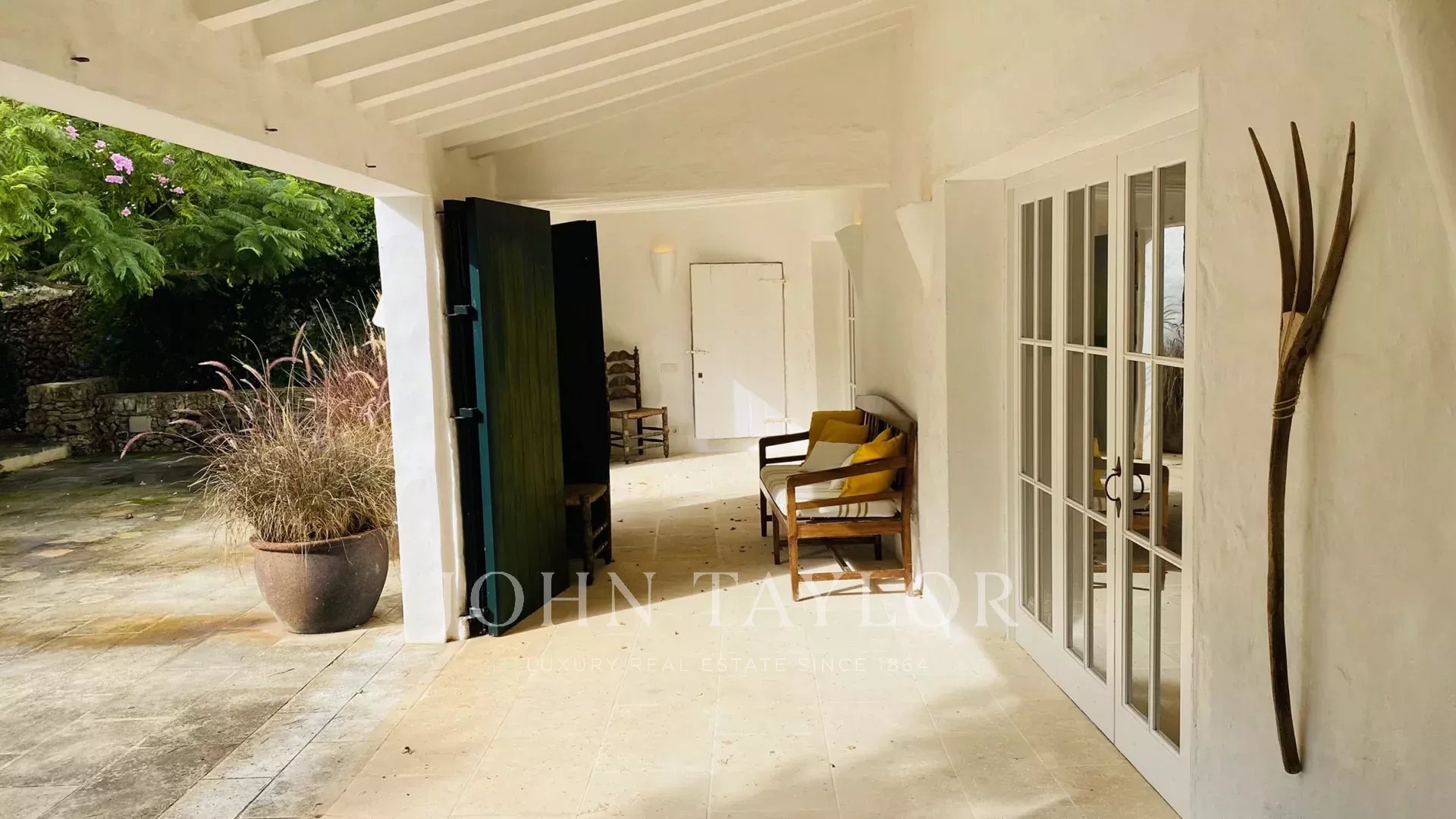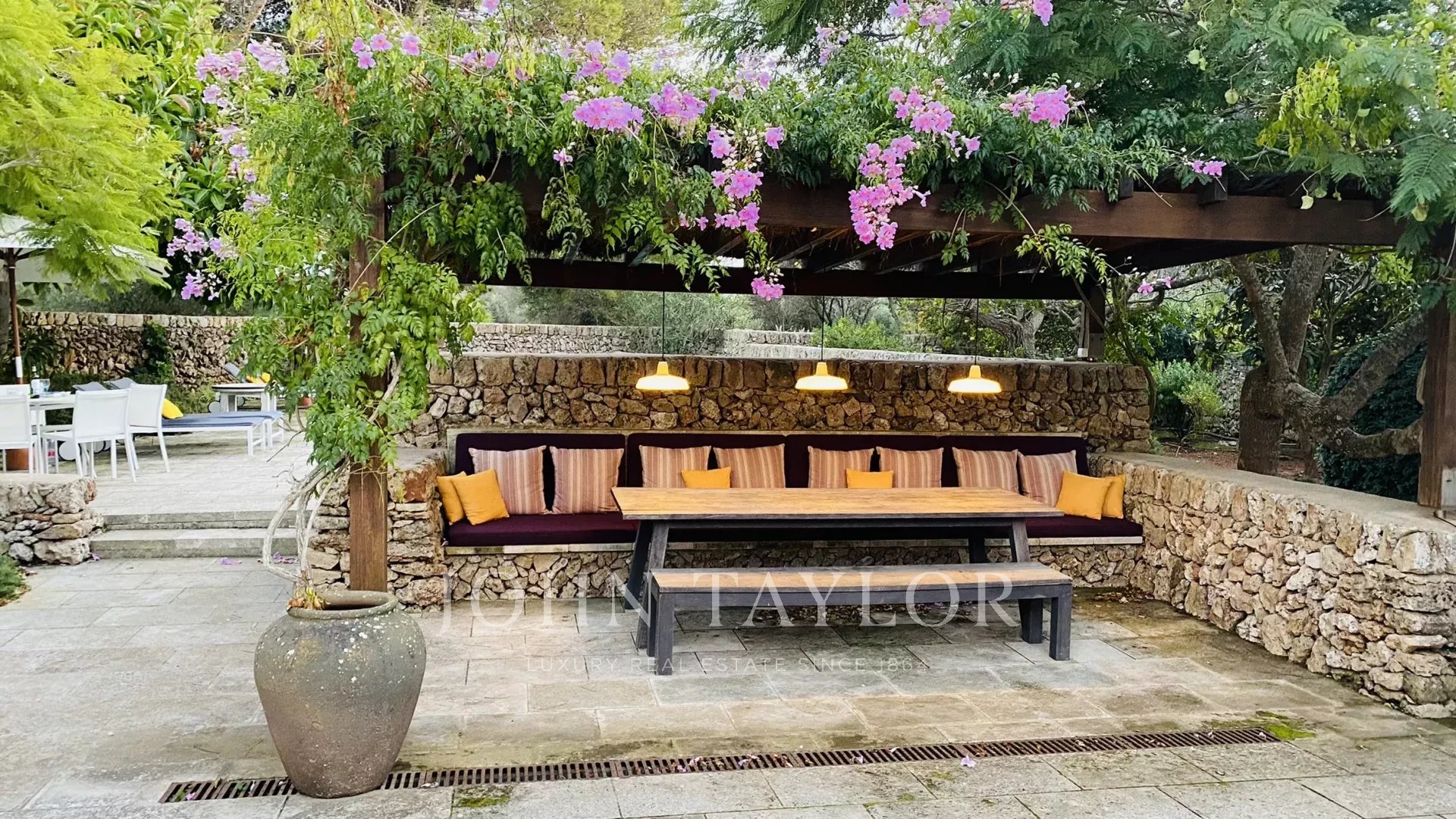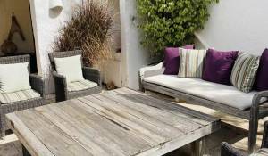 La propriété dispose de deux terrasses, l'une au bord de la piscine et l'autre devant la maison. La piscine, qui a été conçue, comporte des marches romaines d'un côté et est entourée d'un mur sec de l'autre. La terrasse devant la maison dispose d'une pergola avec une table et deux bancs pour les repas en plein air. Le hall d'entrée de la maison peut être transformé en porche couvert en ouvrant les grandes portes vitrées.