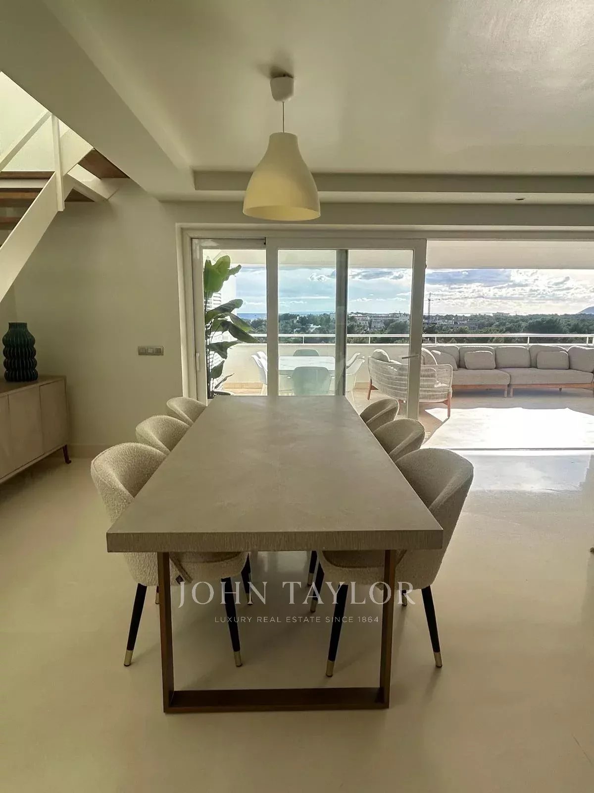 L’appartement dispose de 4 chambres et 3 salles de bains, offrant confort et espace pour toute la famille. La terrasse et le solarium permettent de profiter du climat d’Ibiza et de la vue sur la mer ; ce dernier est équipé d’un jacuzzi privé, idéal pour se détendre. La cuisine entièrement équipée et la buanderie facilitent le quotidien, et le bien est livré entièrement meublé, prêt à emménager.