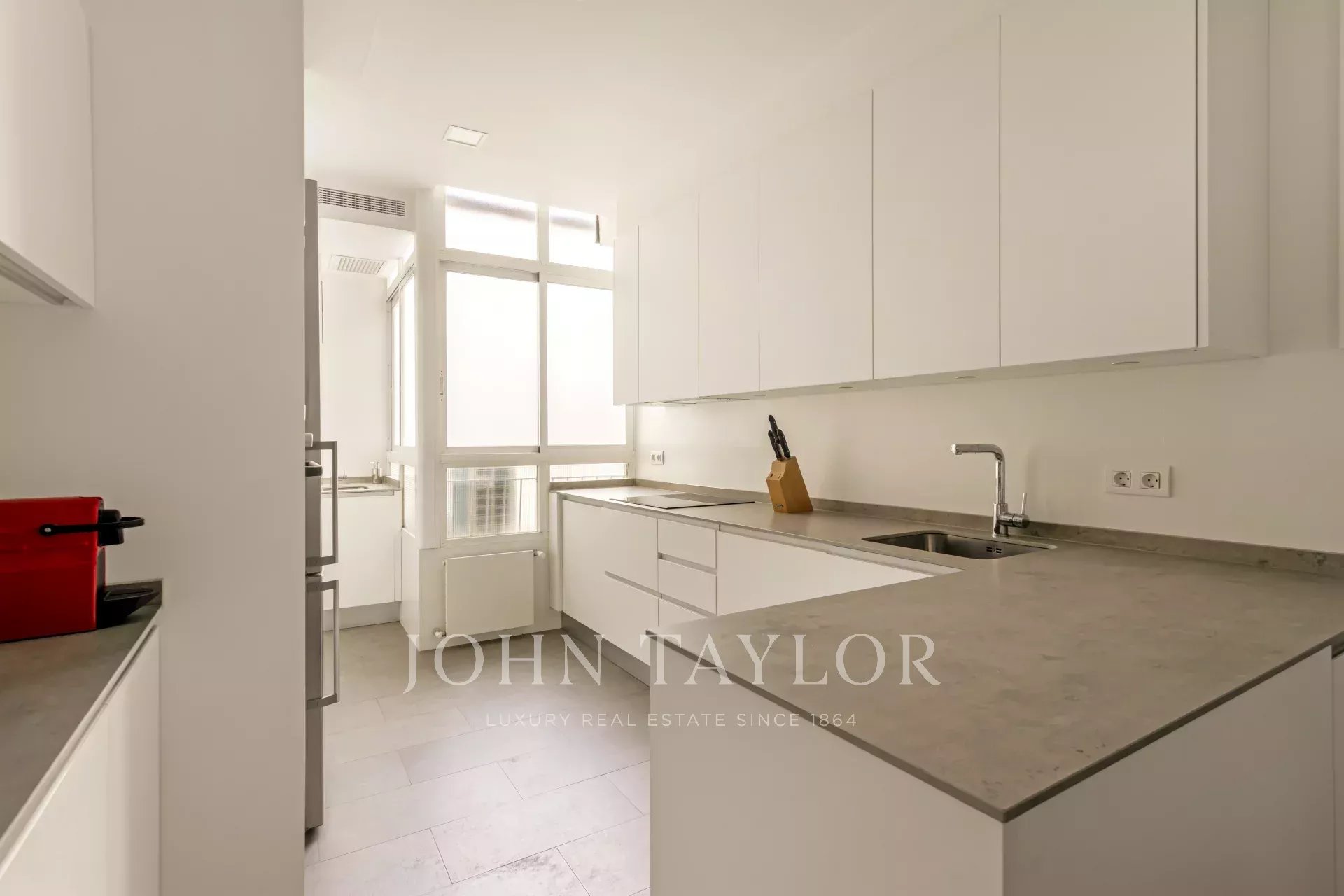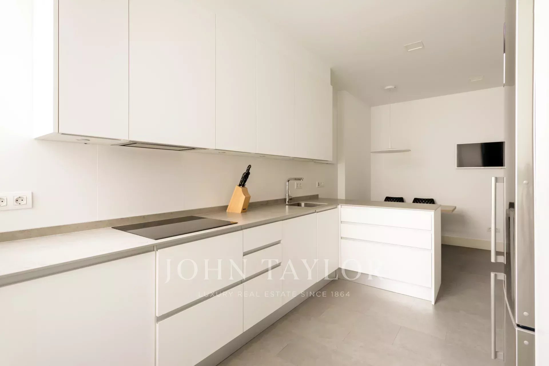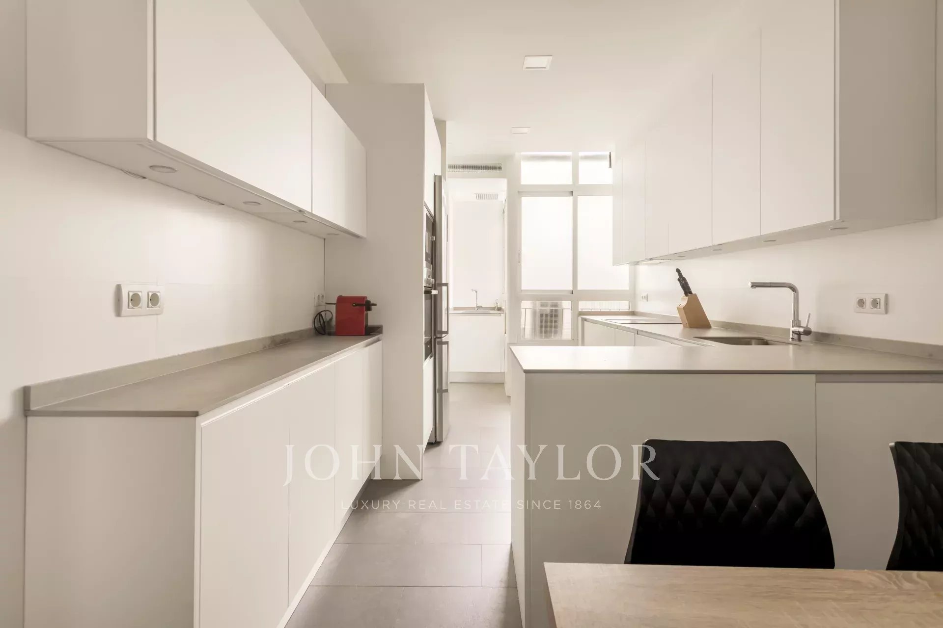 Une cuisine spacieuse et confortable équipée de tous les appareils électroménagers haut de gamme, ainsi qu'une buanderie et un garde-manger complètent l'aménagement de cet appartement luxueux.