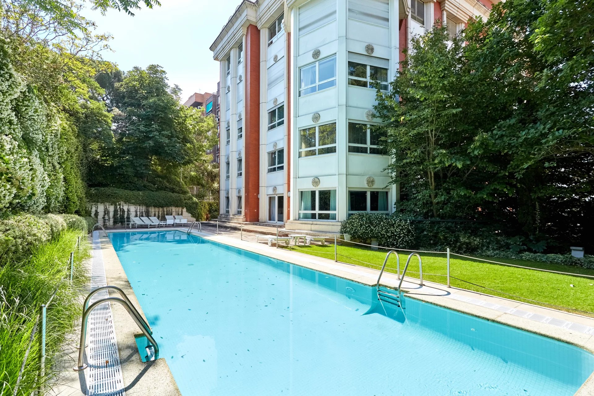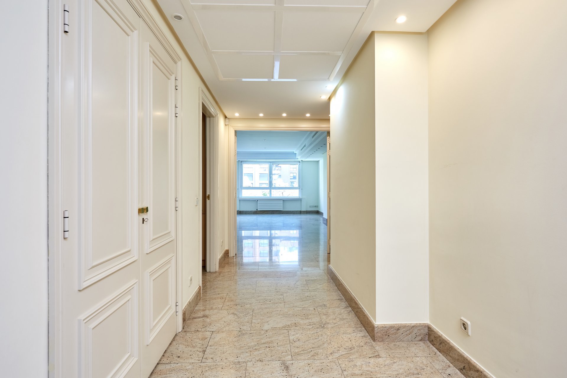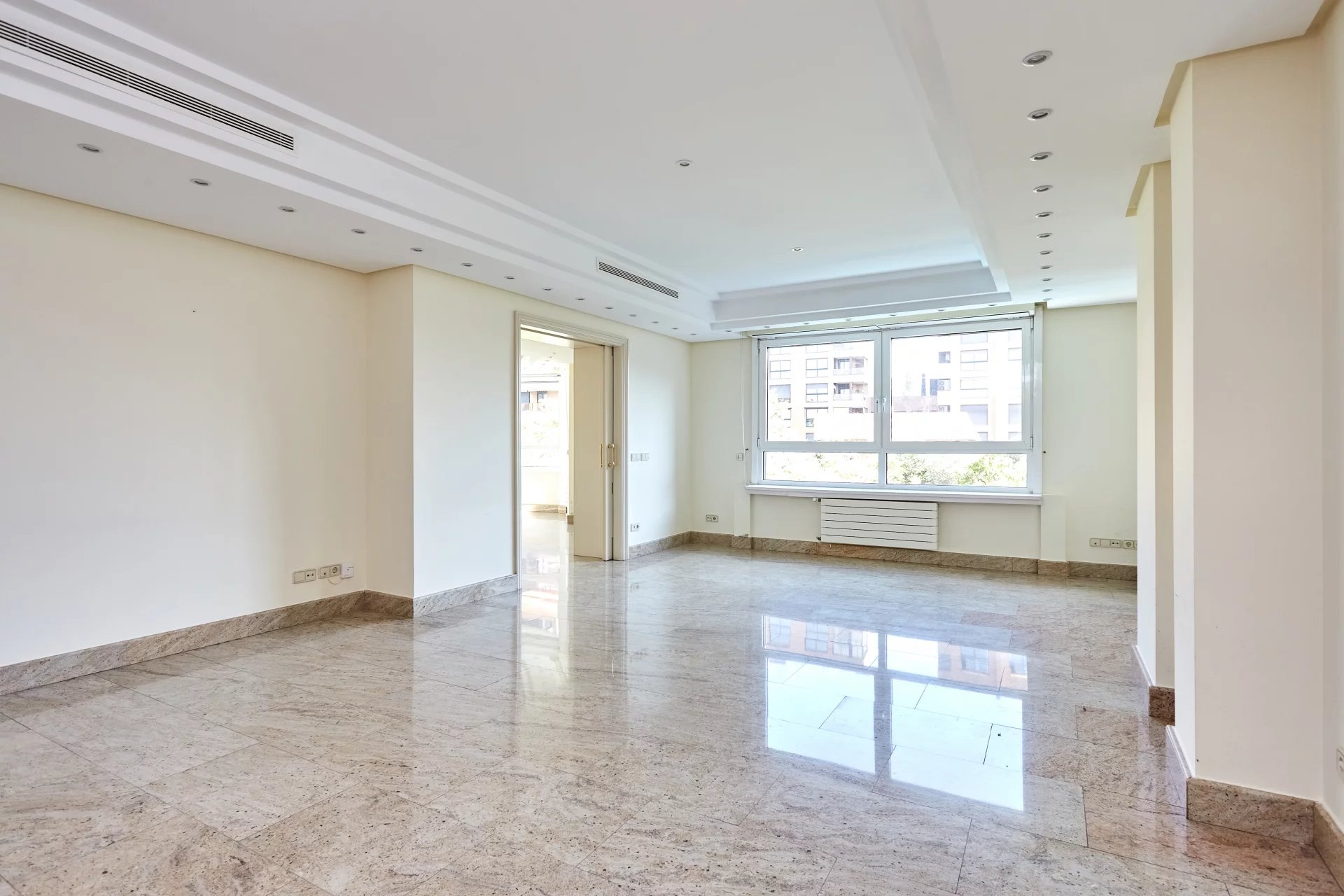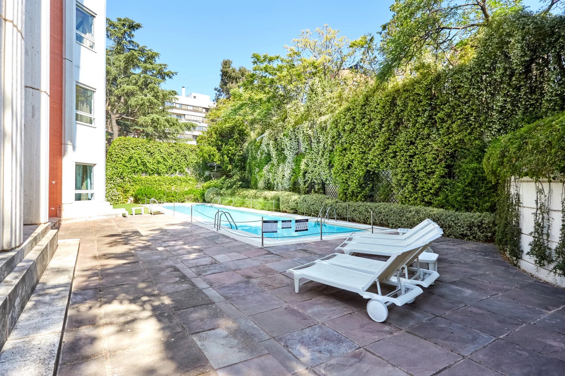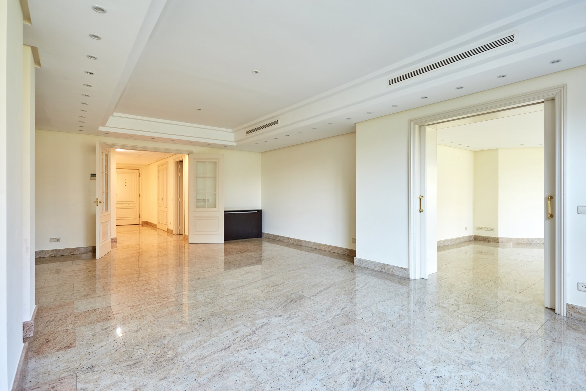 La propriété, située au quatrième étage, est accessible par un grand hall d'entrée, qui mène à un salon et une salle à manger spacieux, tous deux dotés de grandes fenêtres donnant sur le jardin, la piscine et un grand espace vert. À côté du hall d'entrée se trouvent des toilettes pour les invités. L'appartement dispose d'une grande cuisine (avec un bureau séparé) et d'une zone de service complète avec un accès indépendant.