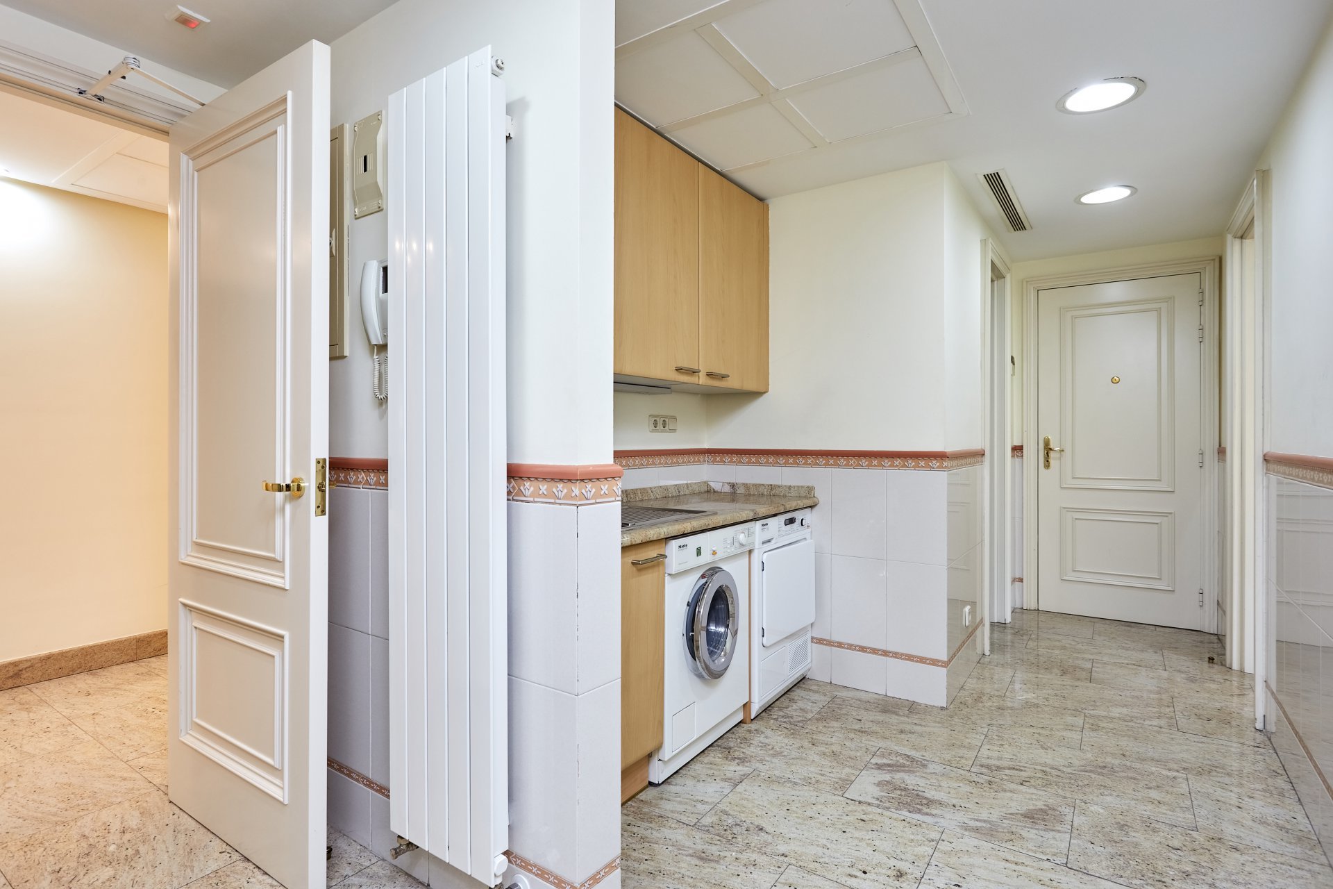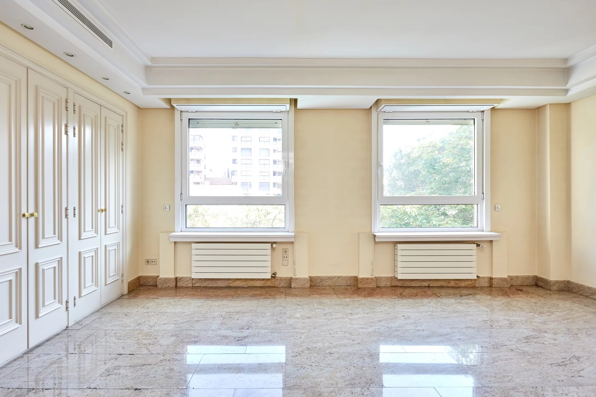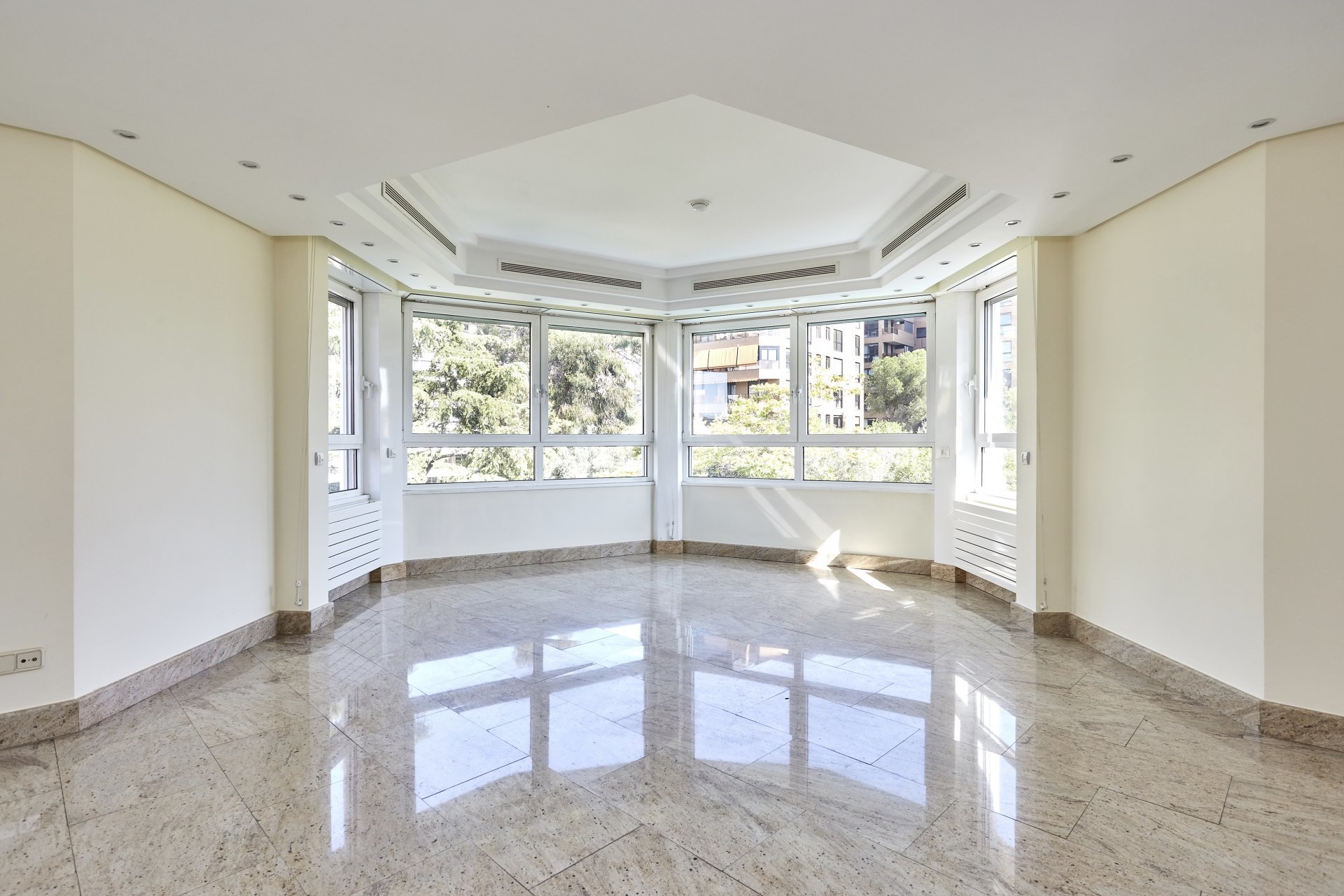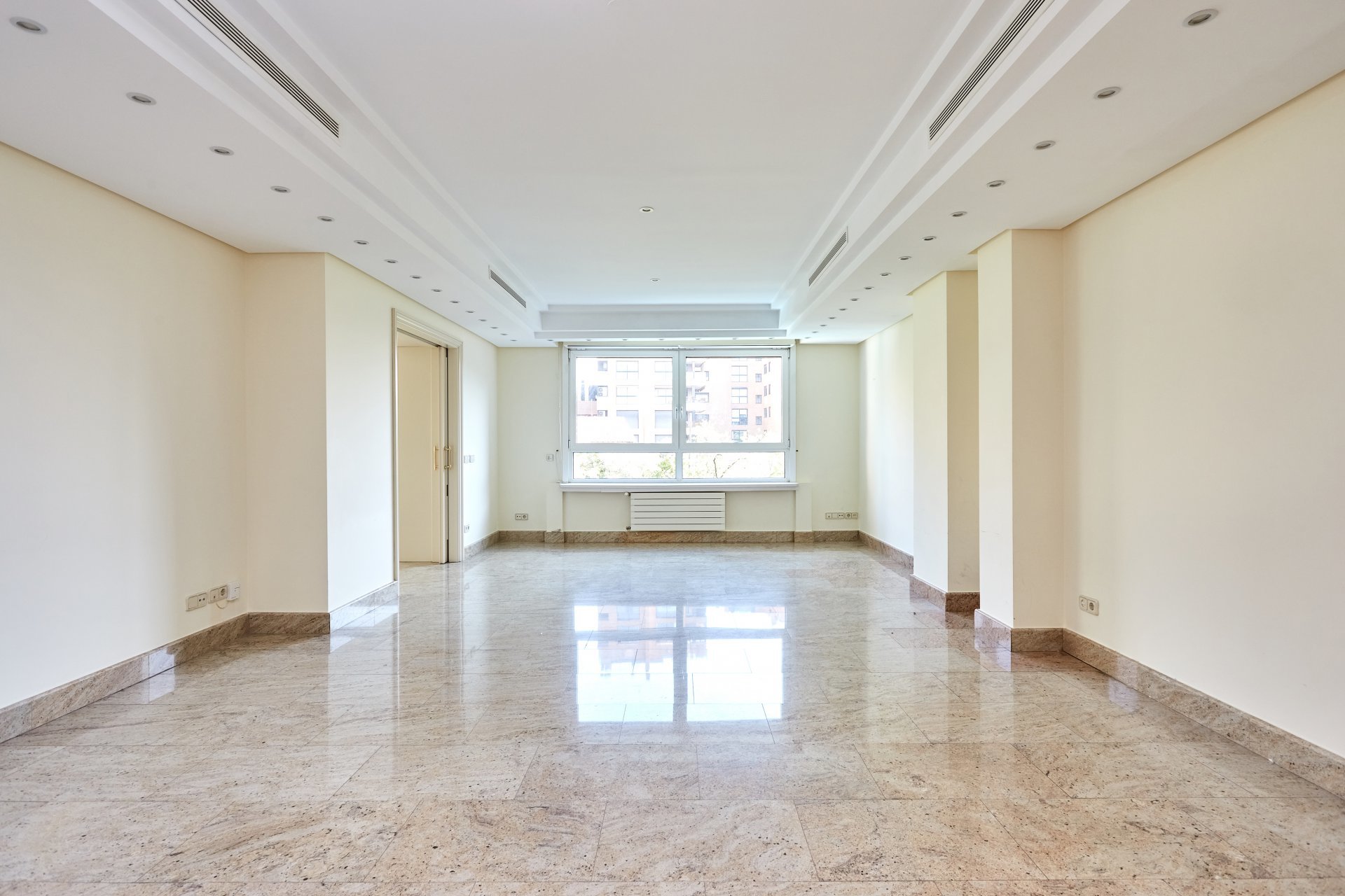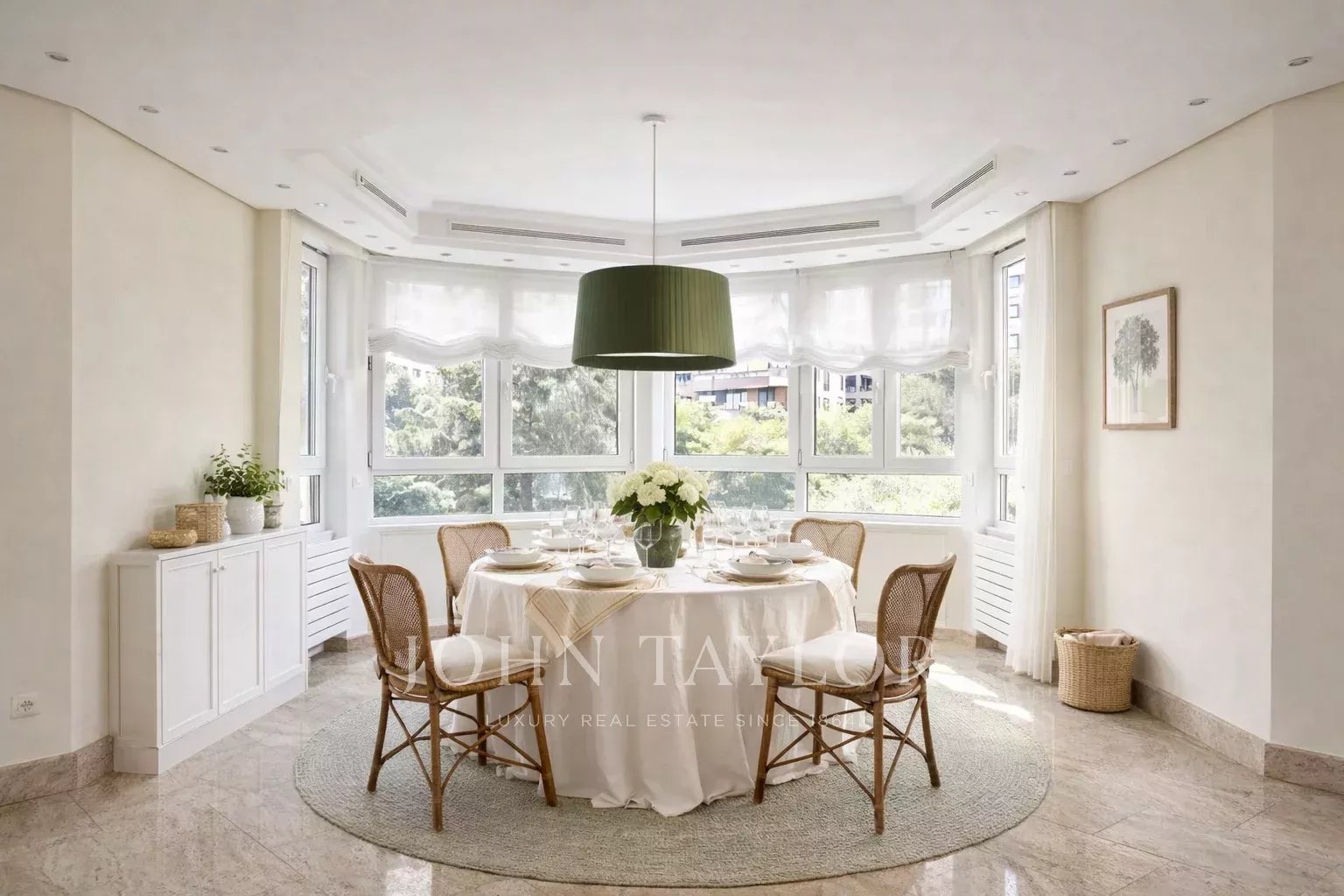 La propriété, située au quatrième étage, est accessible par un grand hall d'entrée, qui mène à un salon et une salle à manger spacieux, tous deux dotés de grandes fenêtres donnant sur le jardin, la piscine et un grand espace vert. À côté du hall d'entrée se trouvent des toilettes pour les invités. L'appartement dispose d'une grande cuisine (avec un bureau séparé) et d'une zone de service complète avec un accès indépendant.