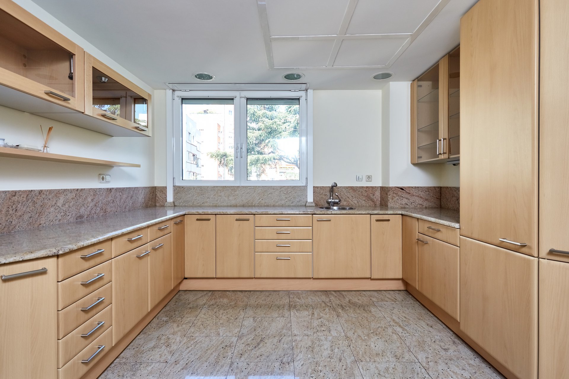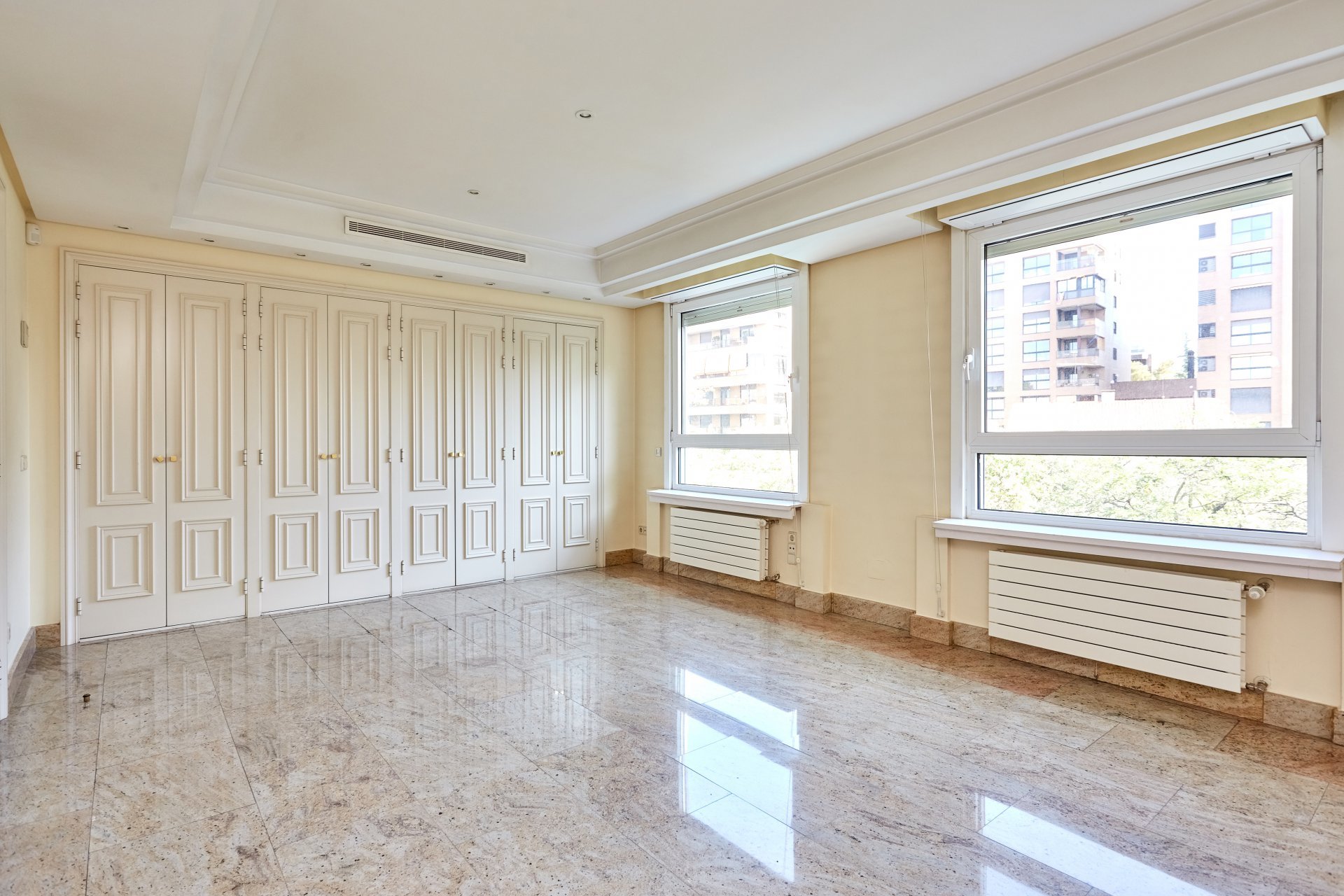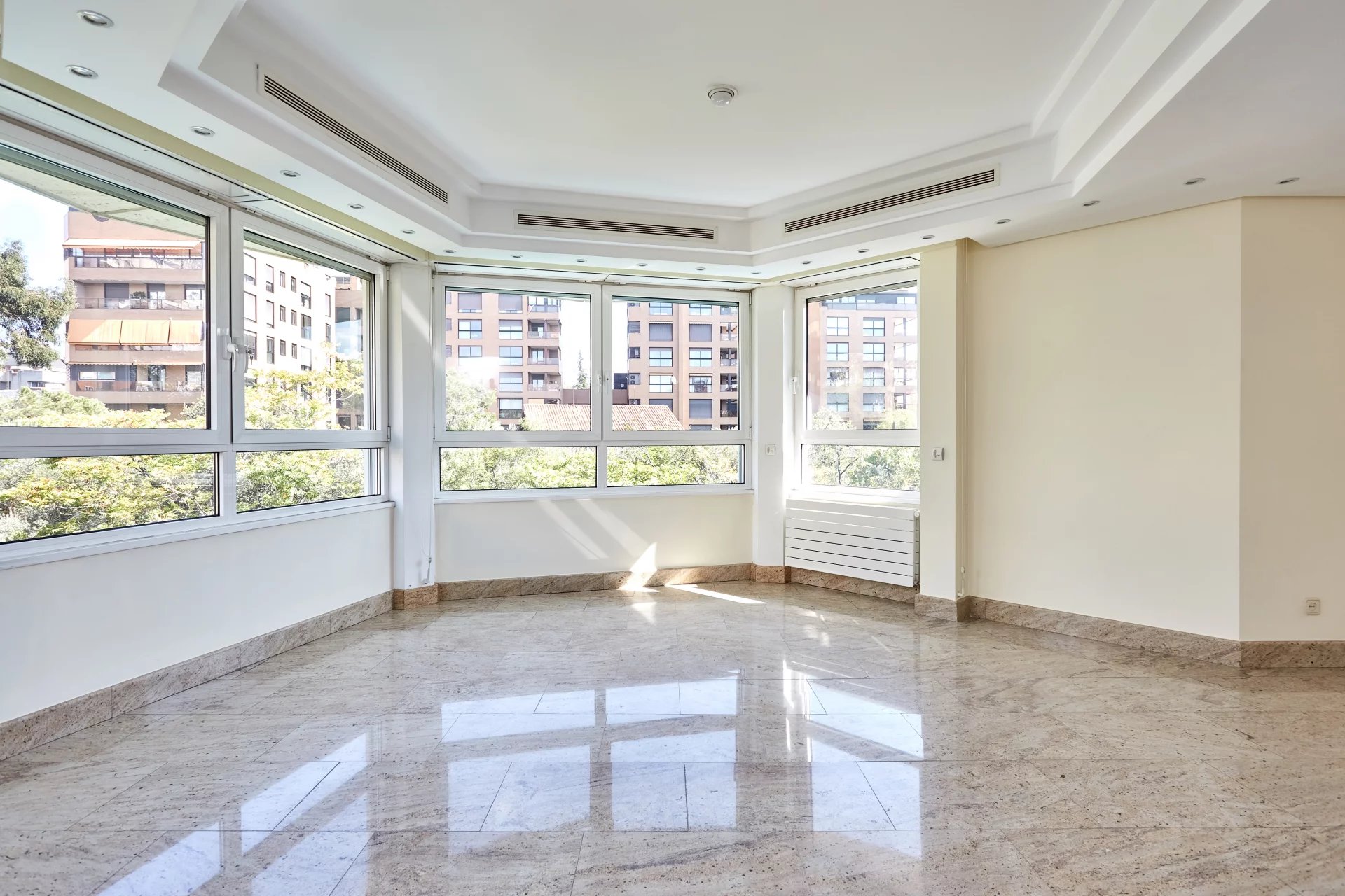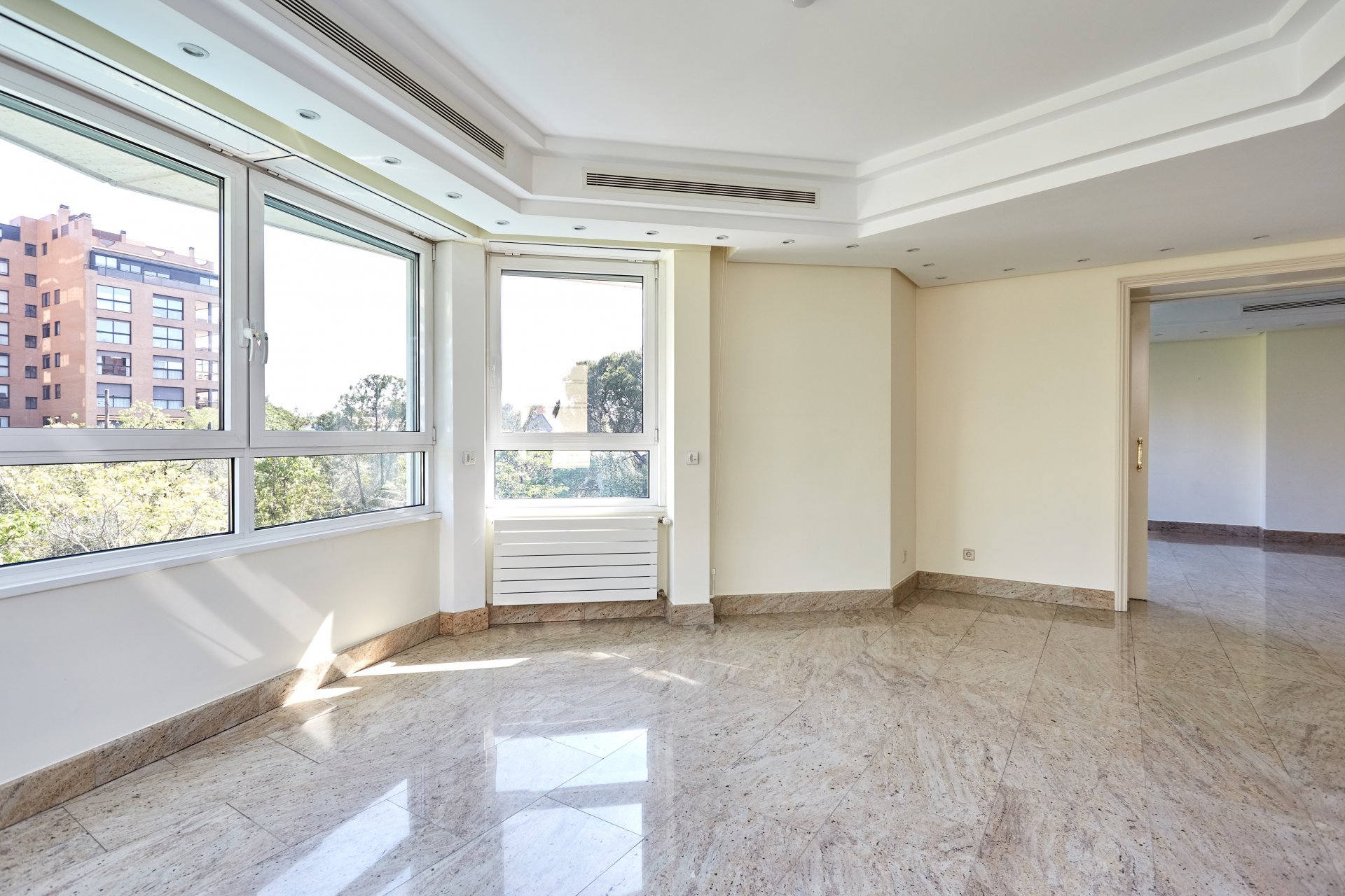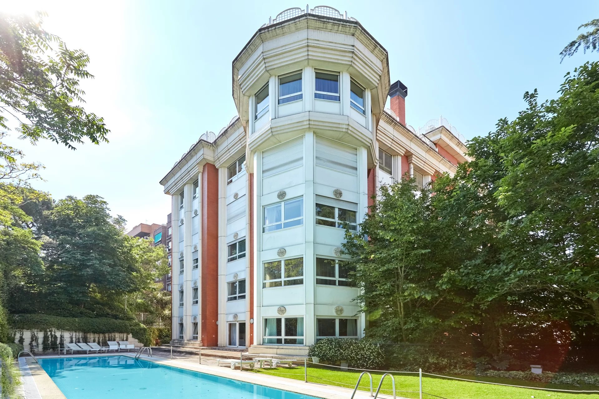 La propriété, située au quatrième étage, est accessible par un grand hall d'entrée, qui mène à un salon et une salle à manger spacieux, tous deux dotés de grandes fenêtres donnant sur le jardin, la piscine et un grand espace vert. À côté du hall d'entrée se trouvent des toilettes pour les invités. L'appartement dispose d'une grande cuisine (avec un bureau séparé) et d'une zone de service complète avec un accès indépendant.