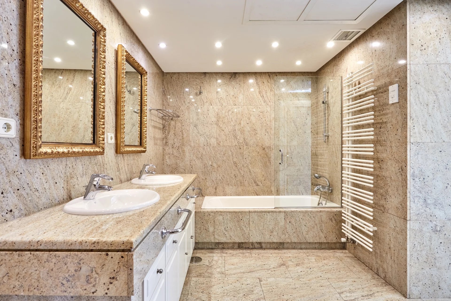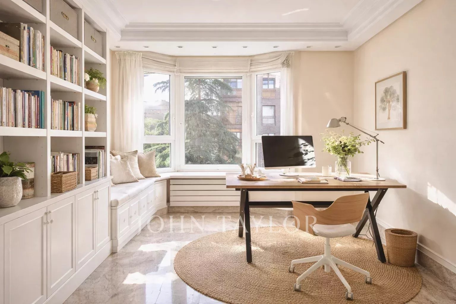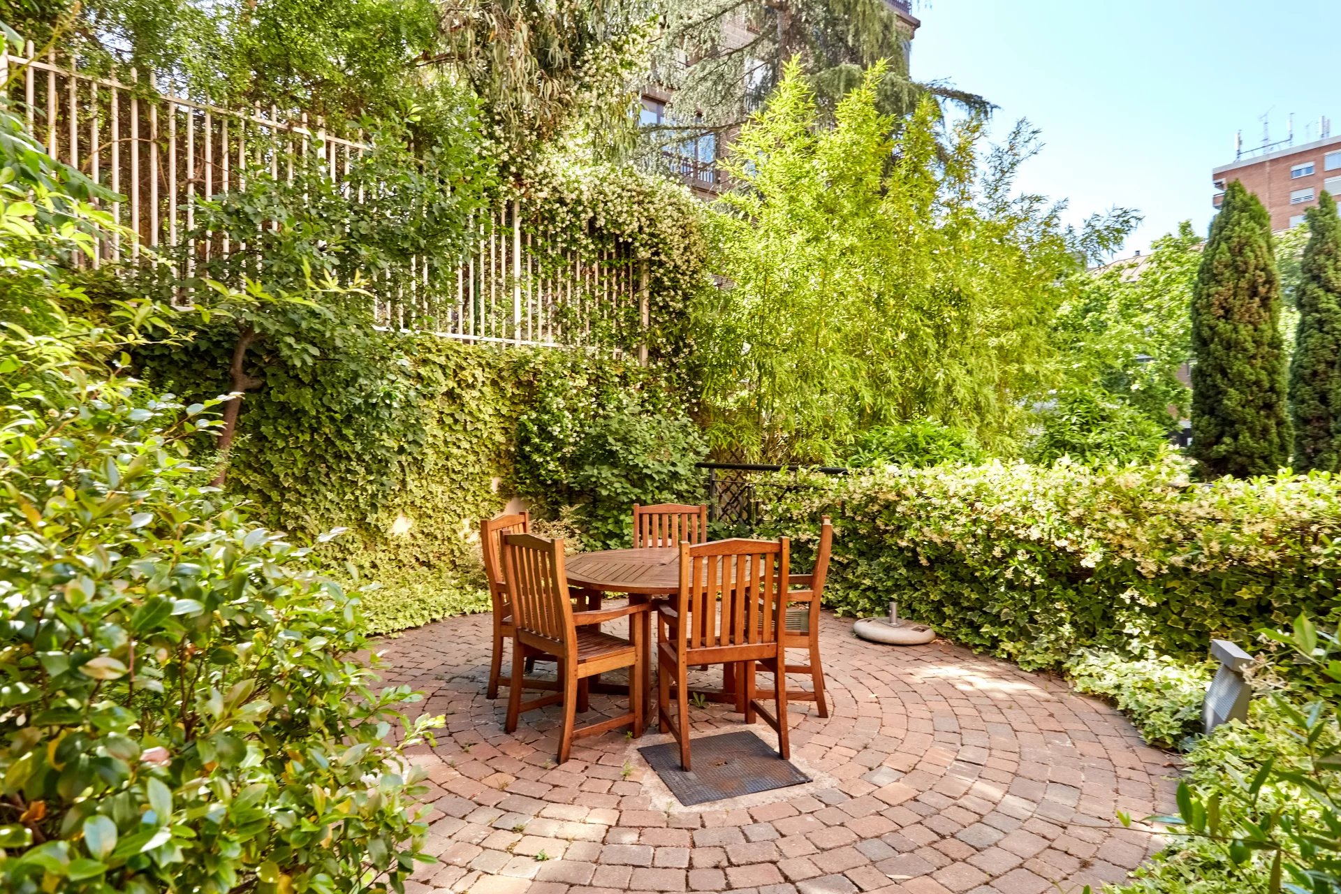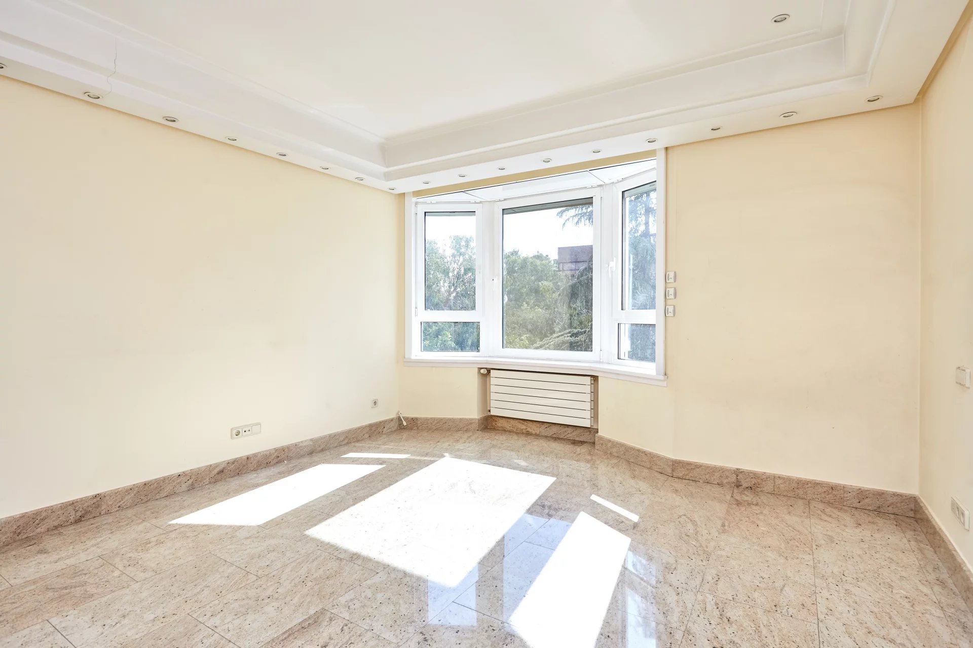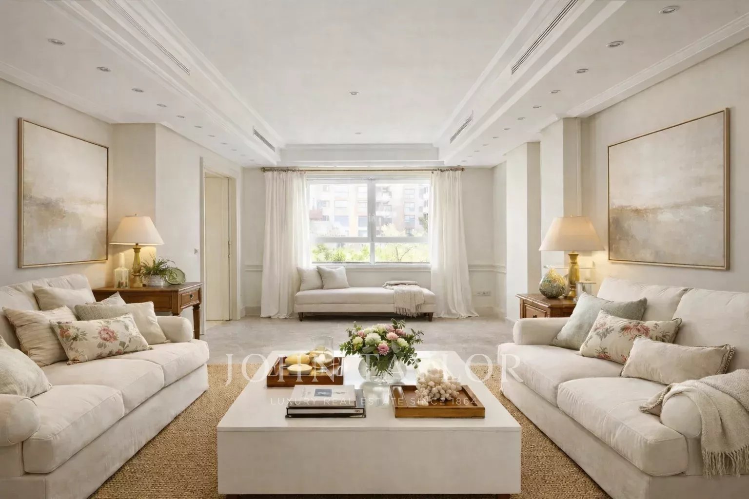 La propriété, située au quatrième étage, est accessible par un grand hall d'entrée, qui mène à un salon et une salle à manger spacieux, tous deux dotés de grandes fenêtres donnant sur le jardin, la piscine et un grand espace vert. À côté du hall d'entrée se trouvent des toilettes pour les invités. L'appartement dispose d'une grande cuisine (avec un bureau séparé) et d'une zone de service complète avec un accès indépendant.