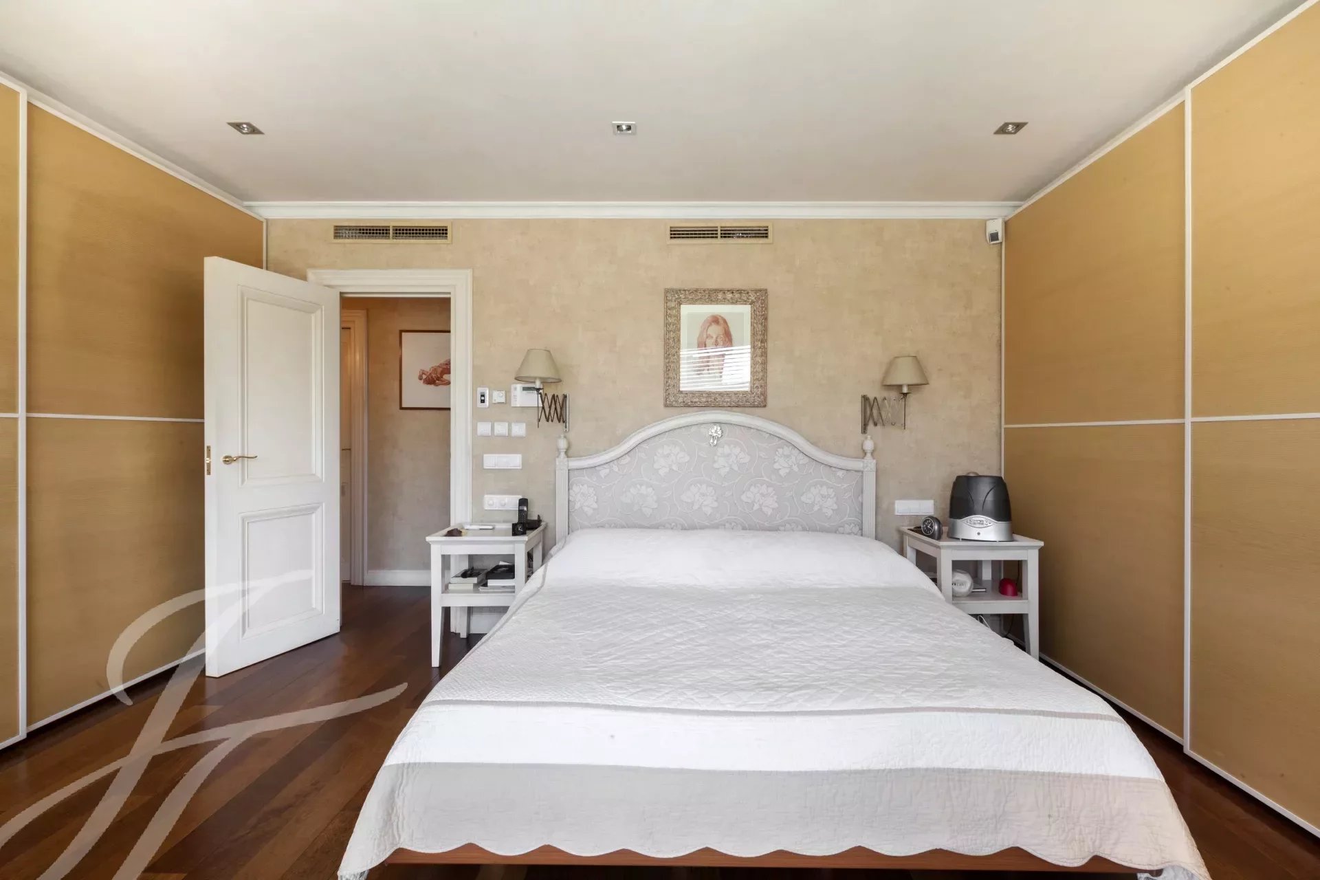 Depuis la cuisine, on accède au hall d'entrée où se trouvent également des toilettes pour les invités. Un couloir longe la cage d'escalier et distribue les portes des différentes chambres, toutes très grandes et dotées de salles de bains et de dressings. L'immense chambre principale se compose de la chambre elle-même, d'un dressing, d'une grande salle de bains en-suite et d'une chambre supplémentaire ou d'un bureau avec salle de bains en-suite. En poursuivant l'escalier, on trouve une autre chambre avec salle de bains en suite, et les deux autres chambres qui partagent un salon ou un bureau et qui disposent chacune d'un dressing et d'une salle de bains en suite, complètent l'étage.