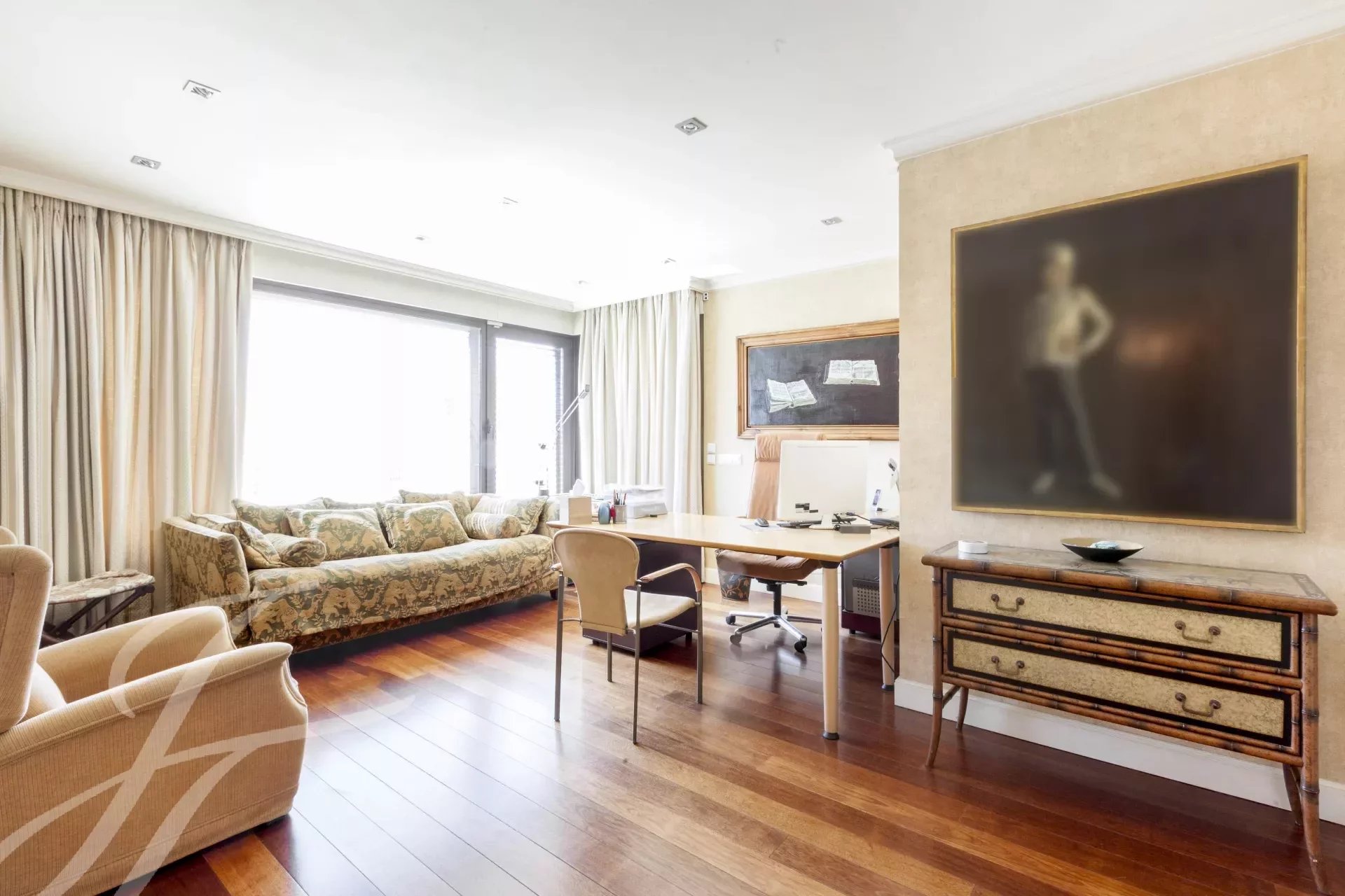 Ce magnifique duplex à louer impressionne dès son entrée, avec un grand hall d'entrée, tant par sa taille que par sa hauteur de près de 6 mètres, couronné par un puits de lumière qui lui confère une grande luminosité.