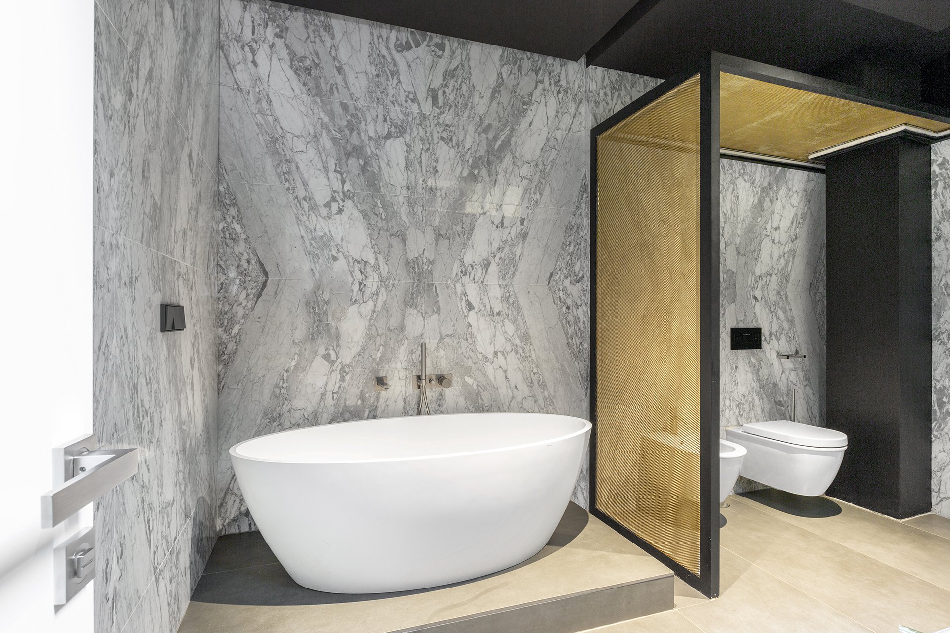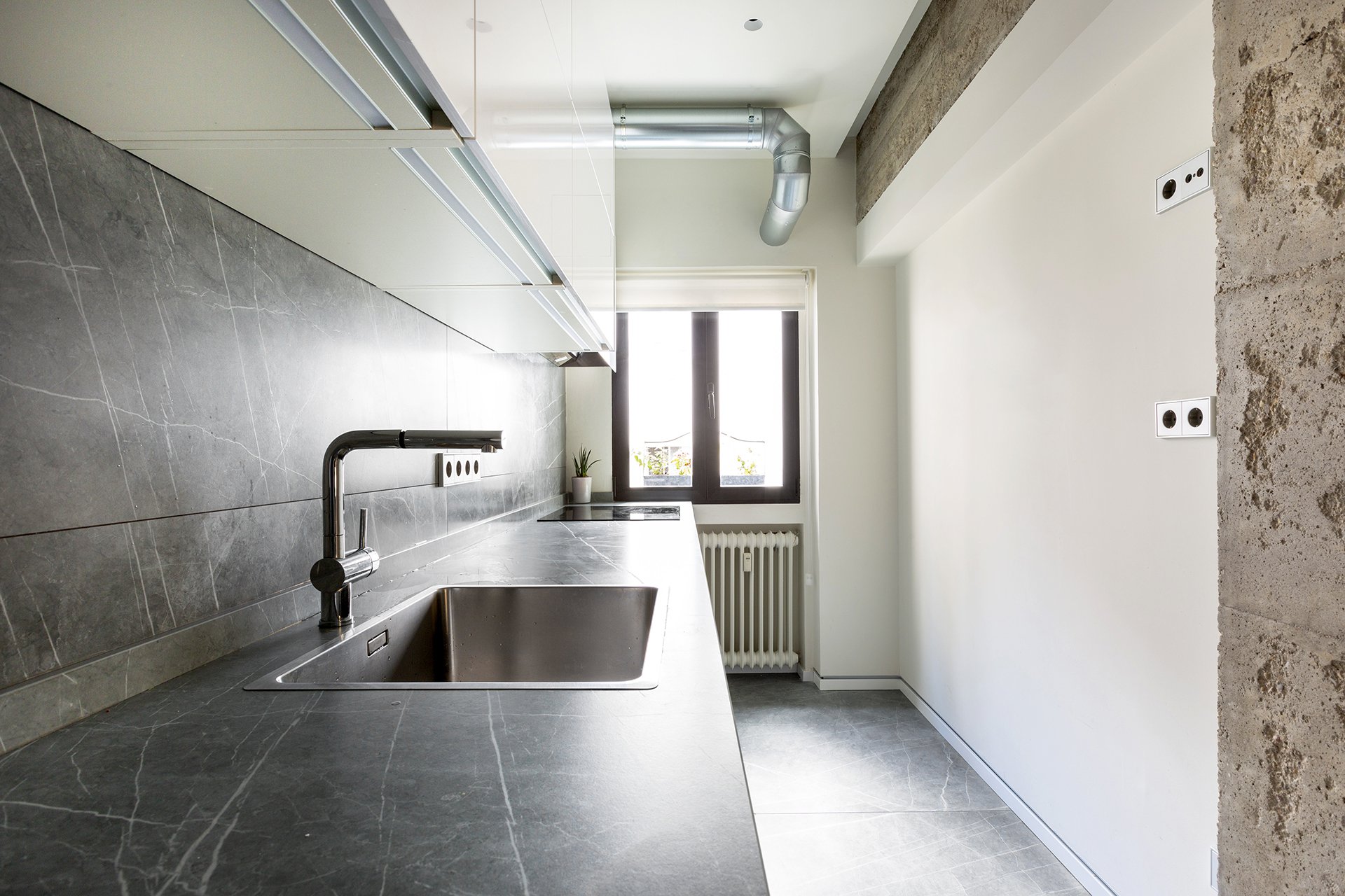 À côté de la cuisine, entièrement équipée d'appareils électroménagers de haute qualité, se trouve une chambre de service avec sa propre salle de bains et une entrée séparée. Le grand salon/salle à manger peut être rendu indépendant grâce à des cloisons coulissantes en tôle micro-perforée et a également accès à la terrasse orientée à l'ouest par une grande fenêtre.
