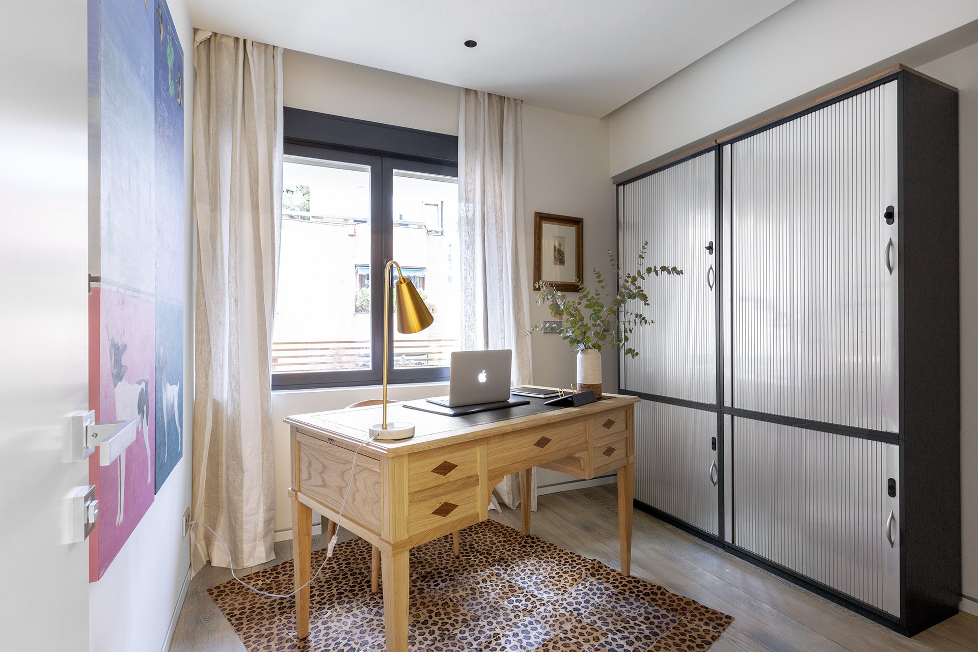 Il dispose d'une grande chambre principale avec fenêtre sur la rue, d'un dressing et d'une belle et grande salle de bains avec baignoire et douche. Une autre chambre avec deux lits pliants et une grande table de travail. Il y a également une autre chambre avec des armoires encastrées et une autre pour les invités qui pourrait être utilisée comme bureau, salle de jeux, etc. Ces chambres partagent une magnifique salle de bains.