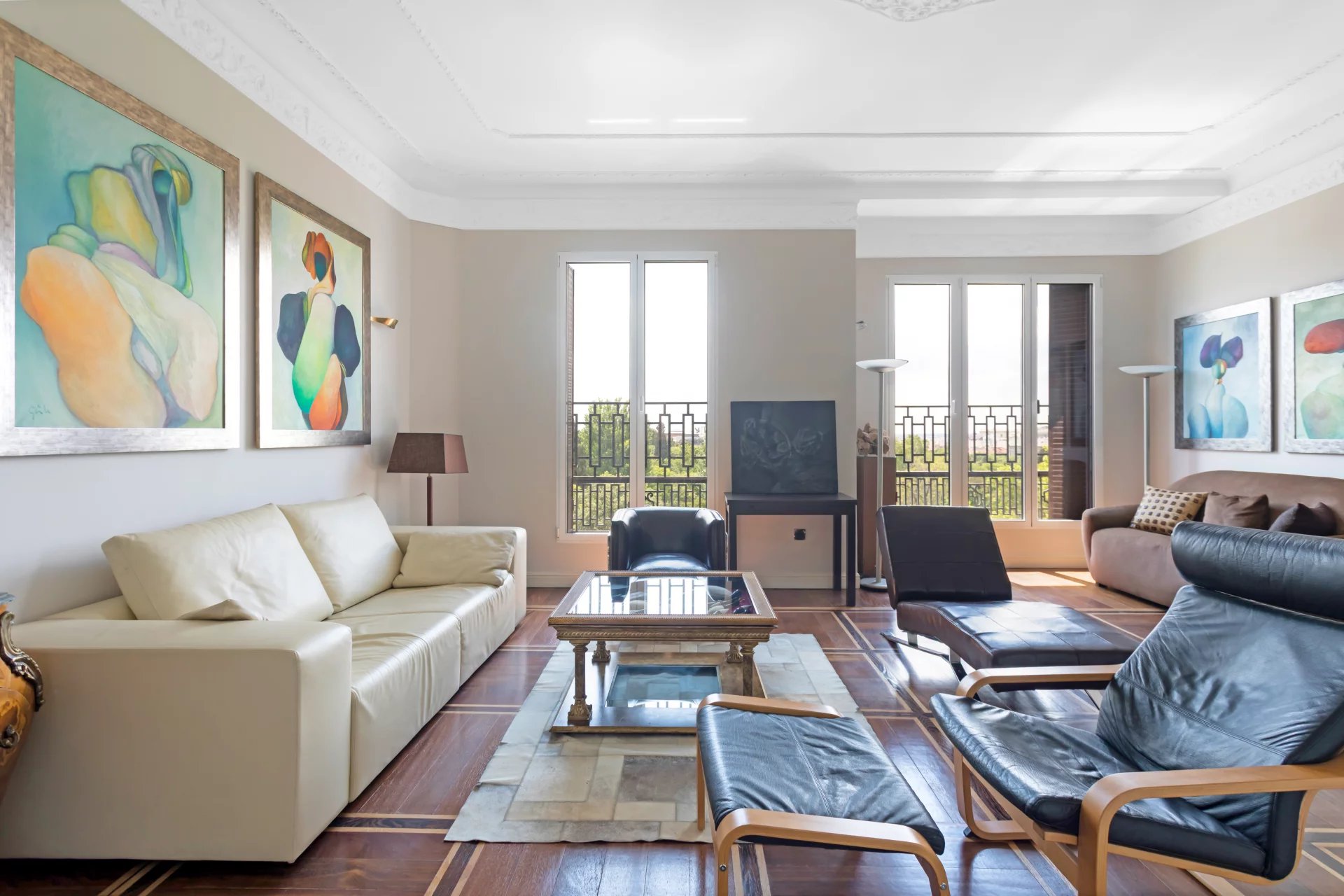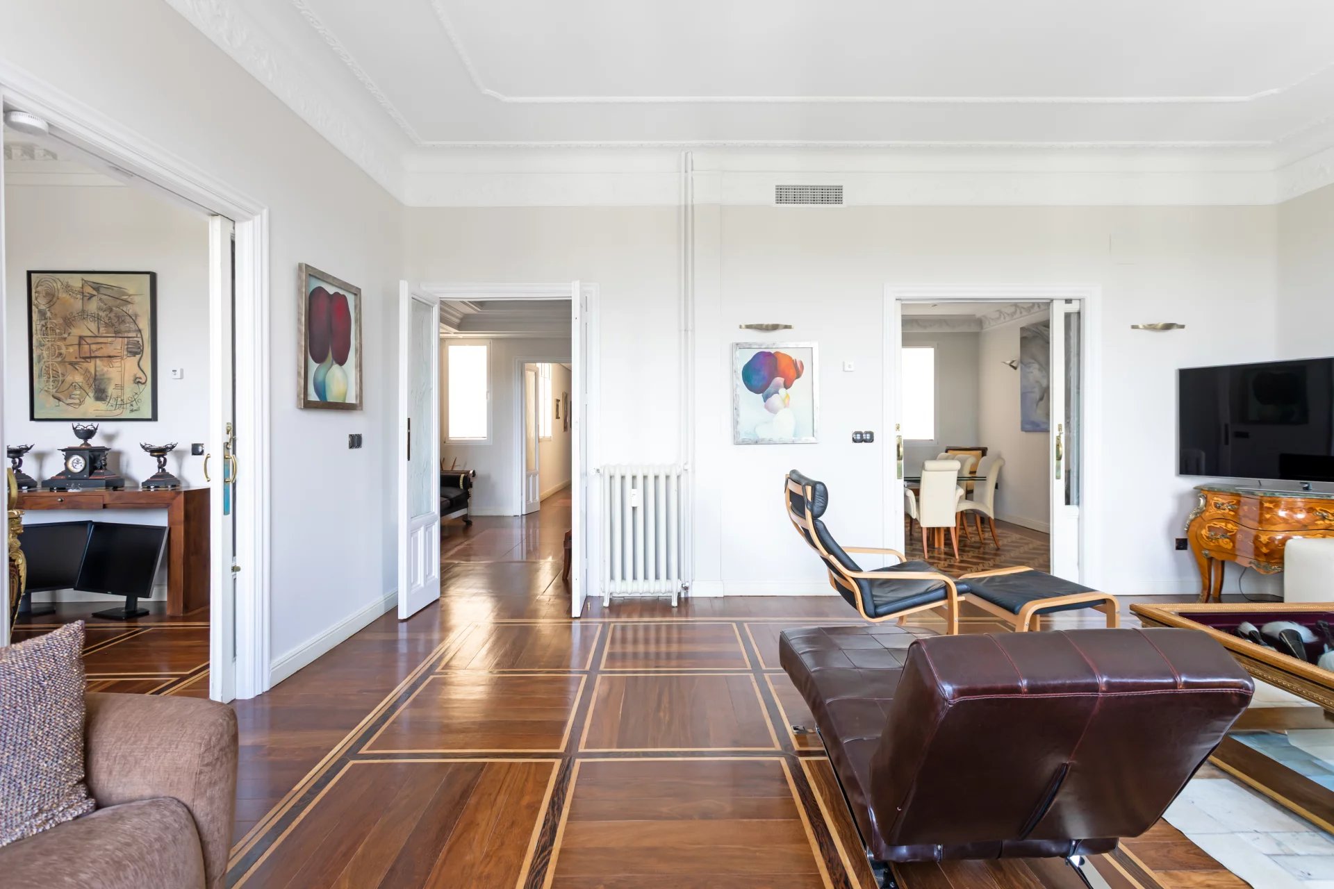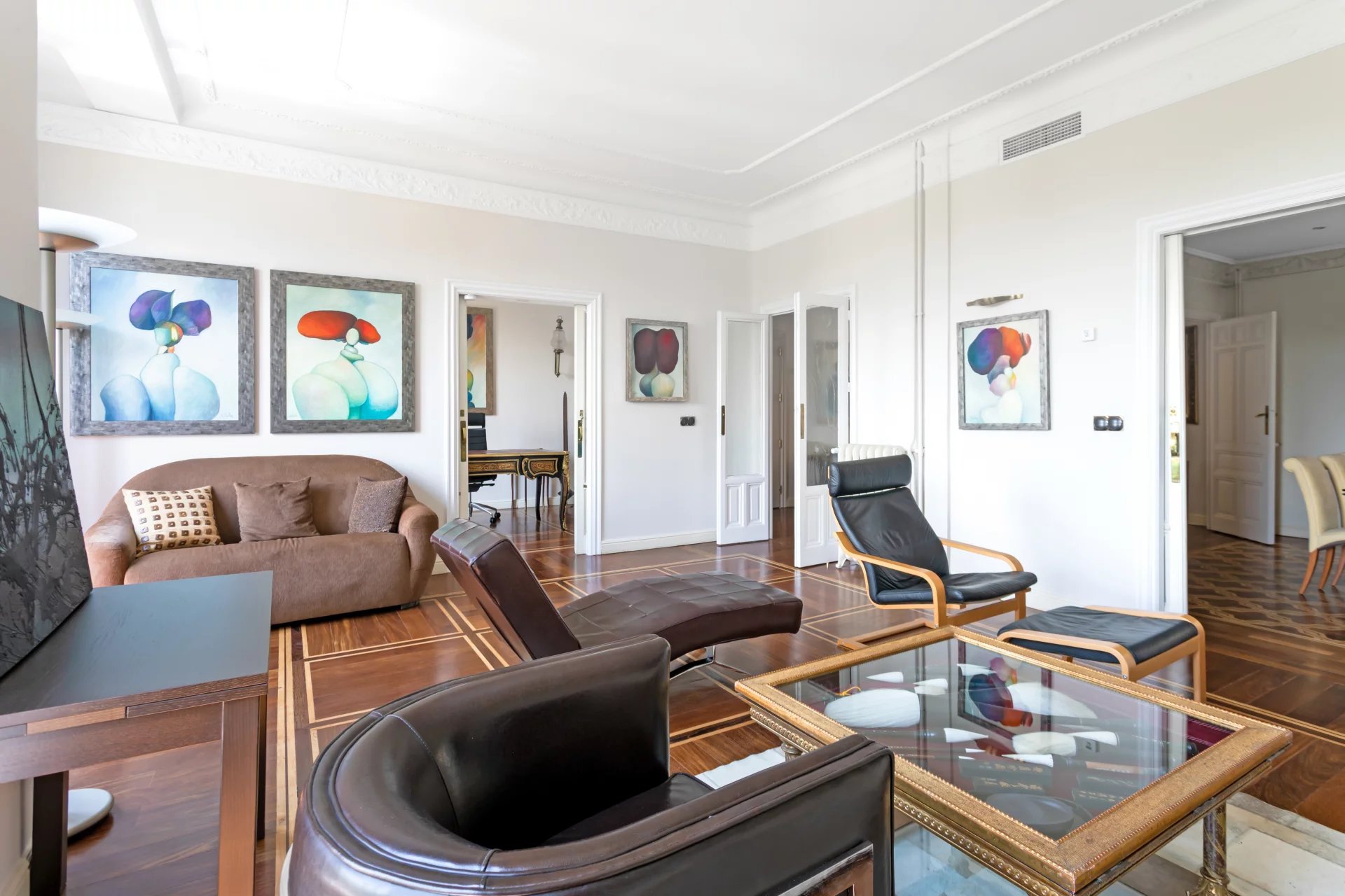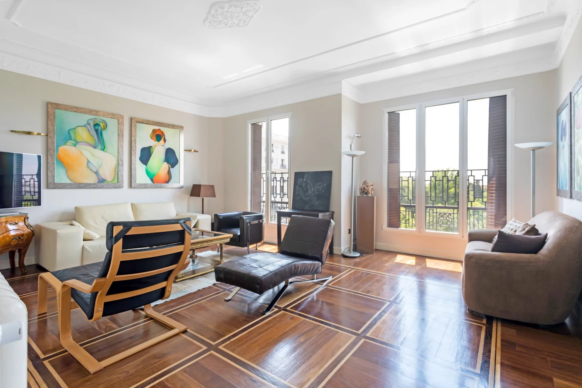 Le double salon et le bureau sont baignés de lumière naturelle grâce aux trois balcons qui offrent des vues uniques sur le jardin botanique et l'orientation sud.