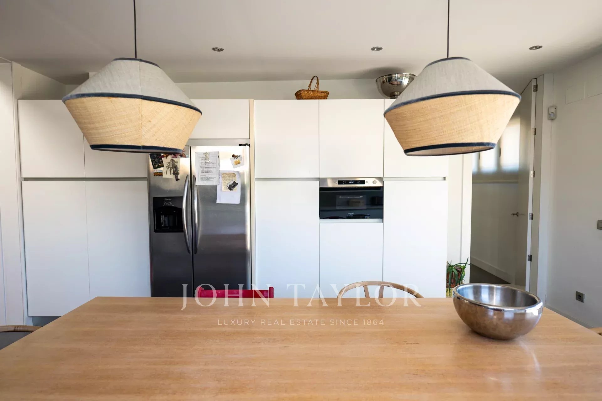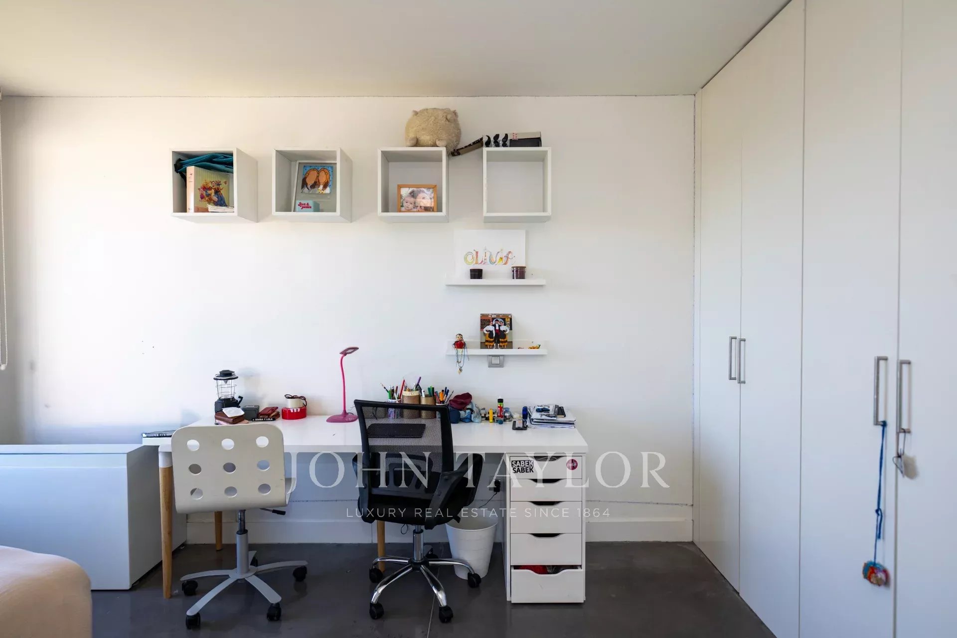Au premier étage se trouve un grand espace de vie avec ventilation transversale qui pourrait facilement être converti en chambre à coucher. À côté, deux grandes chambres lumineuses, toutes deux dotées d'une salle de bains privative et d'armoires encastrées. Une immense terrasse avec vue sur la ligne d'horizon de Madrid complète cet espace de repos.