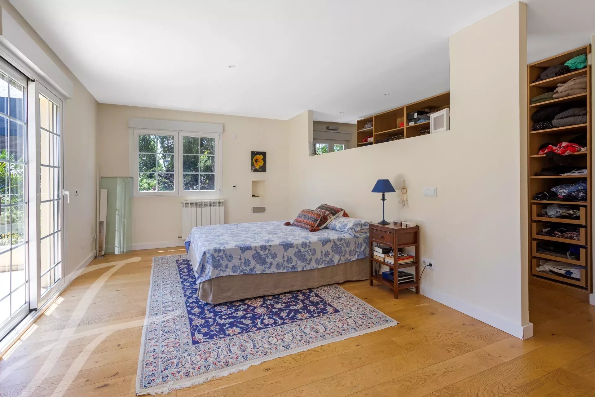 Au premier étage, la chambre principale avec salle de bains en suite, dressing et immense terrasse avec vue sur le jardin et la piscine. Dans la salle de bains, une baignoire de type Jacuzzi et une cabine de vapeur. Deux chambres supplémentaires avec salle de bains commune.