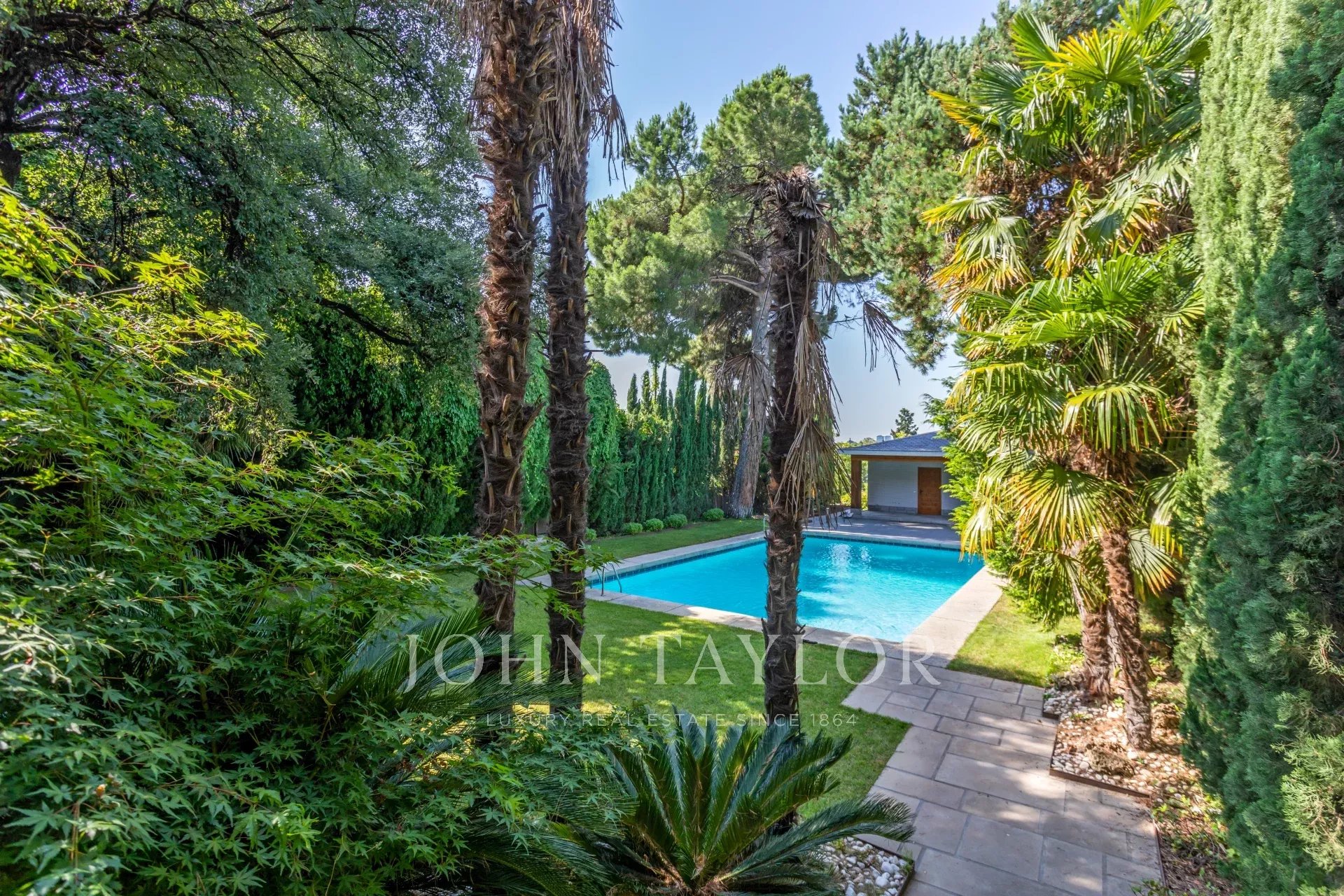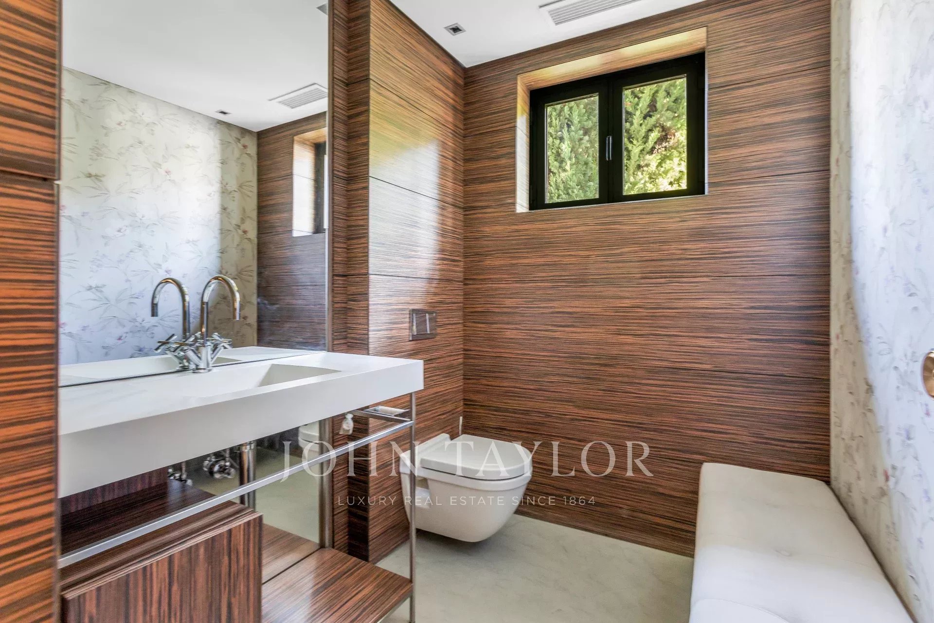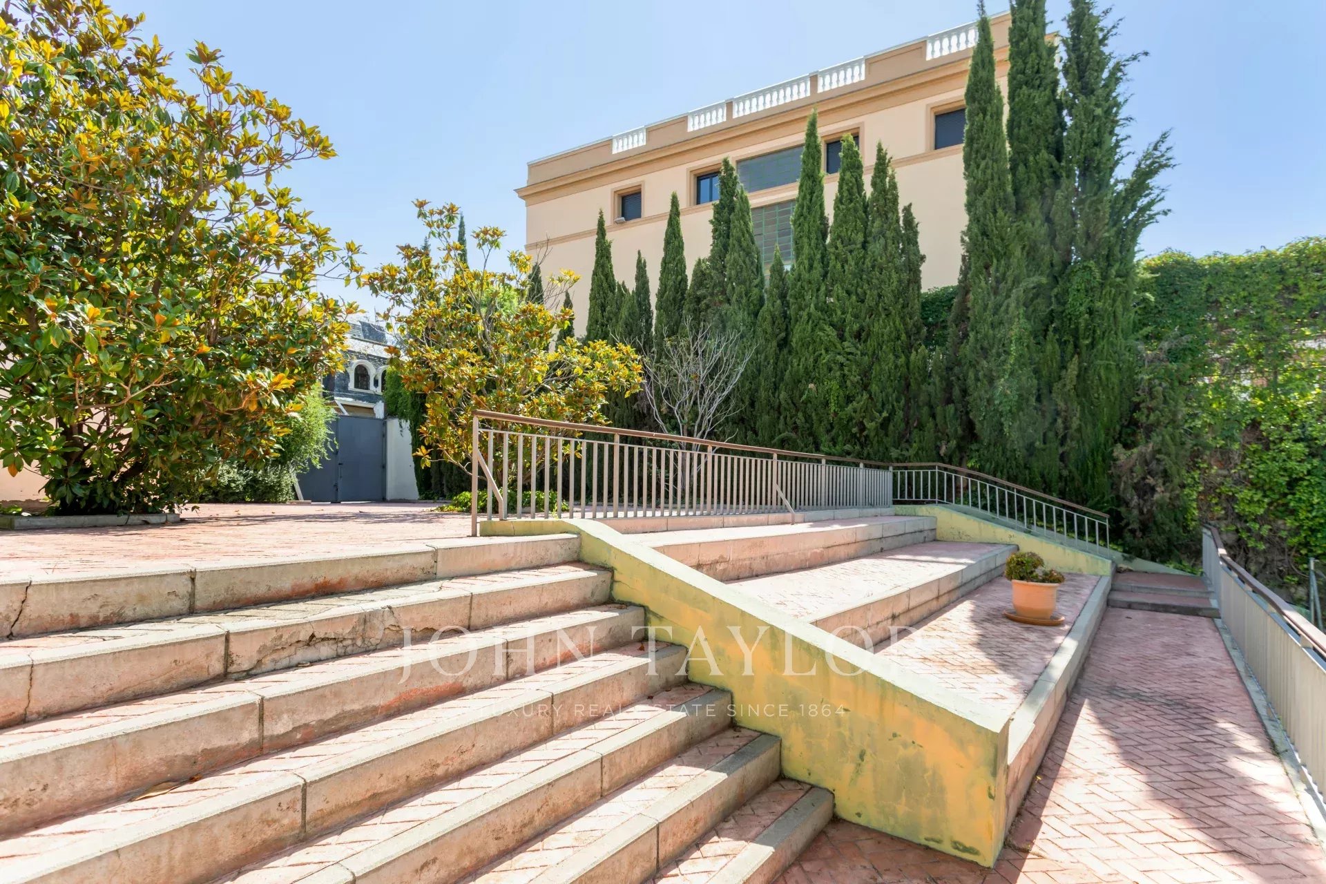 La maison principale d'une superficie de 850 m² est construite sur trois niveaux : un rez-de-chaussée avec accès direct au porche, un jardin sur deux niveaux avec un aménagement paysager consolidé. Cet étage dédié à l'espace social dispose d'un grand salon orienté plein sud, d'un salon, d'une bibliothèque, d'une salle à manger avec accès direct à l'espace cuisine et aux toilettes. Toilettes invités.