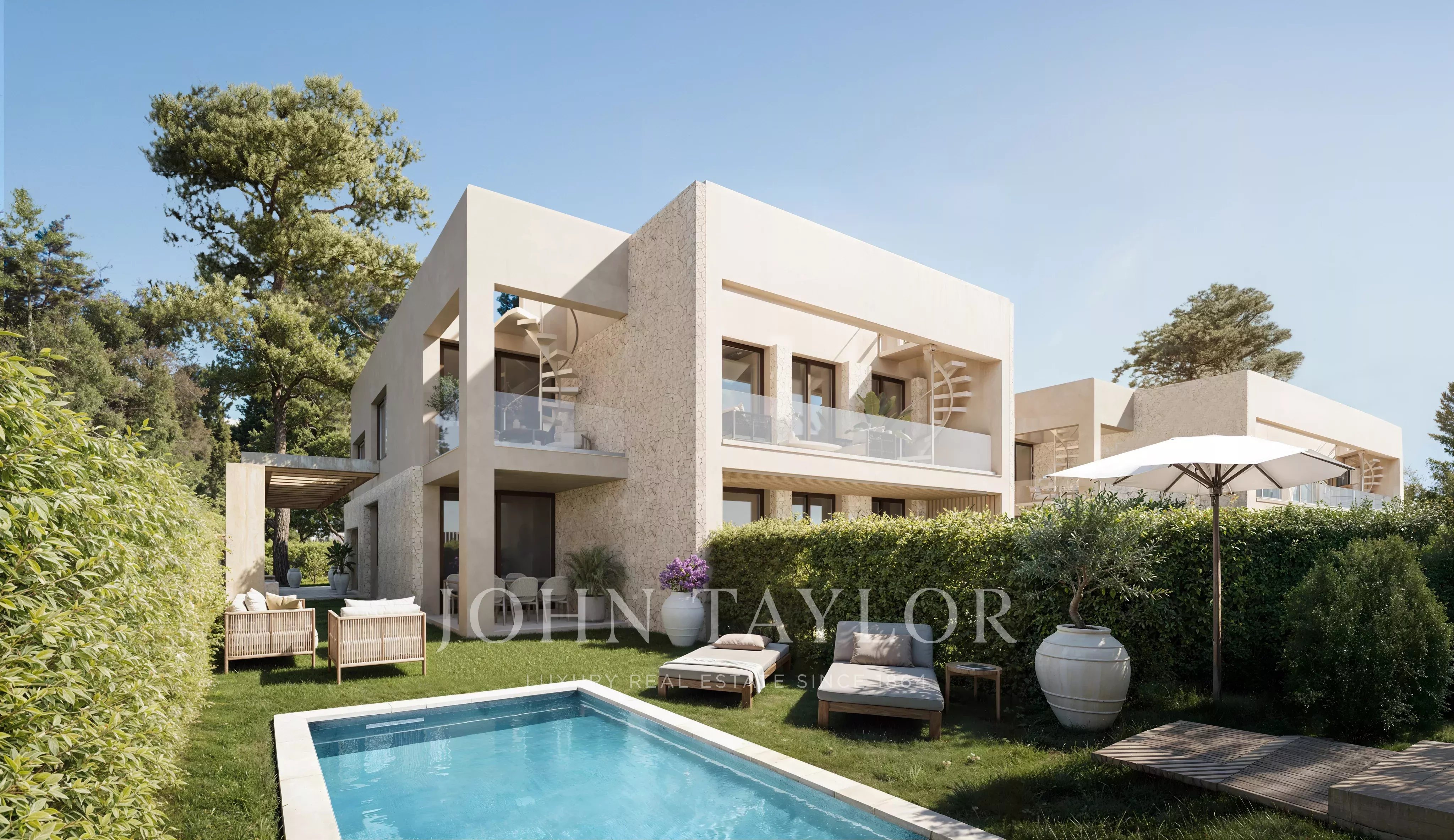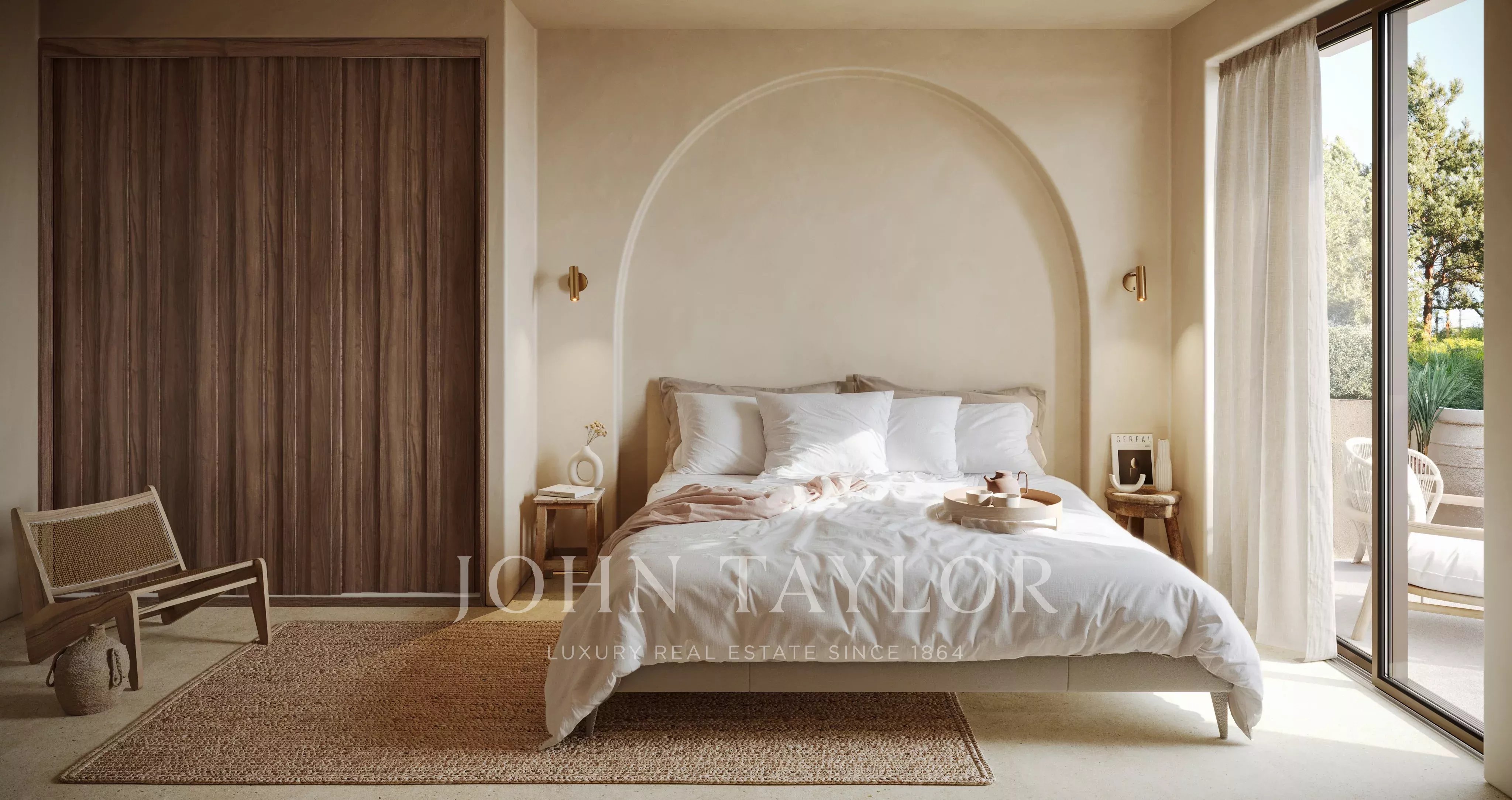 Chaque appartement dispose de 63 m² de surface intérieure, répartis en deux chambres et deux salles de bains, avec la chambre principale bénéficiant d’une salle de bains en suite. Les espaces intérieurs s’ouvrent naturellement sur des zones extérieures privées, et chaque logement comprend une piscine privée avec système de chloration saline, intégrée avec élégance dans le projet.