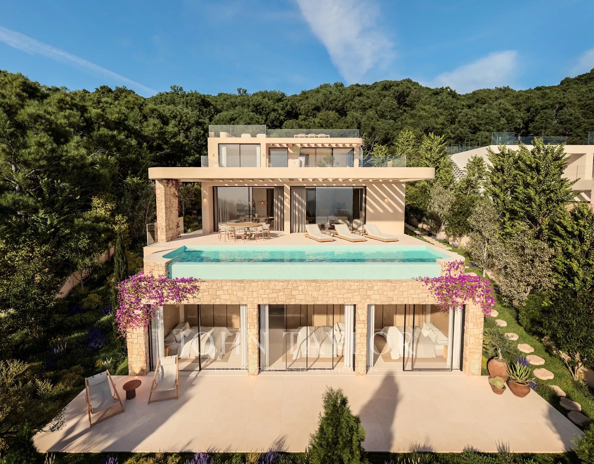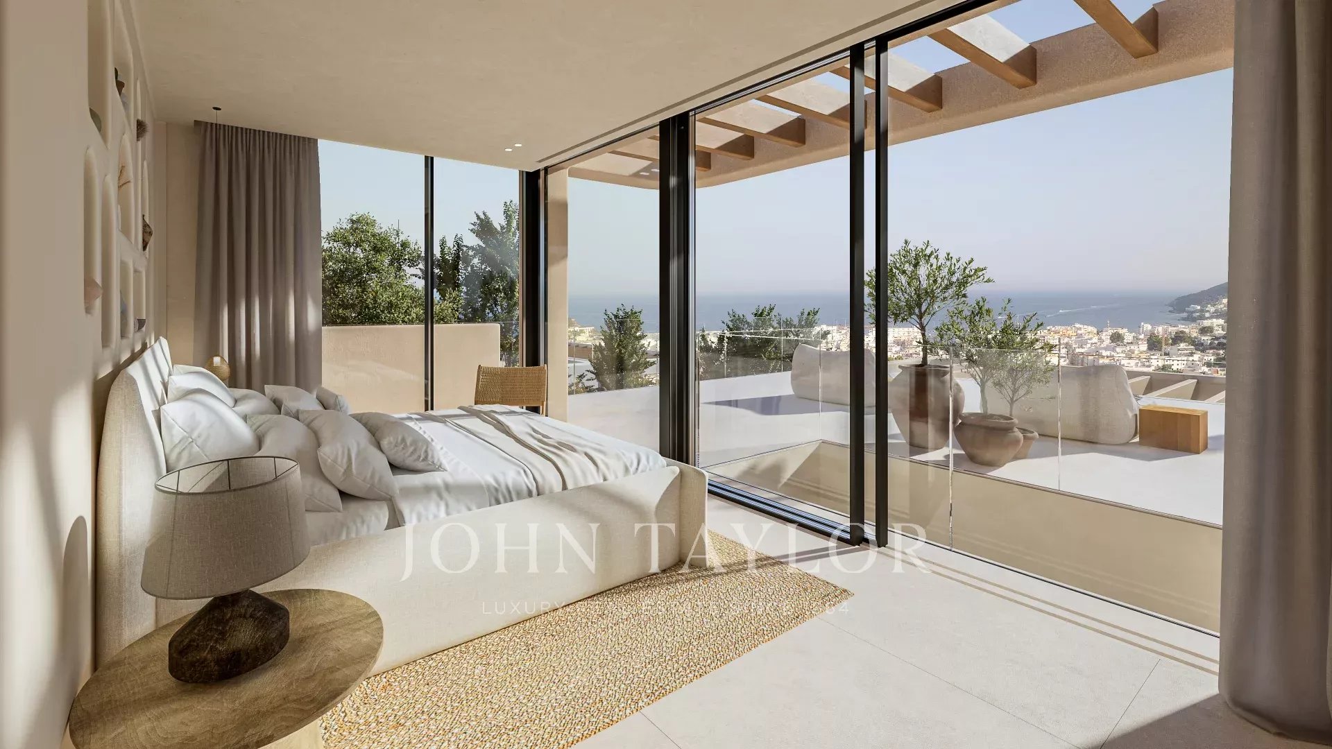 Ce projet est conçu selon le style ibizien, avec vue sur la mer et en utilisant des matériaux nobles tels que la pierre locale, le bois de chêne et le mortier de chaux blanche. Il s'agit en même temps d'un projet moderne avec de grandes fenêtres pour capter toute la lumière de cette merveilleuse île. Piscine privée, zone de détente et jardin.
