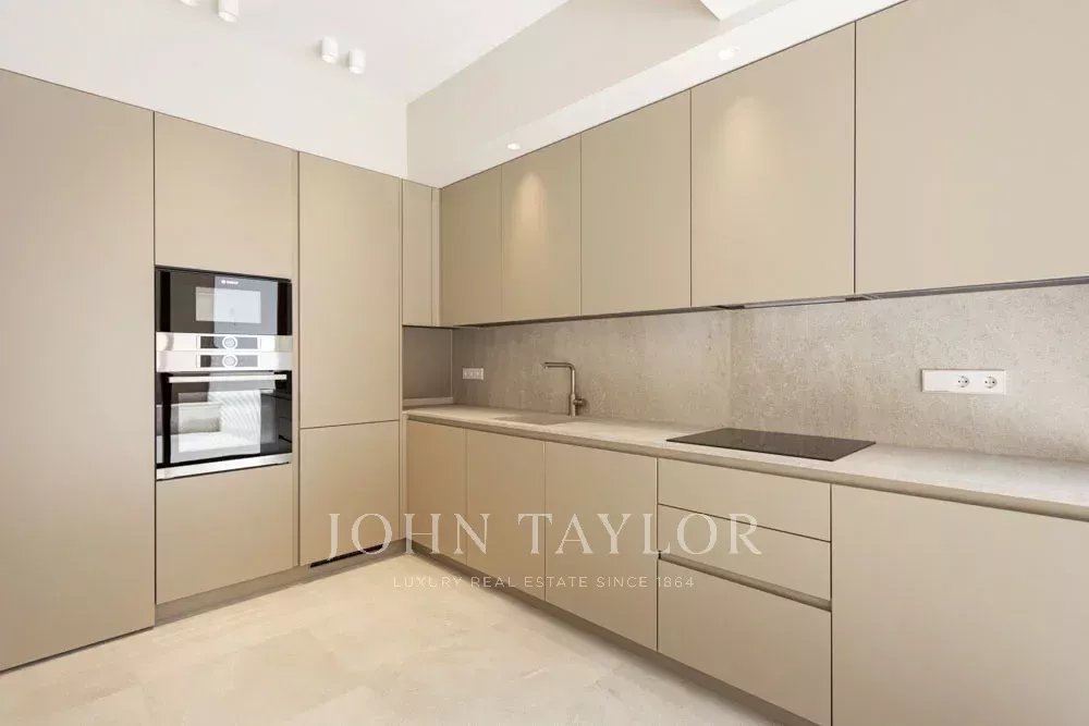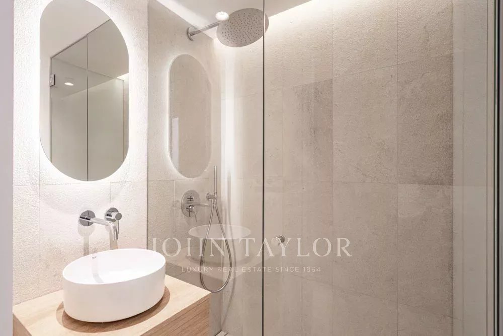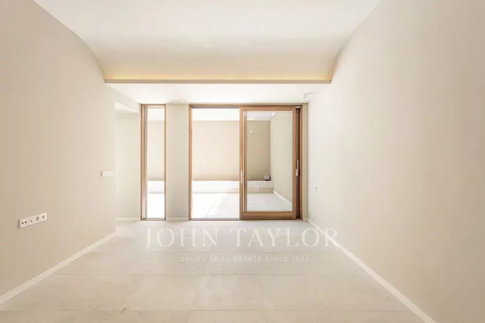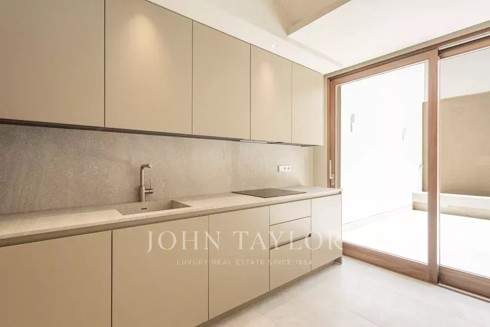 Appartement au rez-de-chaussée : 100 m², 2 chambres, 2 salles de bains (1 en suite), cuisine, salle à manger, salon avec accès à un patio privé de 30 m².