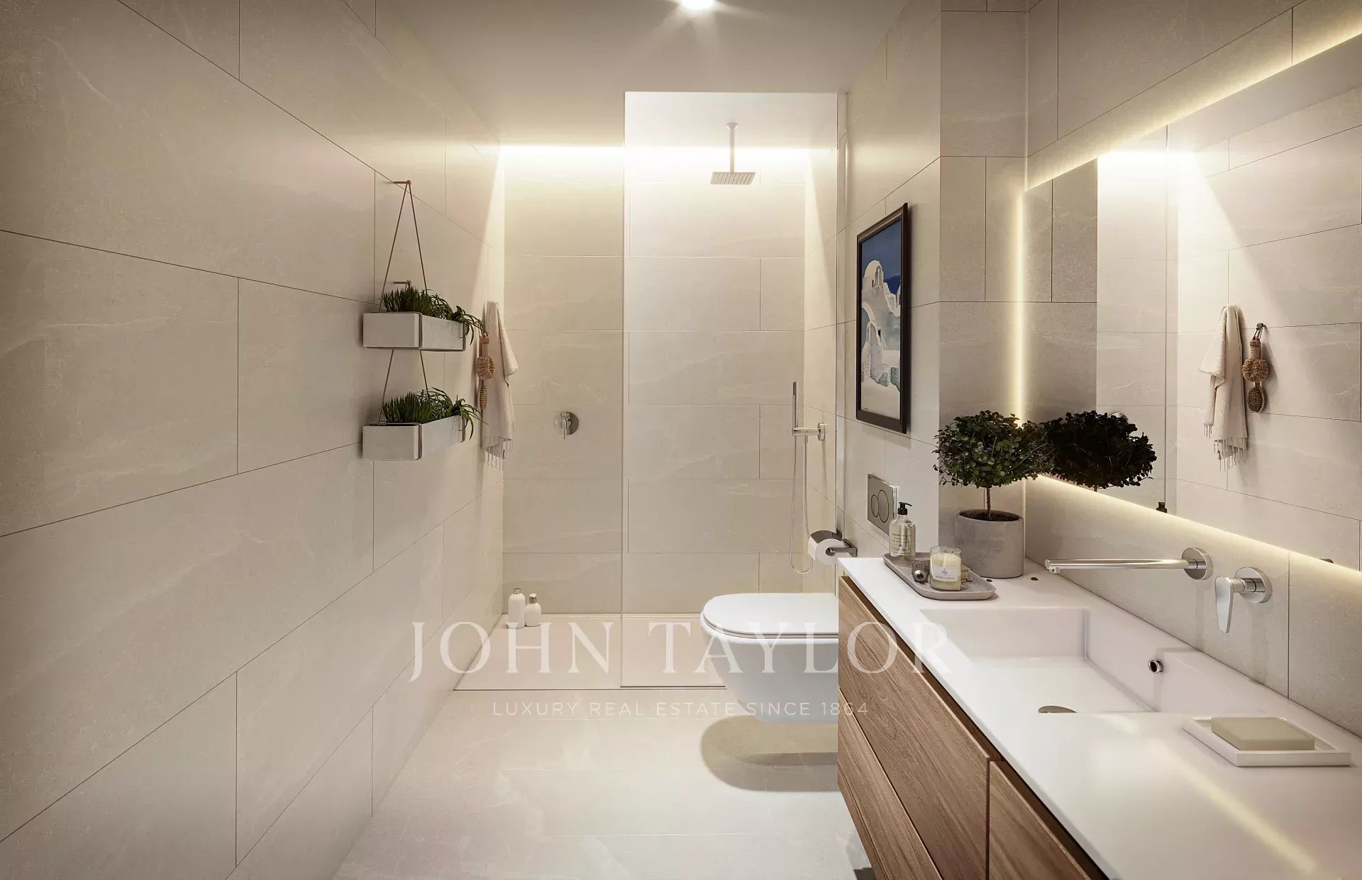 Les salles de bains sont équipées d'un meuble mural en bois avec un ou deux lavabos, d'une douche avec bac à douche et d'une robinetterie encastrée de la maison Tres. L'achèvement des travaux est prévu pour mars 2026.