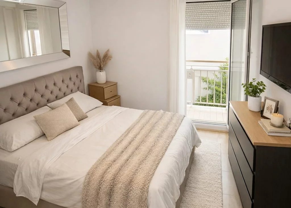 L’appartement comprend un séjour lumineux avec salle à manger et un accès direct à une terrasse couverte, idéale pour profiter du climat méditerranéen toute l’année. La cuisine entièrement équipée est fonctionnelle et pensée pour un usage quotidien. Les deux chambres sont spacieuses et bénéficient d’une belle luminosité naturelle, tandis que la salle de bains est confortable et pratique.