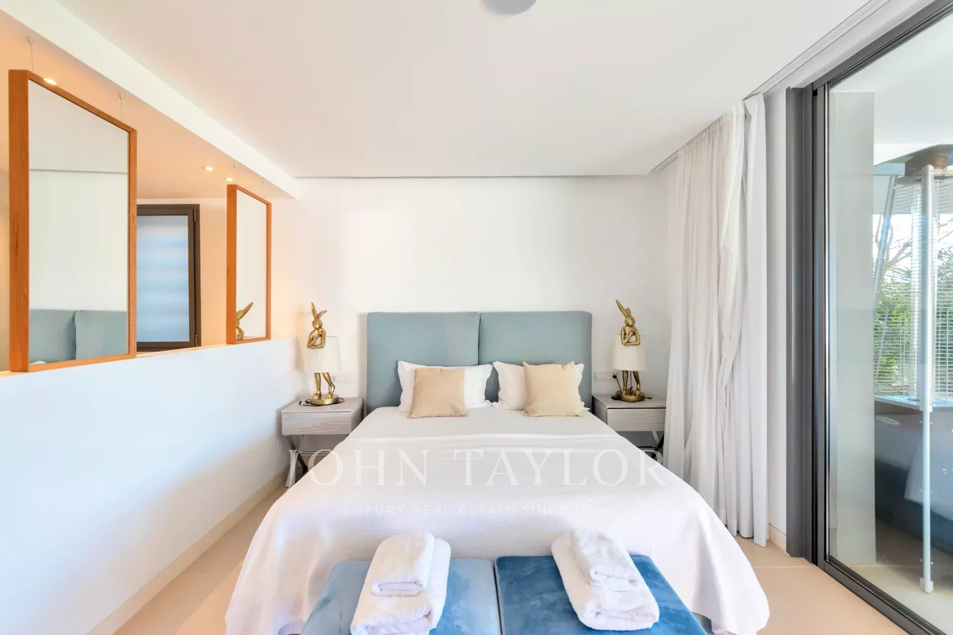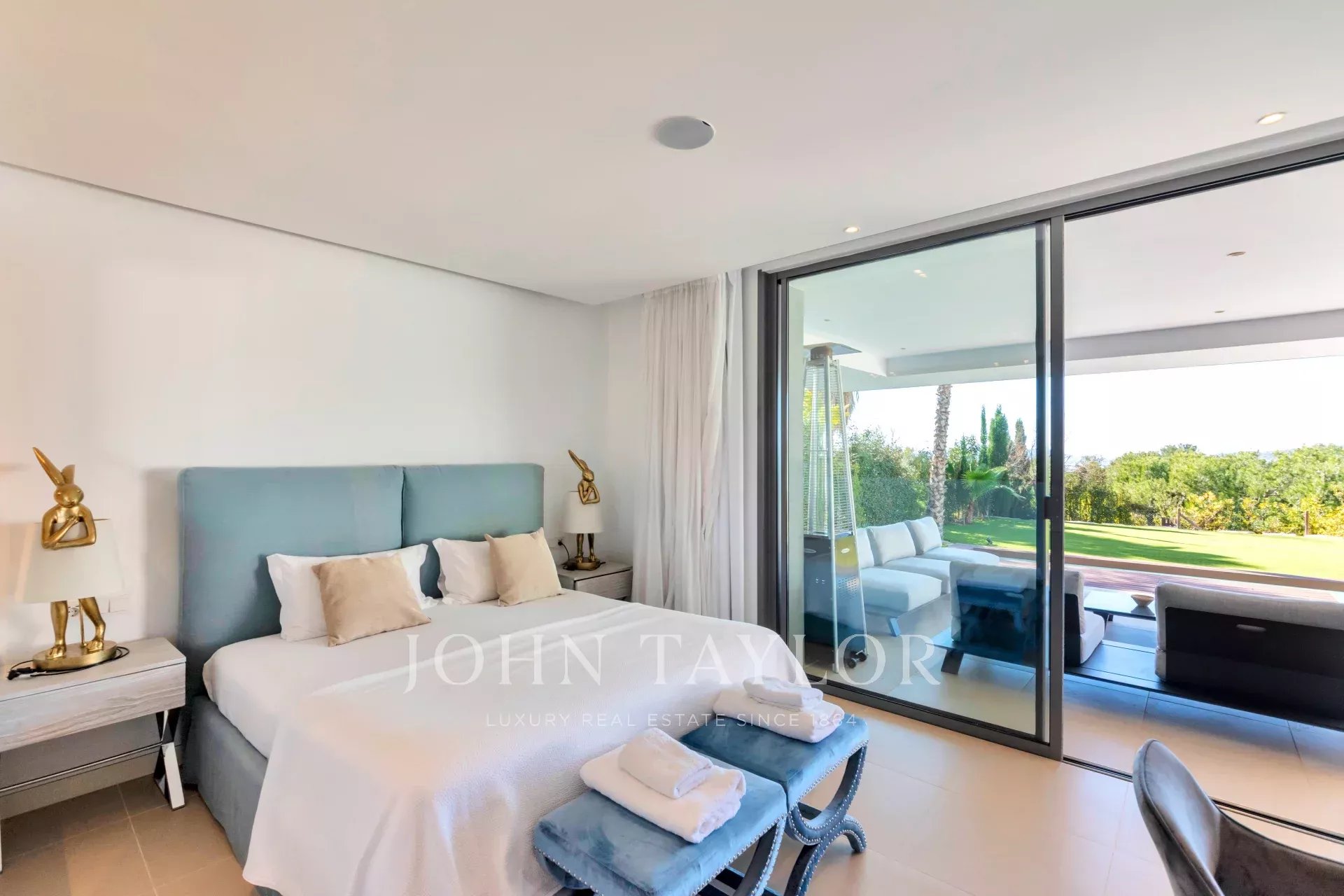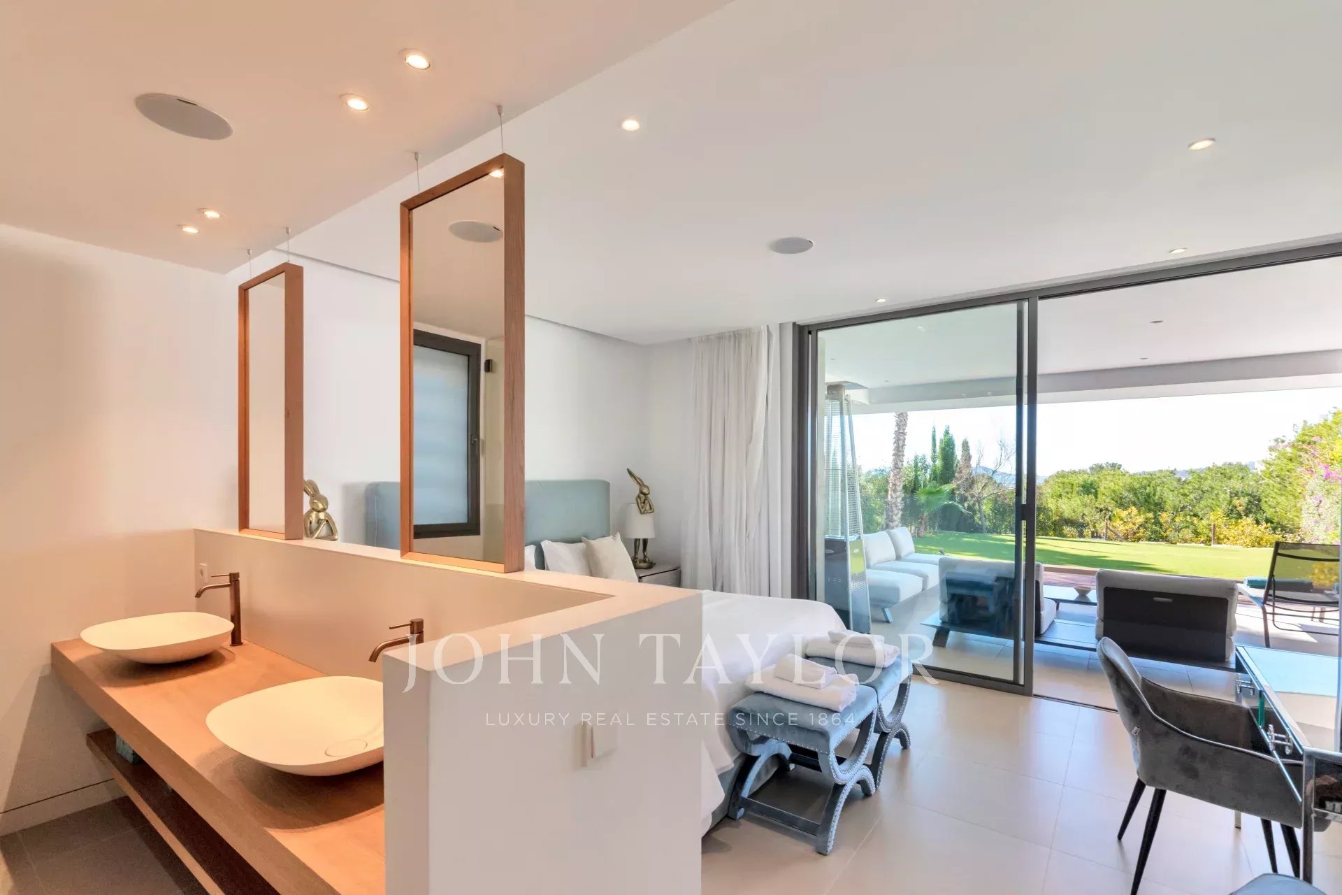 Le salon et la cuisine à aire ouverte s'articulent sans effort, améliorant la sensation d'espace et la connexion avec l'extérieur. L'appartement dispose de trois chambres joliment décorées, chacune avec un accès direct au jardin. La suite principale dispose d'une salle de bains privative et d'un dressing, tandis que deux chambres supplémentaires bénéficient d'une salle de bains privative et d'une vue sur les jardins paysagers.