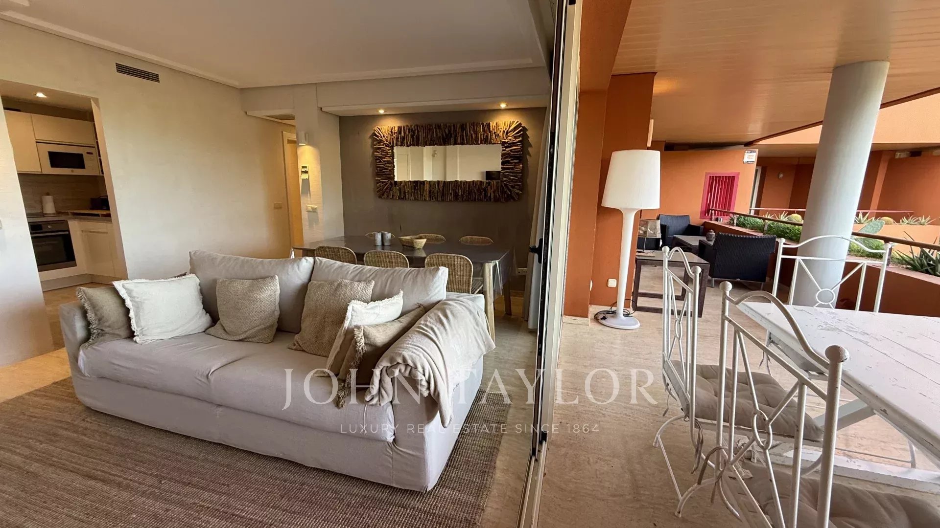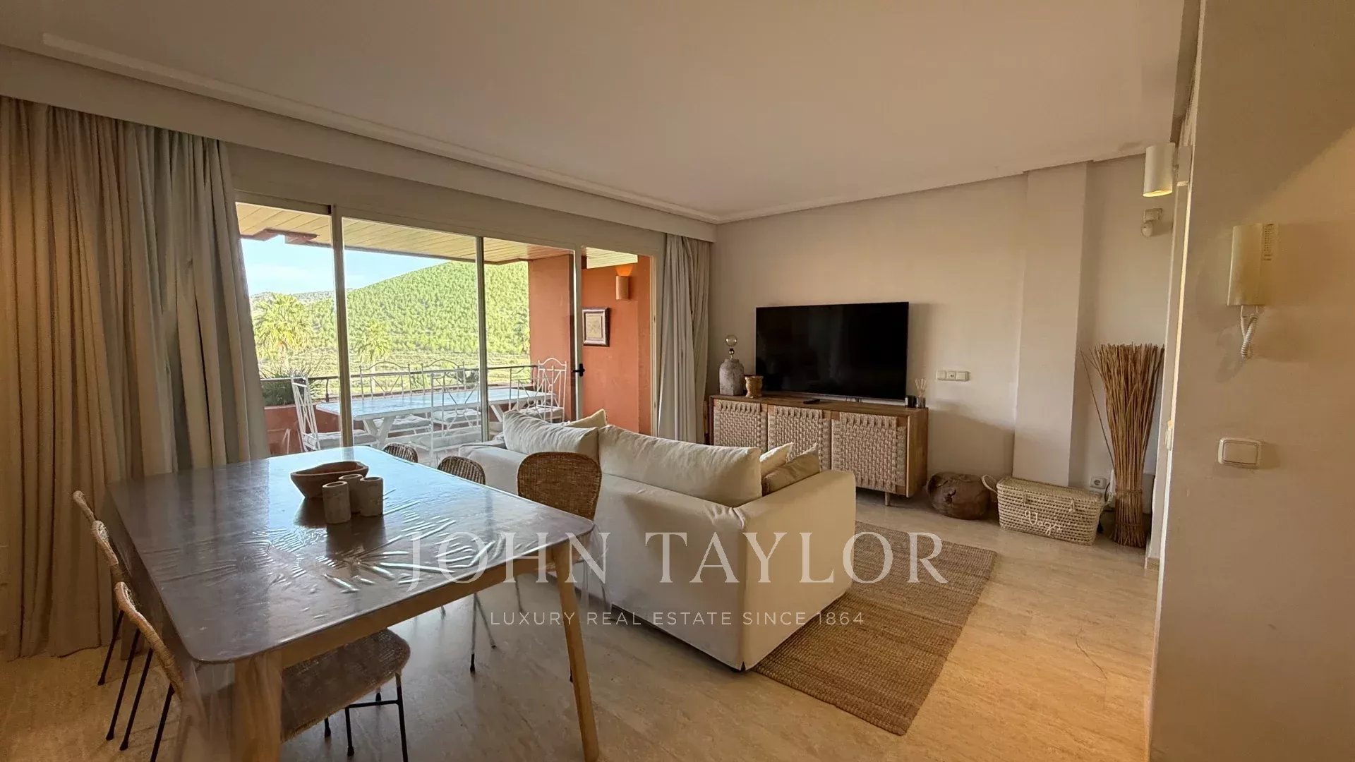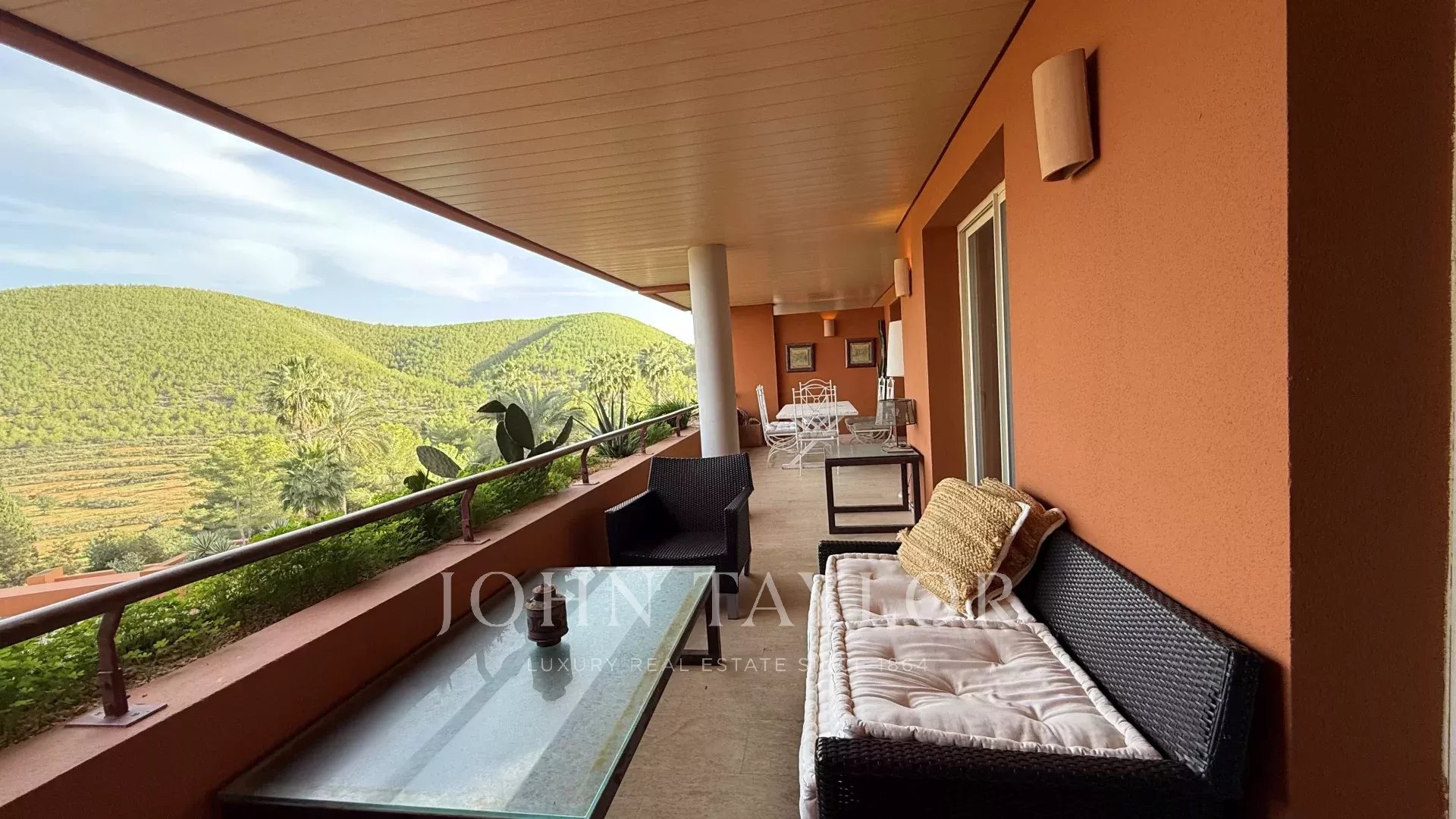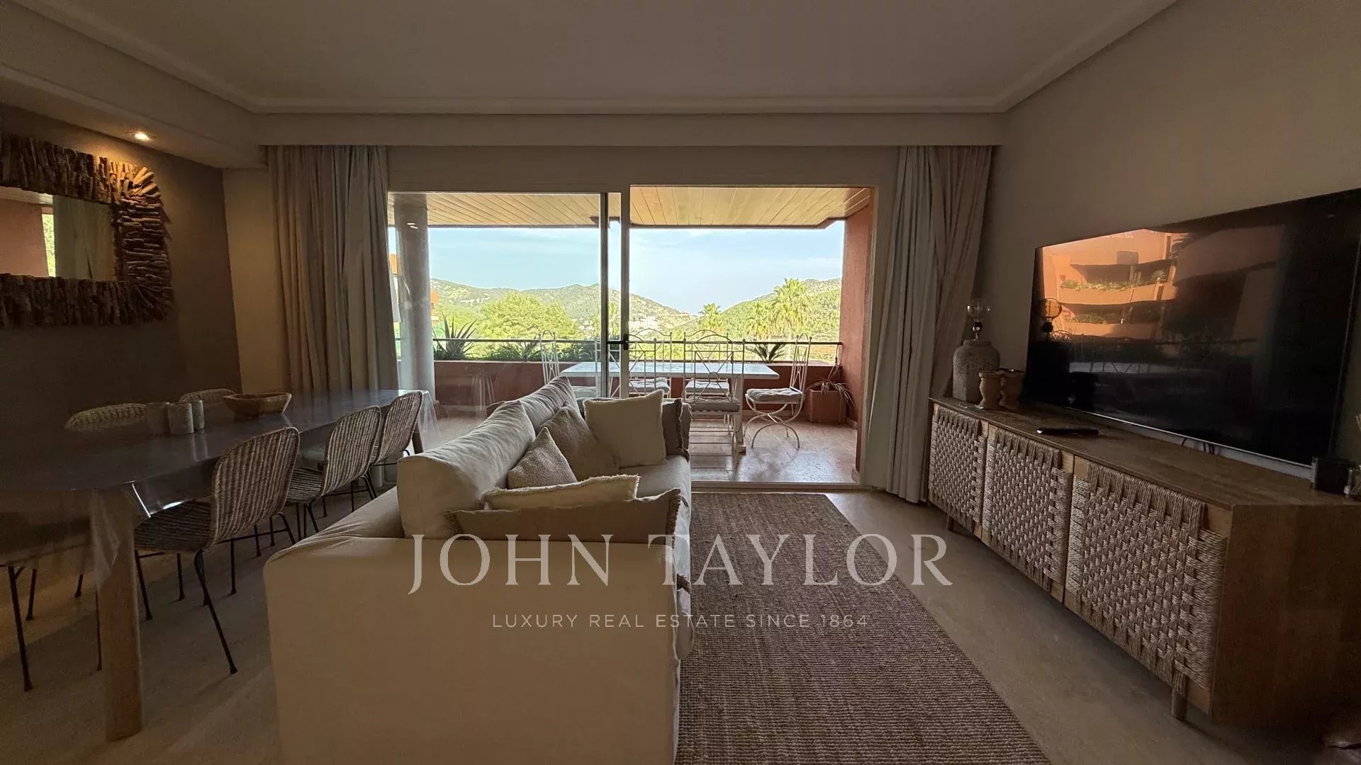 À l’extérieur, une grande terrasse invite à profiter pleinement du climat méditerranéen. Cet espace, idéal pour les repas en plein air, est complété par un espace chill-out soigné, parfait pour se détendre et se connecter avec la nature environnante.