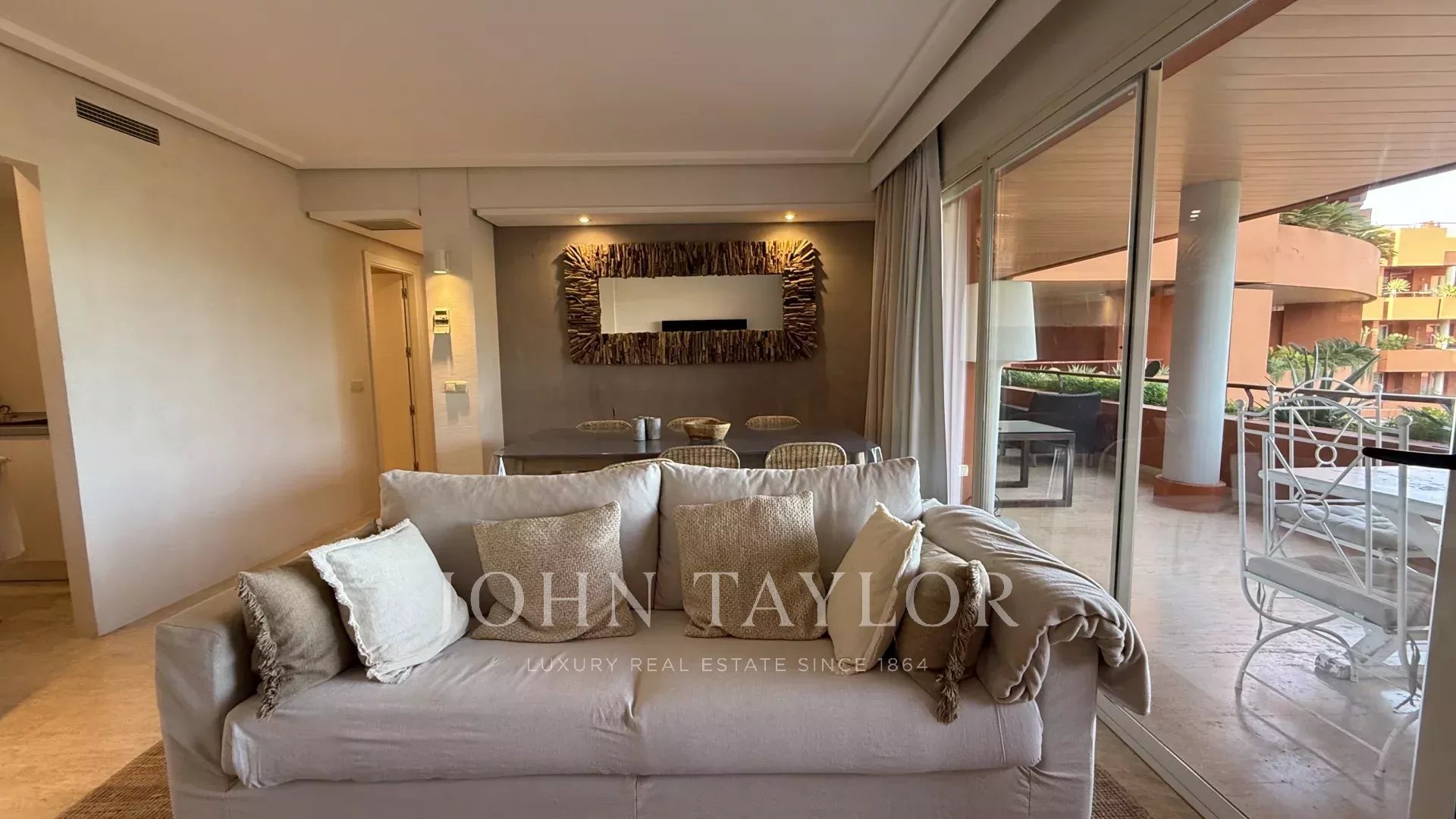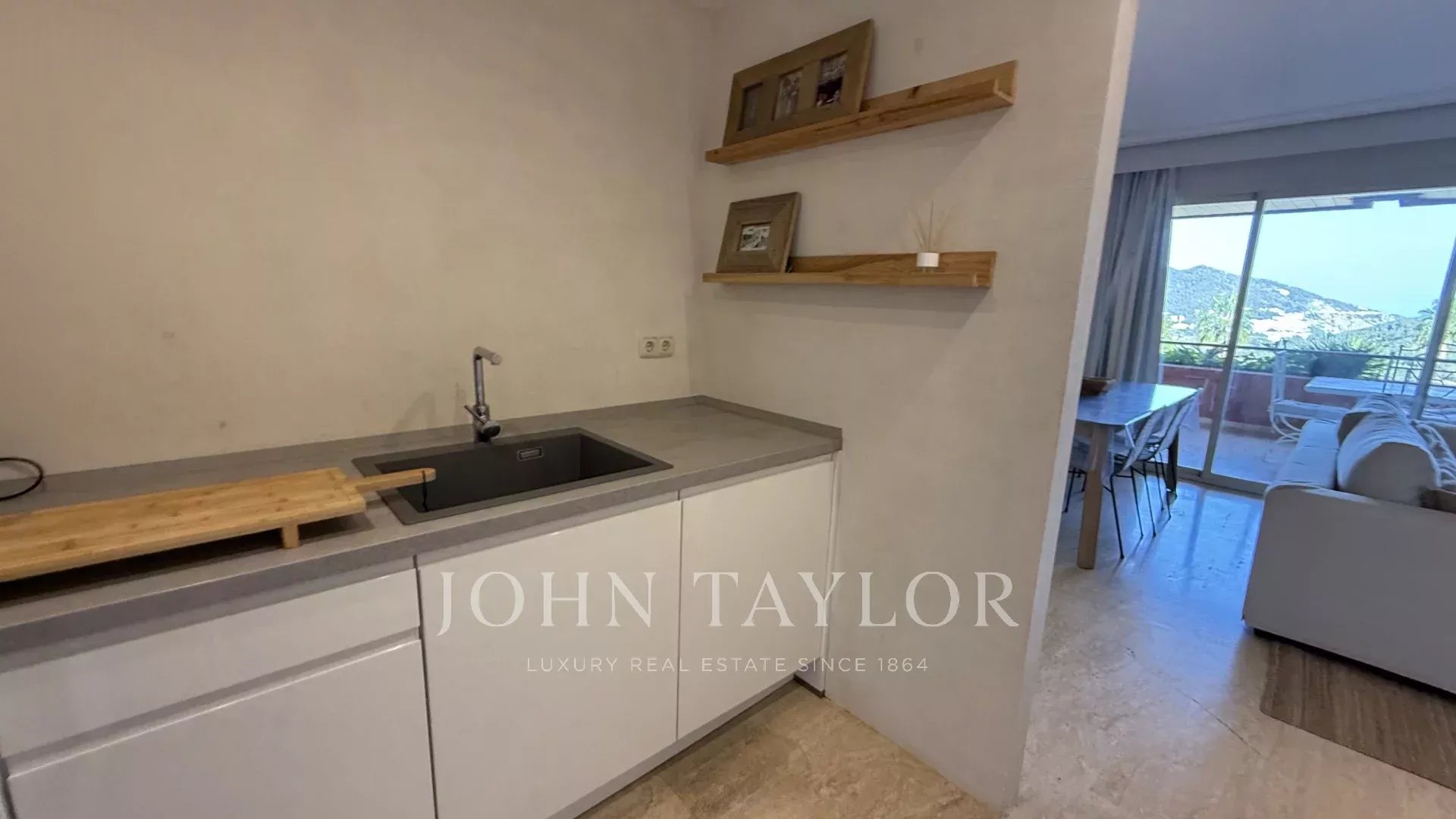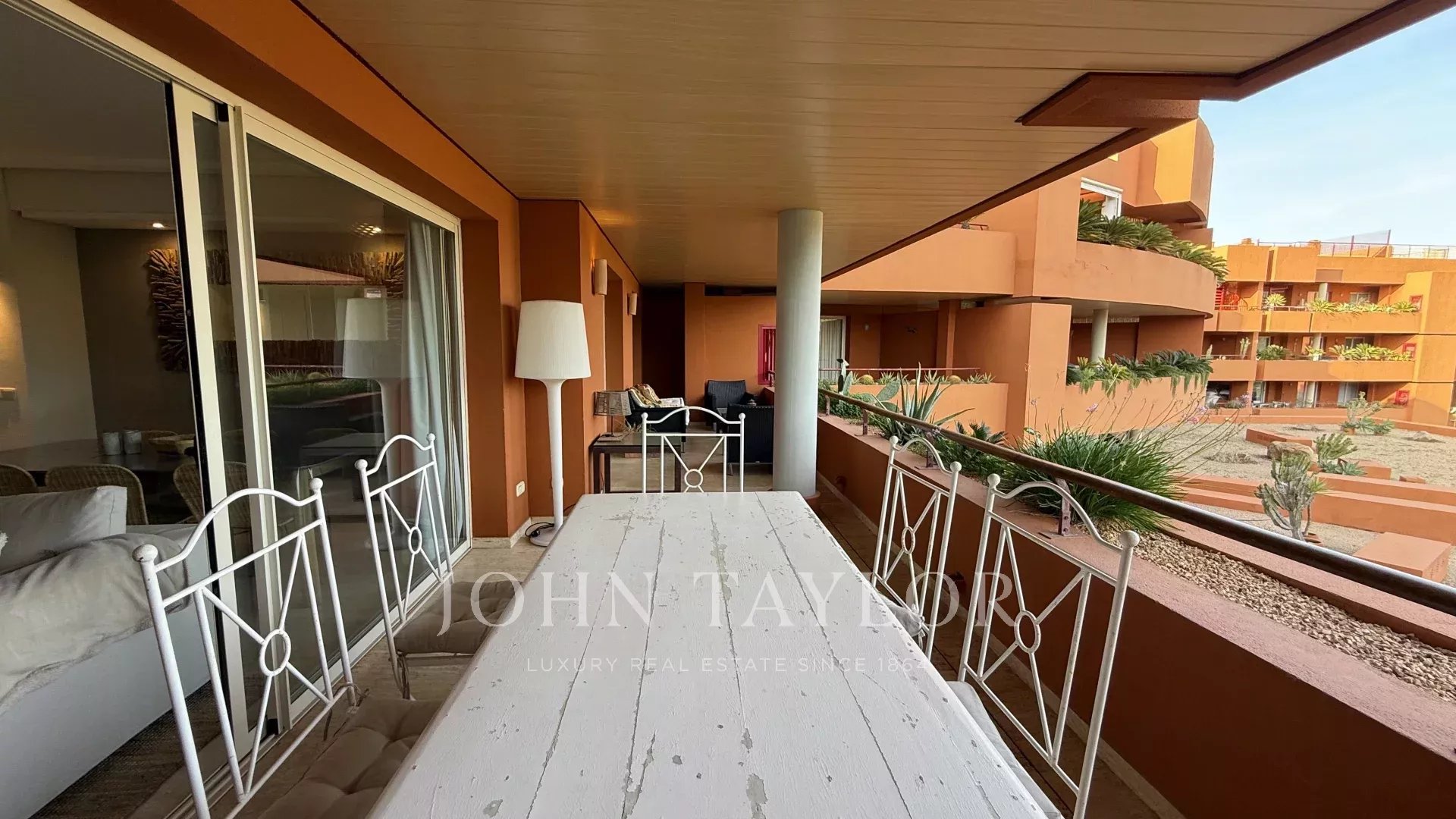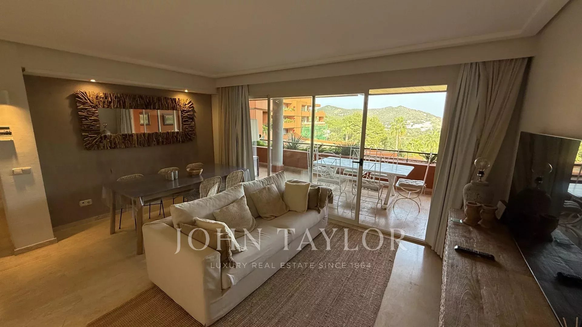 À l’extérieur, une grande terrasse invite à profiter pleinement du climat méditerranéen. Cet espace, idéal pour les repas en plein air, est complété par un espace chill-out soigné, parfait pour se détendre et se connecter avec la nature environnante.