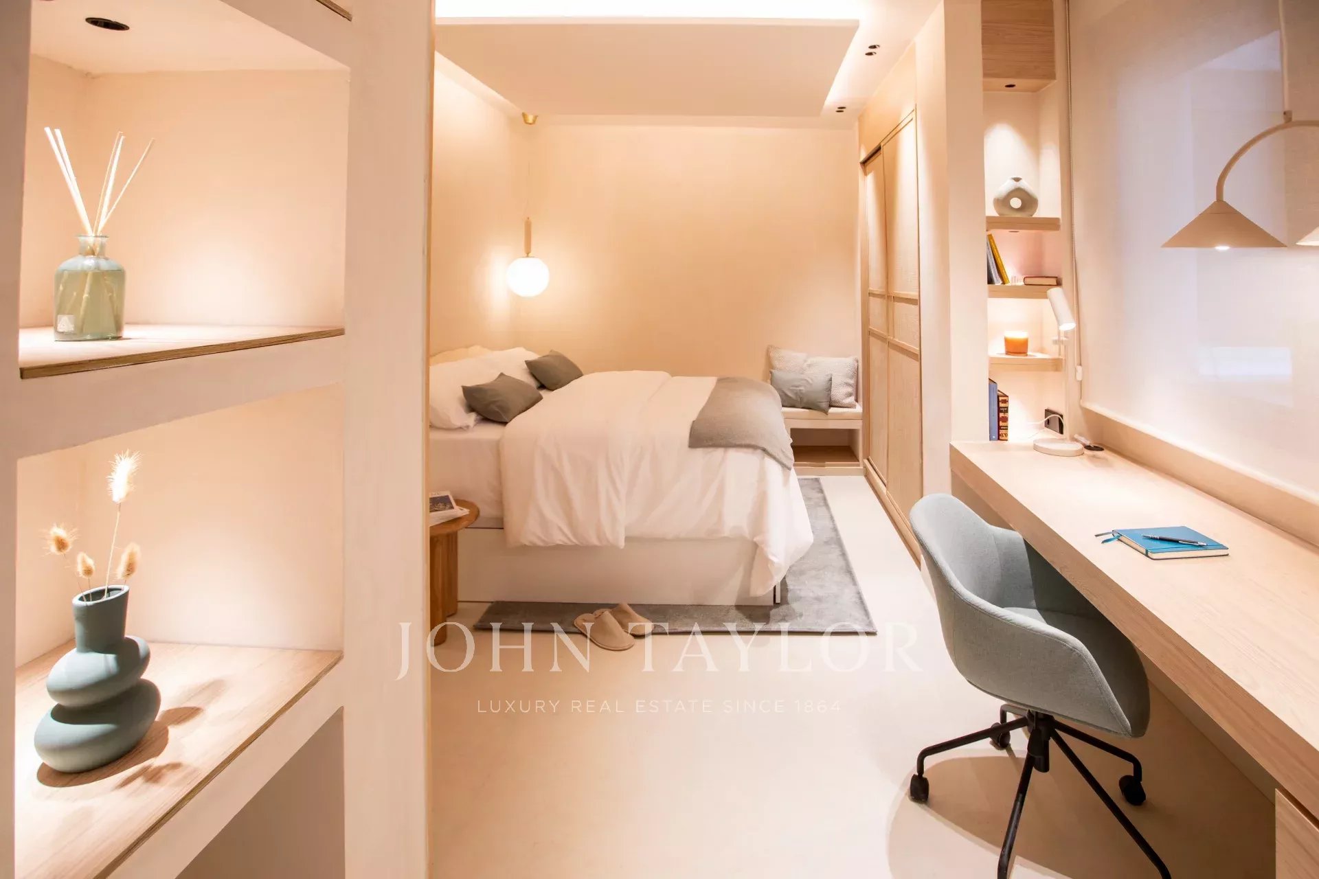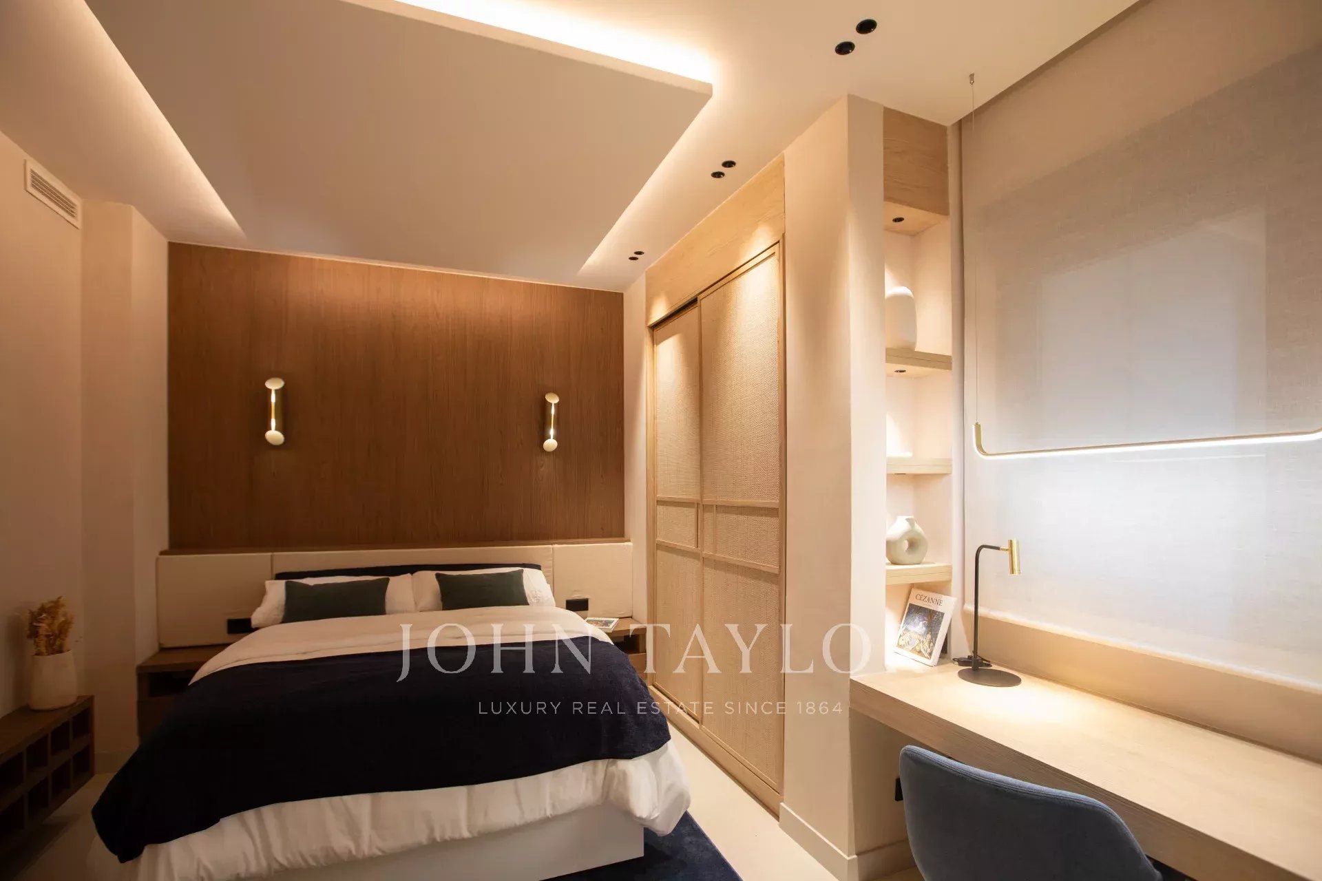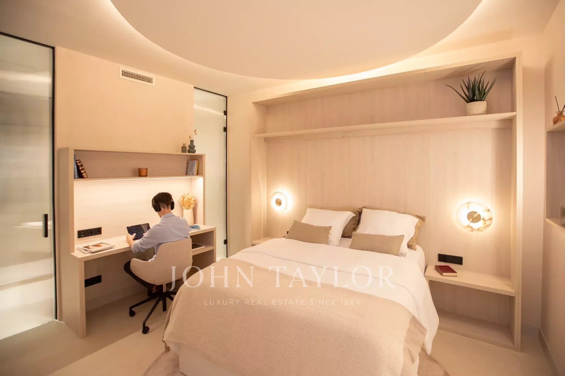 L'espace nuit comprend pas moins de cinq autres chambres, toutes dotées d'une salle de bains attenante avec fenêtre et d'un espace de travail. L'une d'entre elles donne sur une cour calme et paysagée offrant une vue agréable. Le bureau, équipé d'un grand écran pour les vidéoconférences, et le salon, qui dispose d'un projecteur dissimulé, donnent sur la cour. Une autre des chambres dispose d'une entrée séparée, ce qui la rend idéale pour les chambres du personnel ou des invités. Il y a également une buanderie séparée avec trois machines à laver et trois sèche-linge.