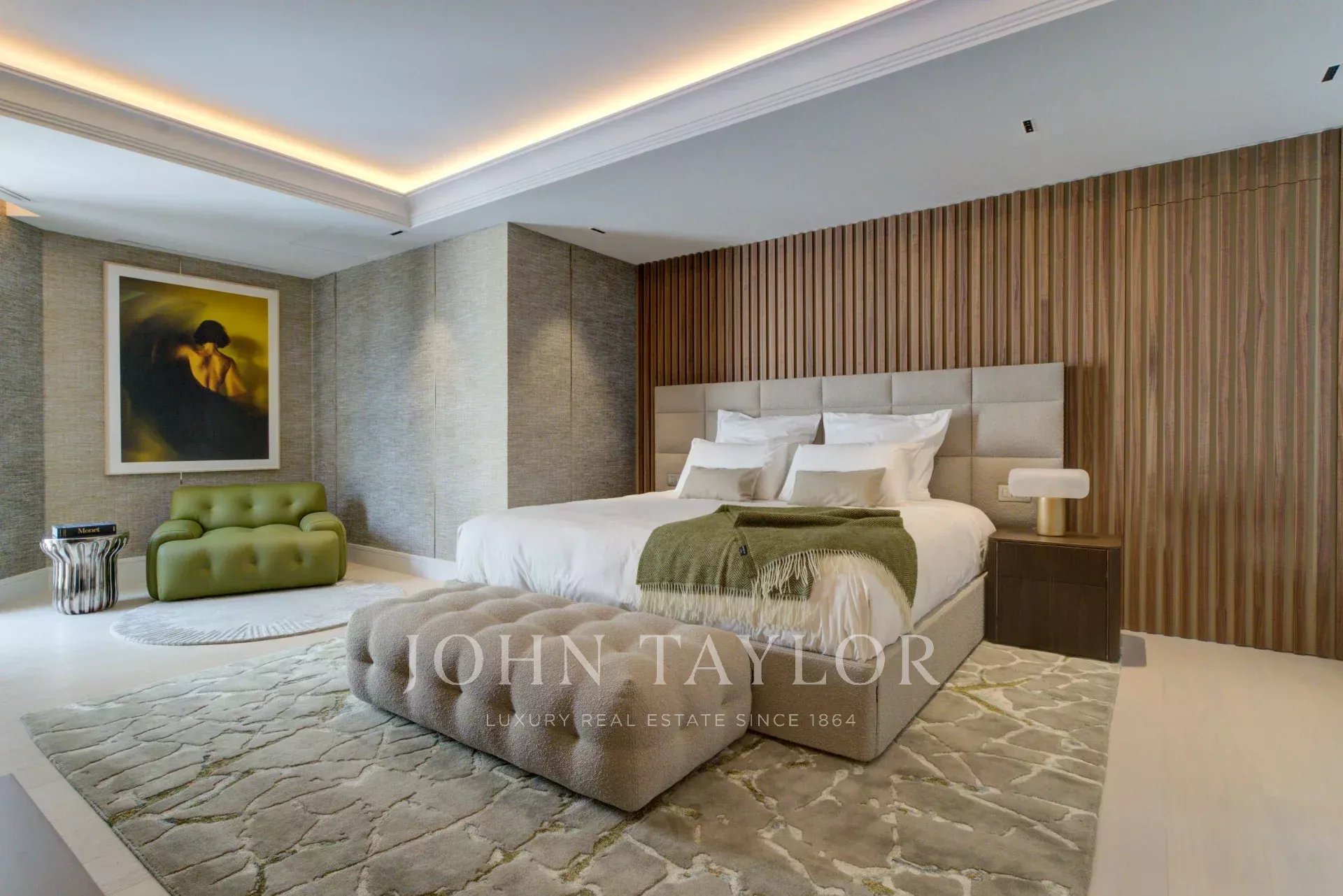 Le coin nuit comprend quatre chambres à coucher, toutes dotées d'une salle de bains privative. La chambre principale, située à l'arrière de la maison, jouit d'une intimité particulière et dispose d'un dressing et d'une grande salle de bains. En outre, une autre chambre a accès à la terrasse, qui peut être utilisée comme salon ou bureau.