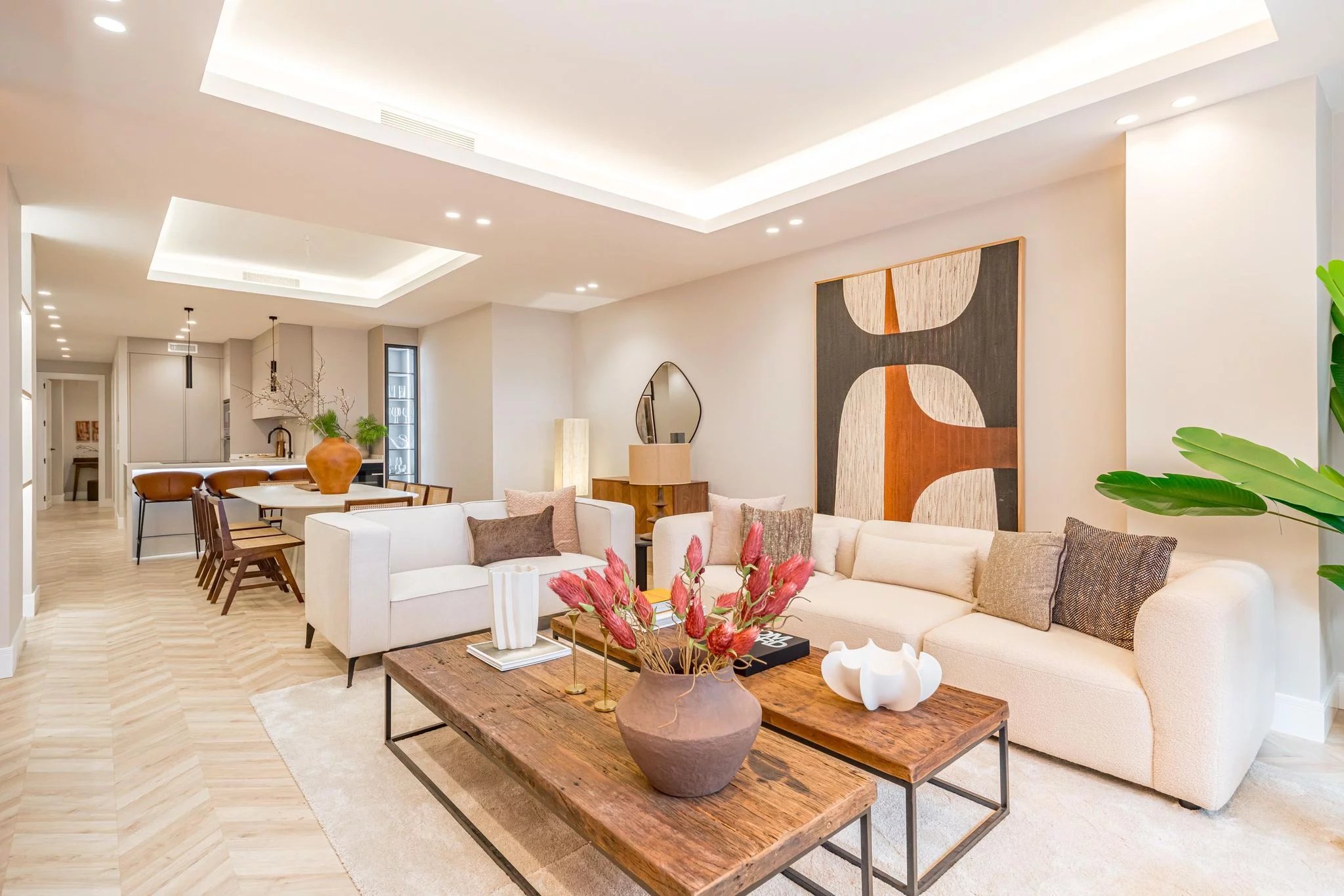 La zone sociale s'articule autour d'un salon et d'une salle à manger spacieux, parfaits aussi bien pour la vie quotidienne que pour recevoir des invités, accompagnés d'une cuisine spacieuse et fonctionnelle, conçue pour une utilisation confortable et efficace.