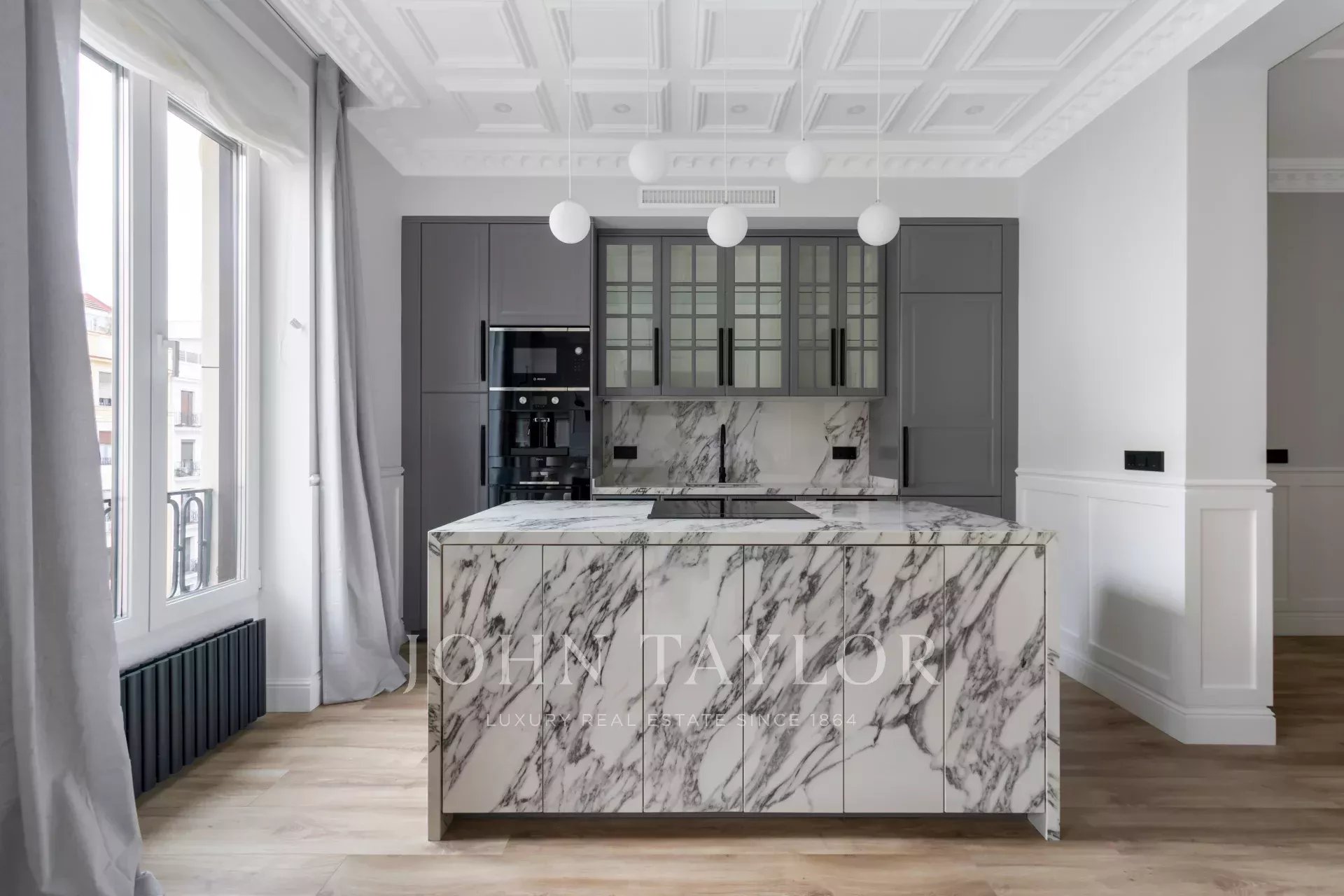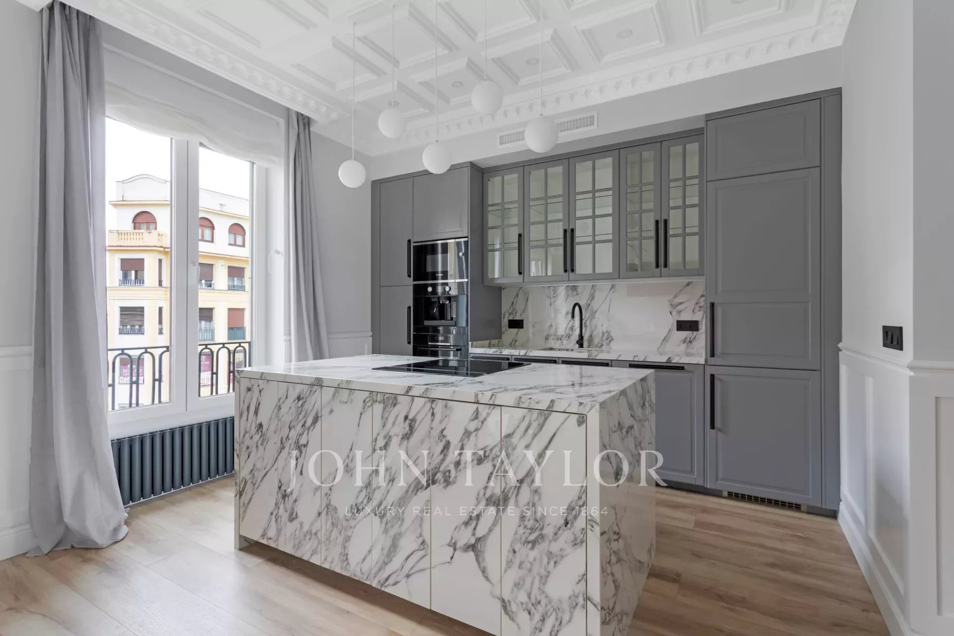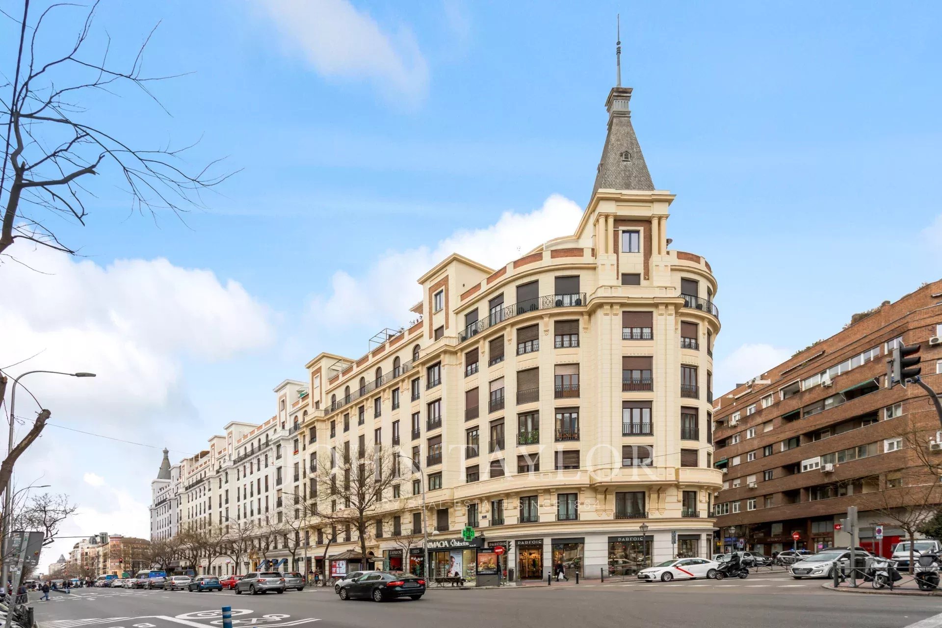 La zone extérieure est occupée par le grand salon avec balcons donnant sur la rue Alcalá, avec la cuisine de style moderne, un grand îlot et équipée d'appareils électroménagers haut de gamme.