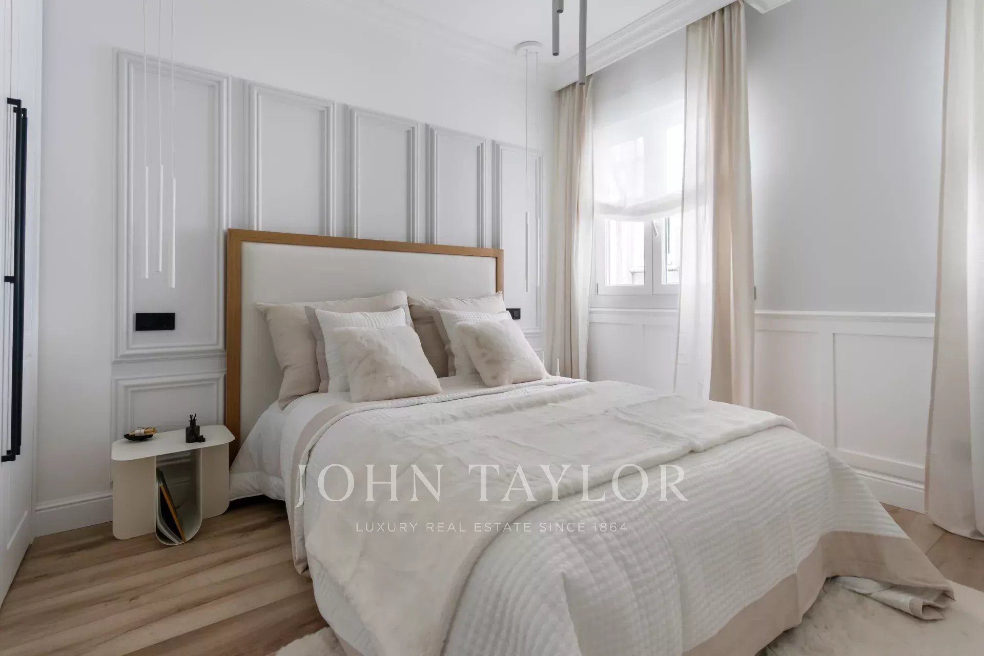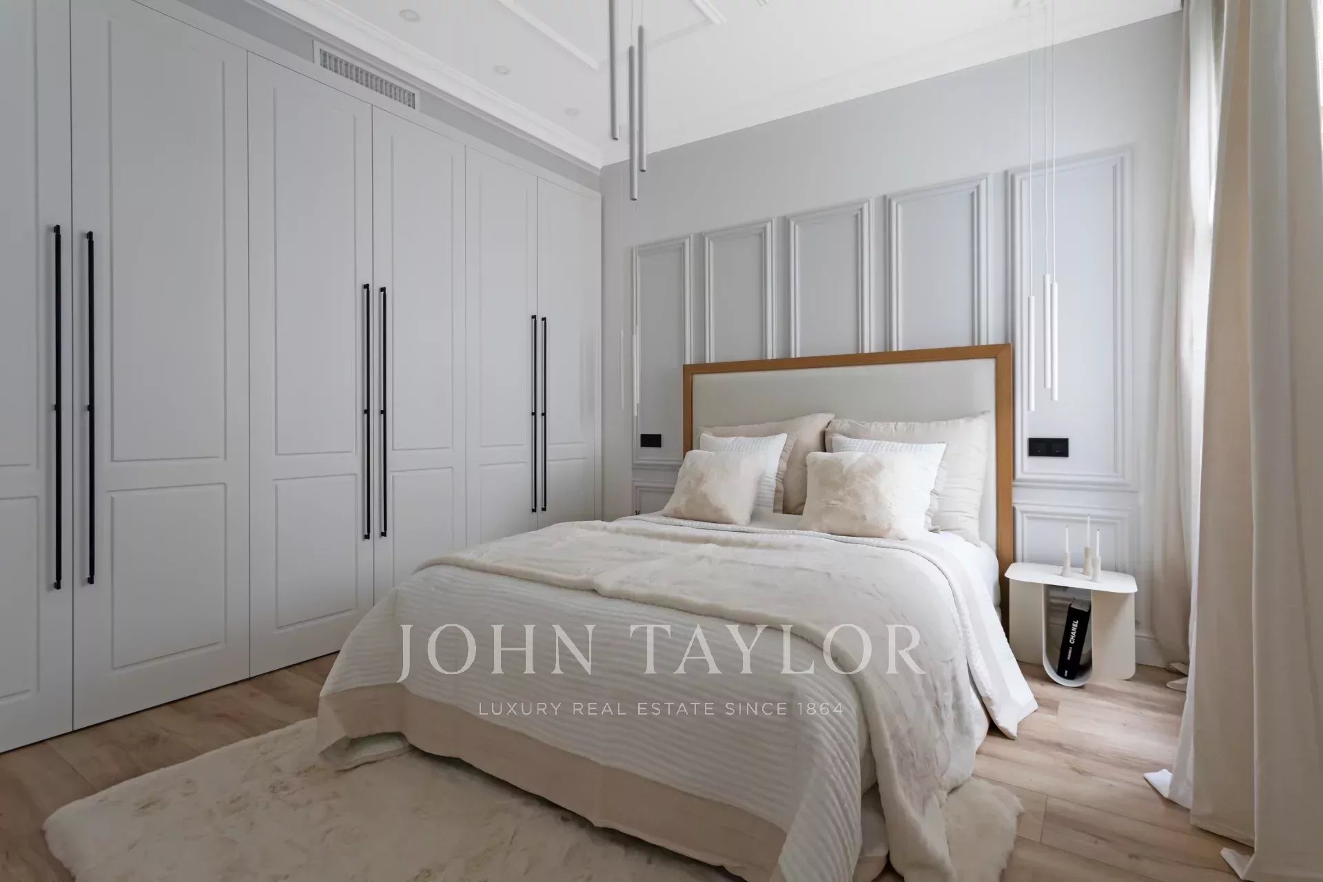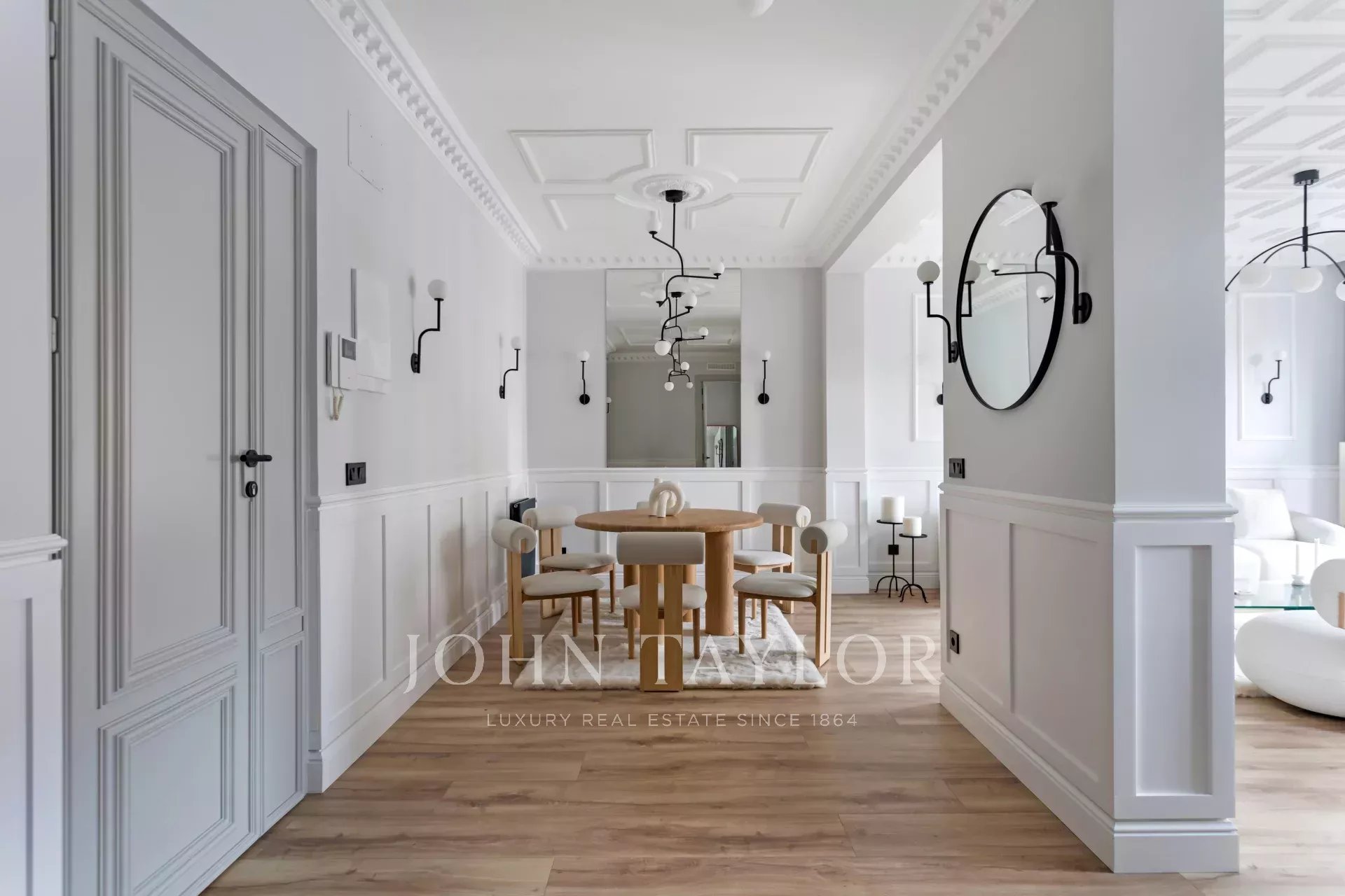 Un appartement récemment rénové situé au cinquième étage d'un bel immeuble à la façade classique.