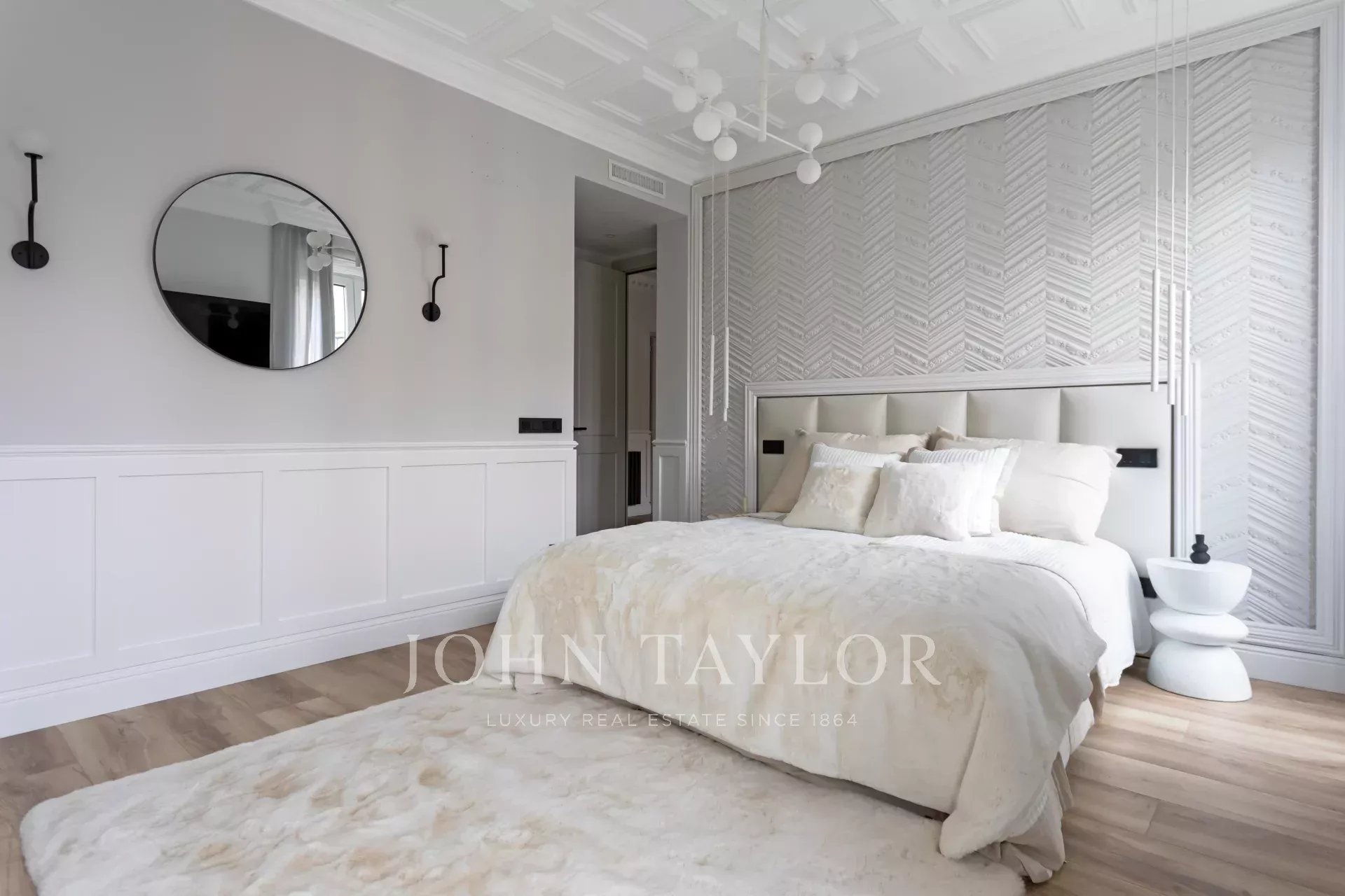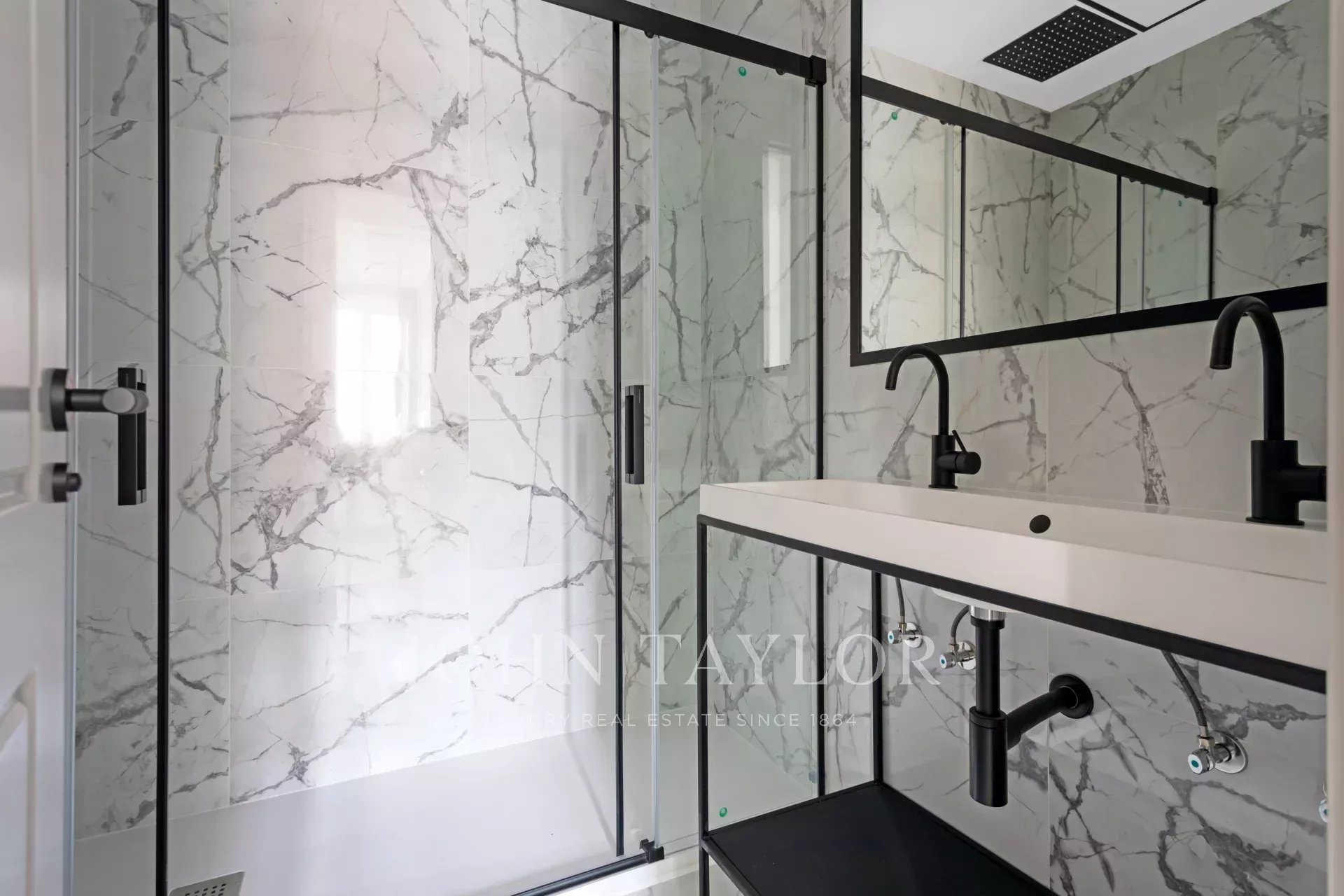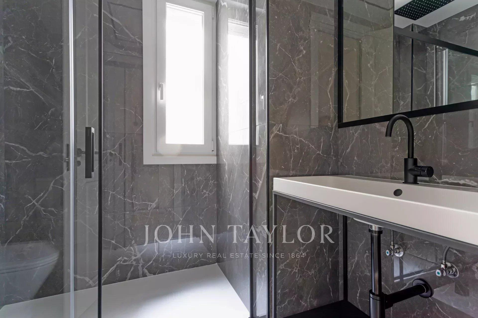 Un appartement récemment rénové situé au cinquième étage d'un bel immeuble à la façade classique.