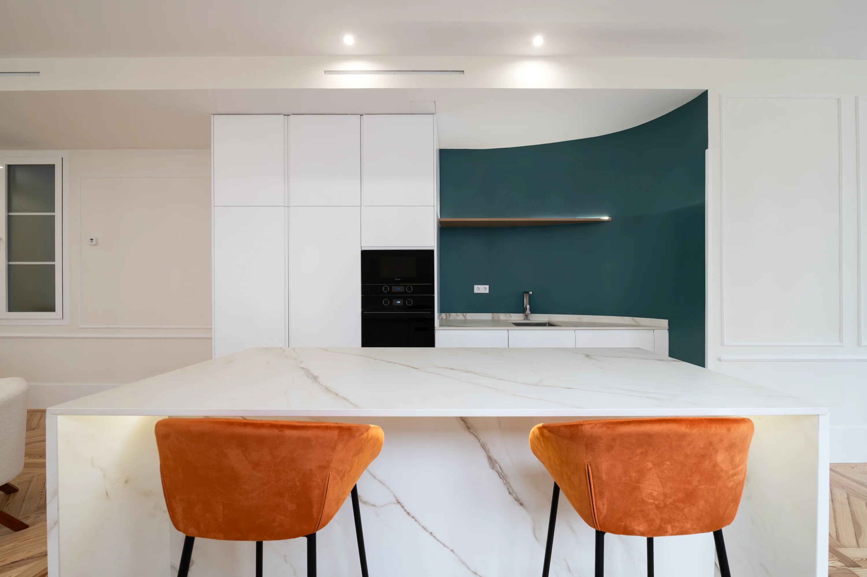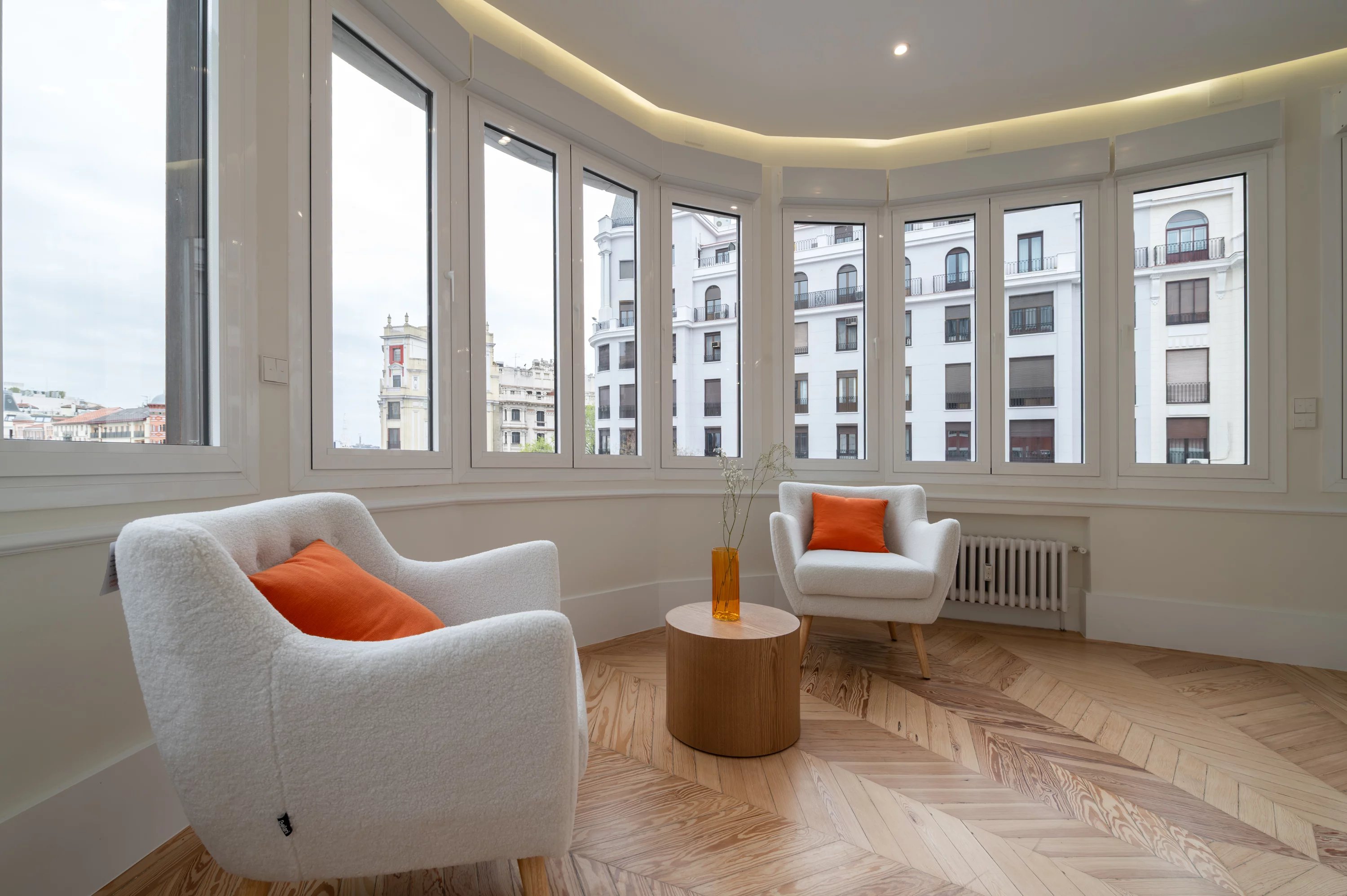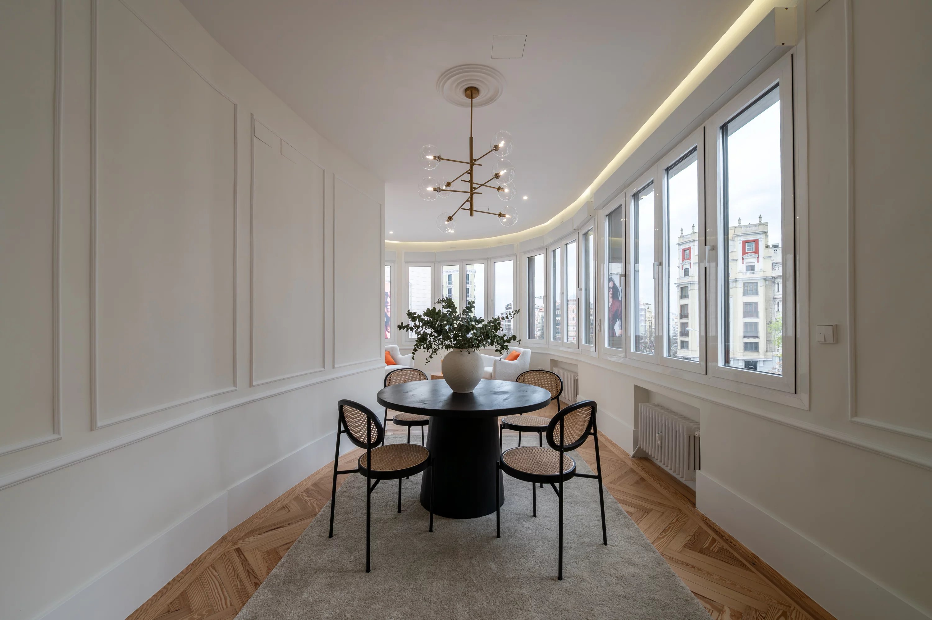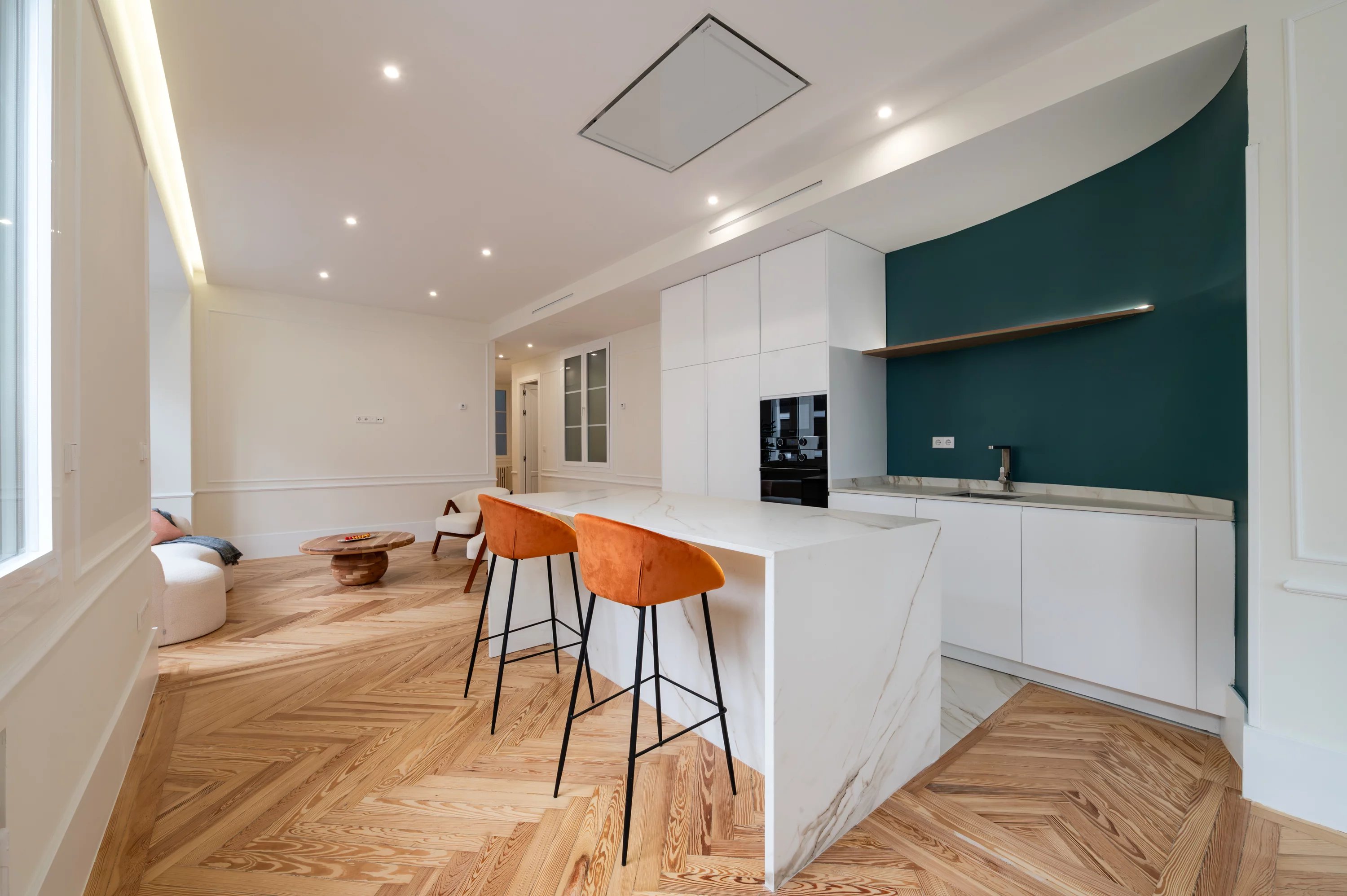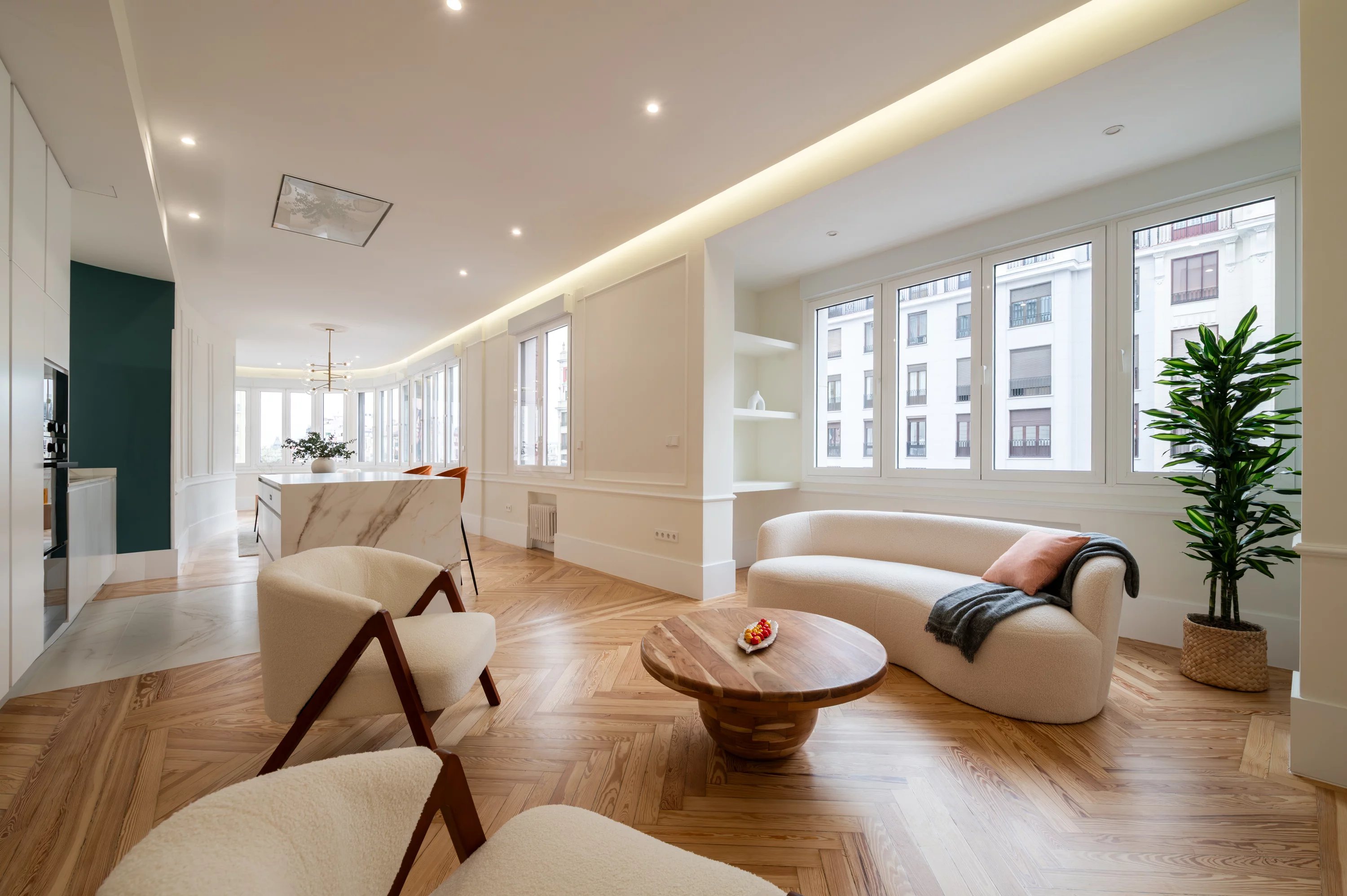 Le salon principal, spacieux et lumineux, devient l'endroit idéal pour profiter des vues urbaines et du dynamisme de Madrid, tandis que la cuisine, entièrement équipée, offre un espace pratique et élégant pour le quotidien.