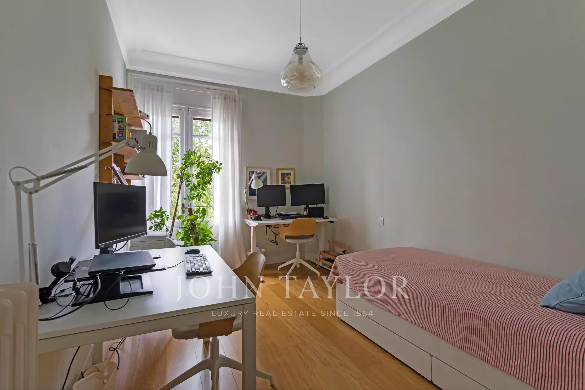 Dans la zone extérieure se trouve le salon-salle à manger séparé en deux pièces ; et deux chambres spacieuses, l'une avec salle de bains en façade et l'autre avec dressing et salle de bains en suite. Les trois chambres offrent une vue dégagée sur un magnifique bâtiment historique avec jardin privé.