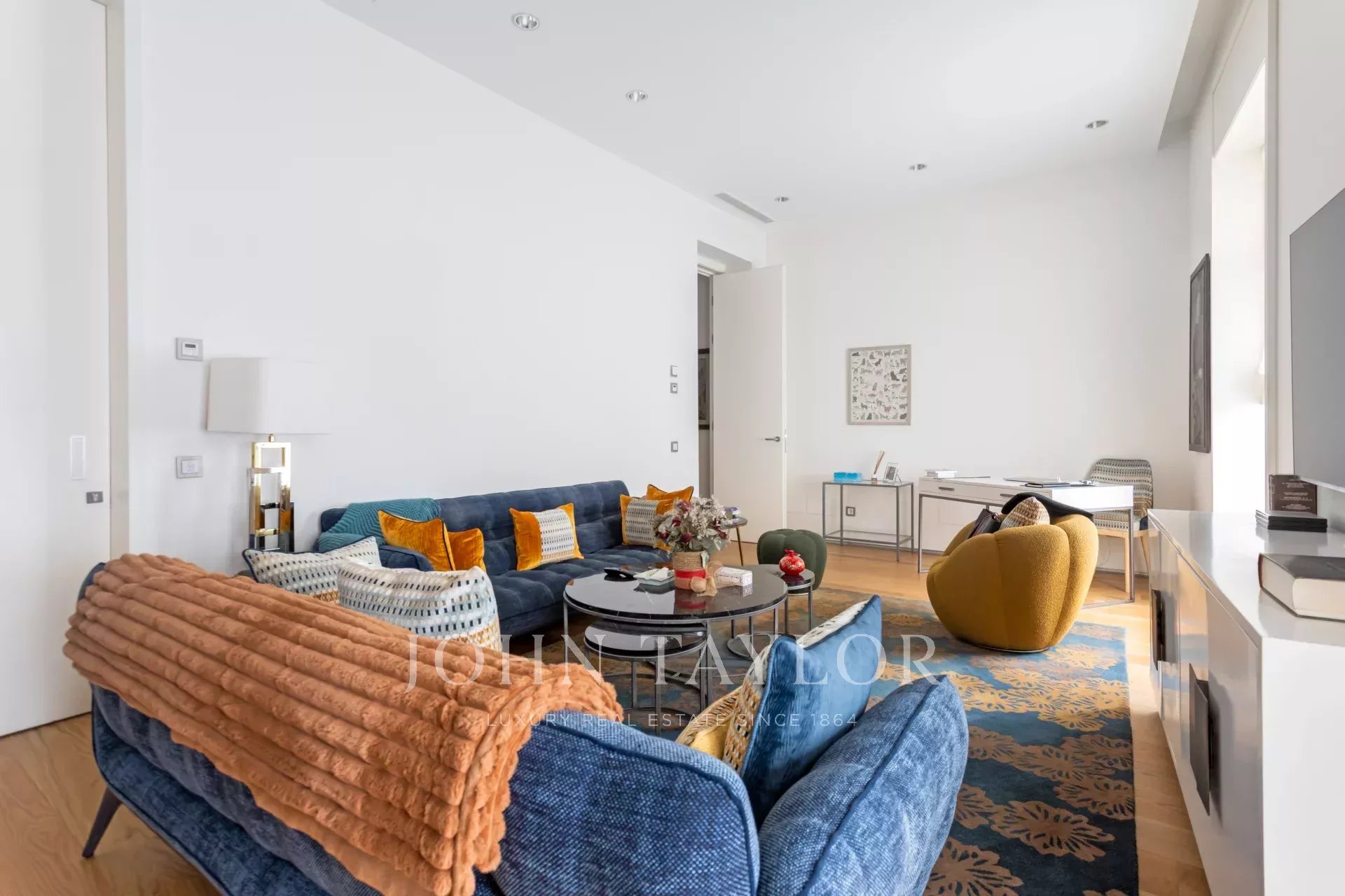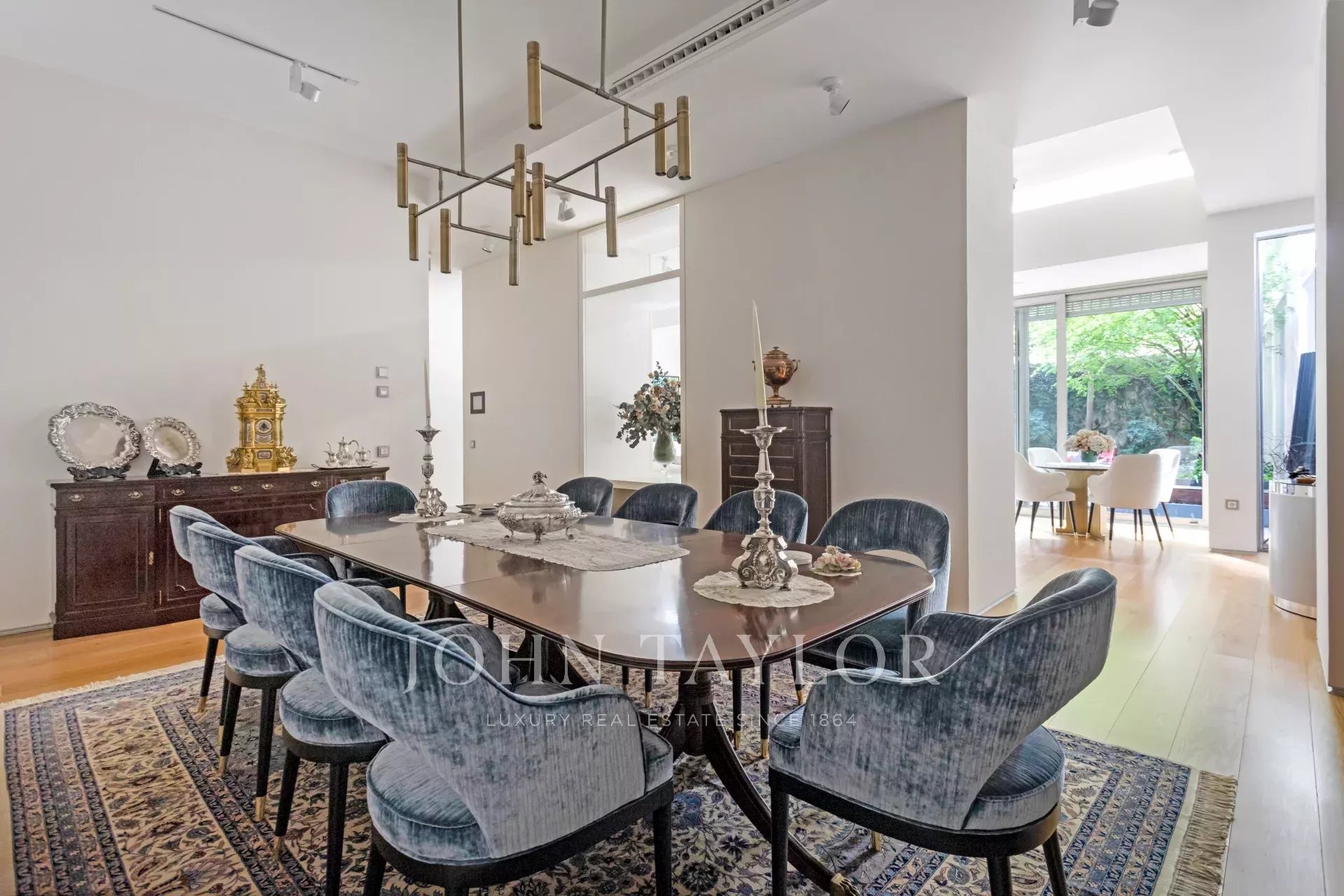 Le salon principal est impressionnant, avec de hauts plafonds et de grandes fenêtres du sol au plafond qui s'ouvrent complètement pour intégrer la terrasse et créer un espace unique. La cuisine moderne, conçue par Artificio, est équipée d'appareils haut de gamme Gaggenau, dispose d'une entrée de service et d'un accès direct à la terrasse. La propriété est complétée par une salle à manger séparée et une salle familiale accueillante.