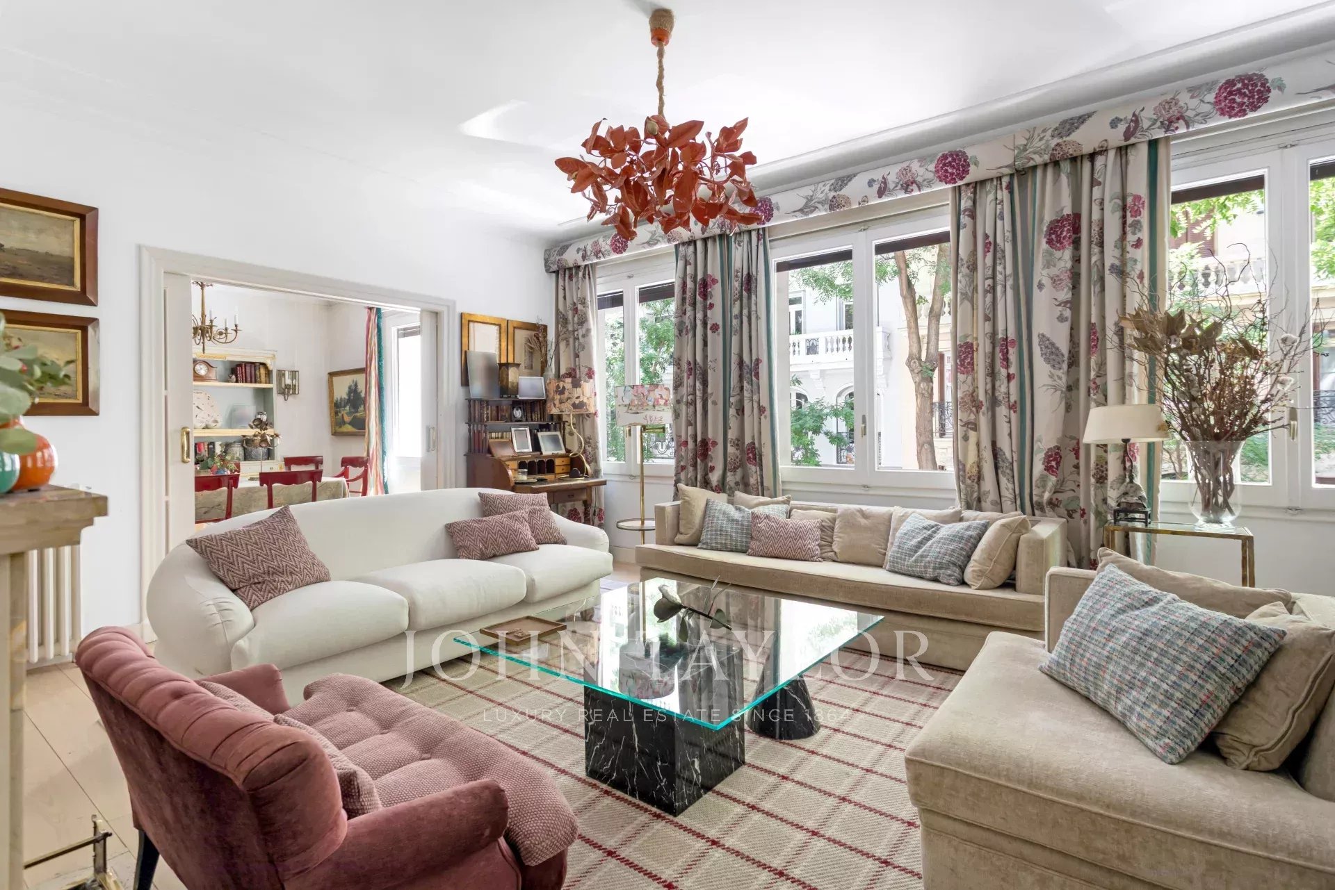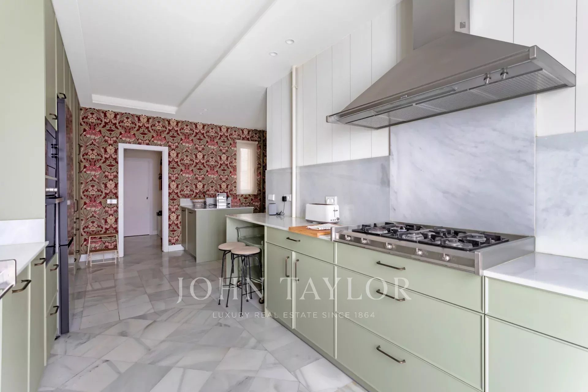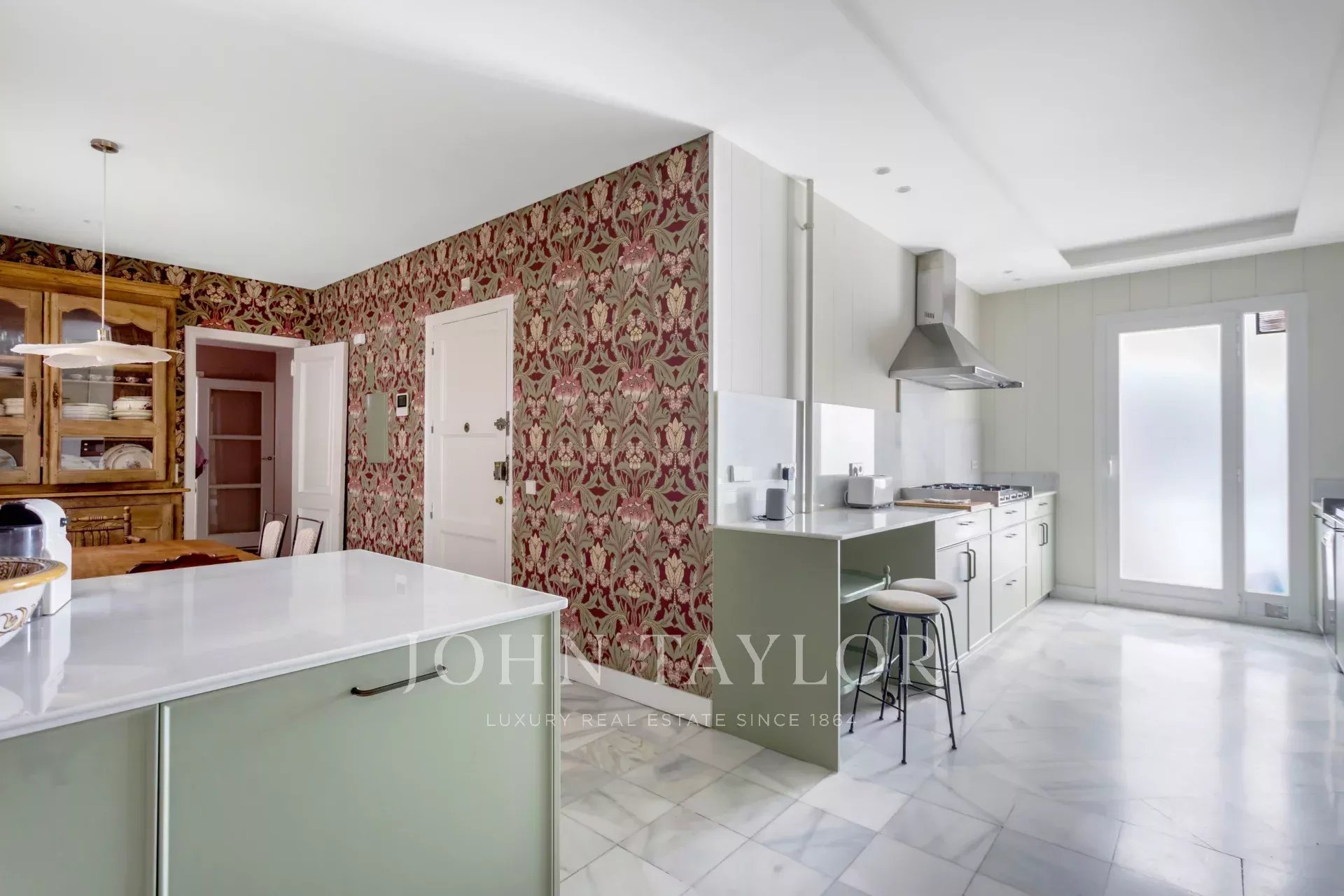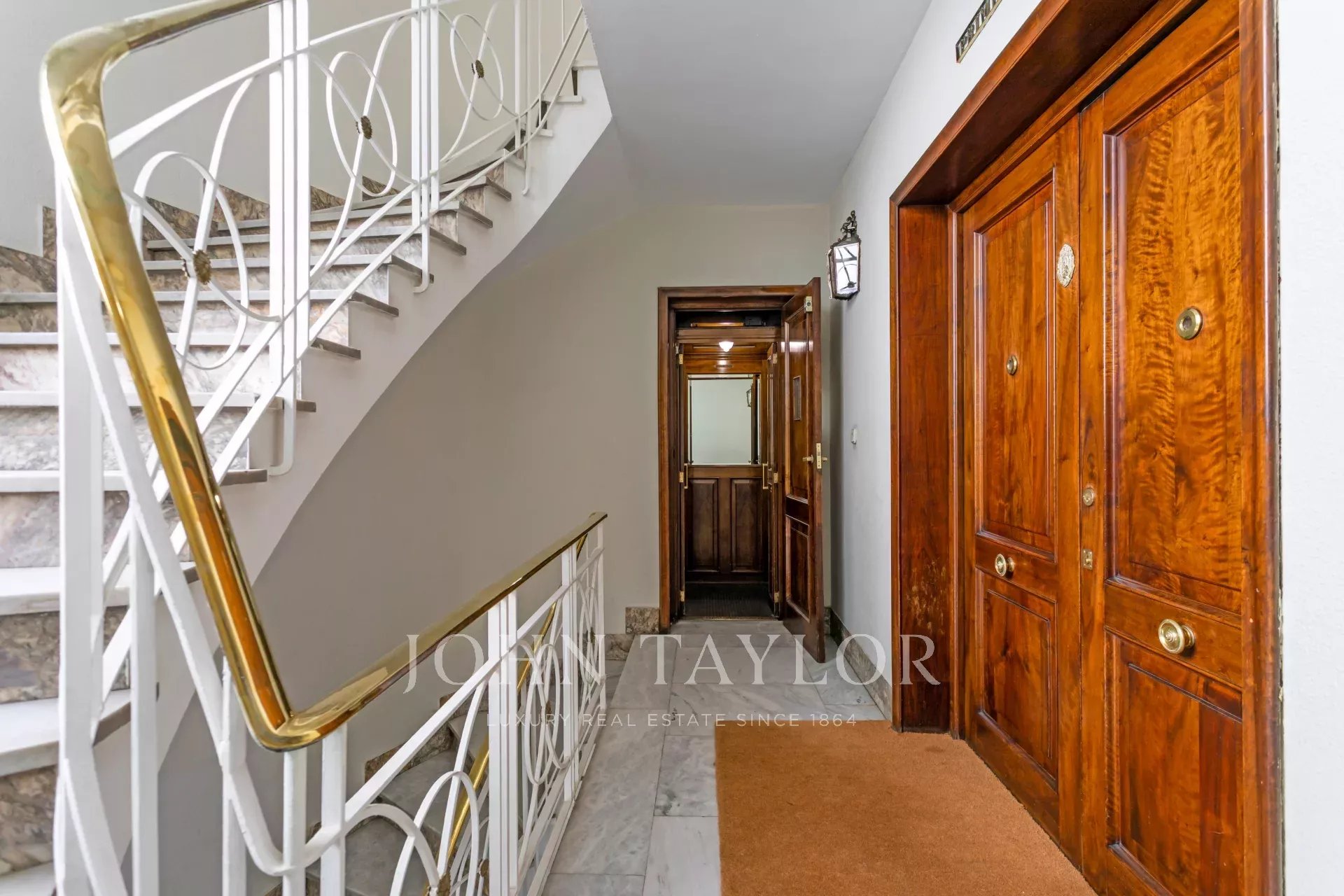 Une résidence exclusive de 305 m² avec une entrée majestueuse et un hall d'entrée de caractère, où les sols en marbre et en damier anticipent le ton élégant de la maison. L'étage intermédiaire, extérieur et orienté à l'est, permet à la lumière d'inonder les pièces à vivre dès le premier instant, mettant en valeur les proportions généreuses et la circulation entre les pièces : de grands salons représentatifs avec cheminée et moulures, une bibliothèque ou un bureau intégré et des salles à manger qui invitent à la fois à la vie de famille et à la réception d'invités.