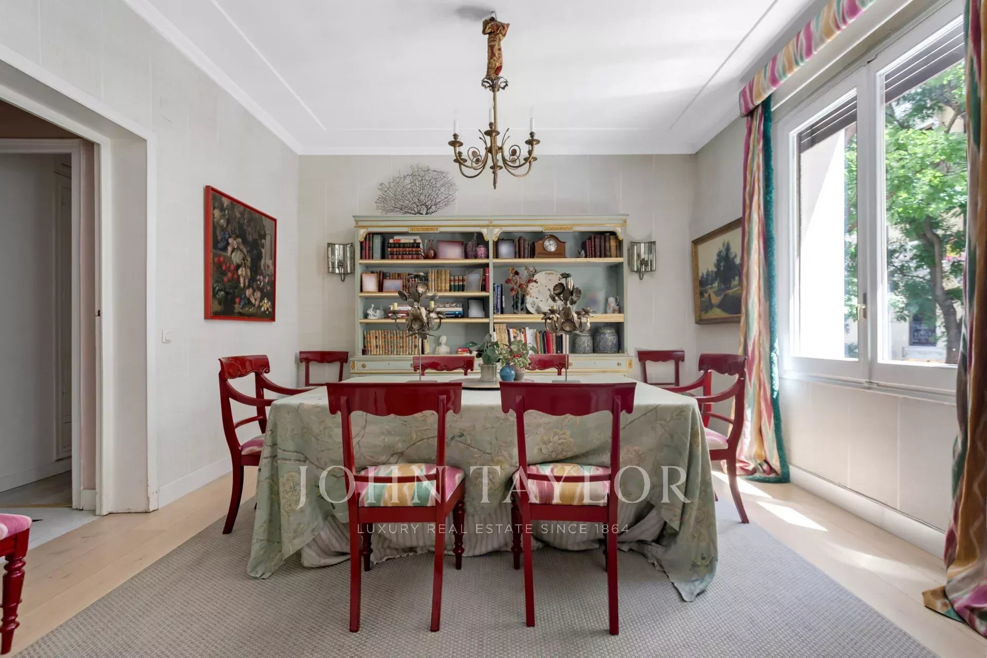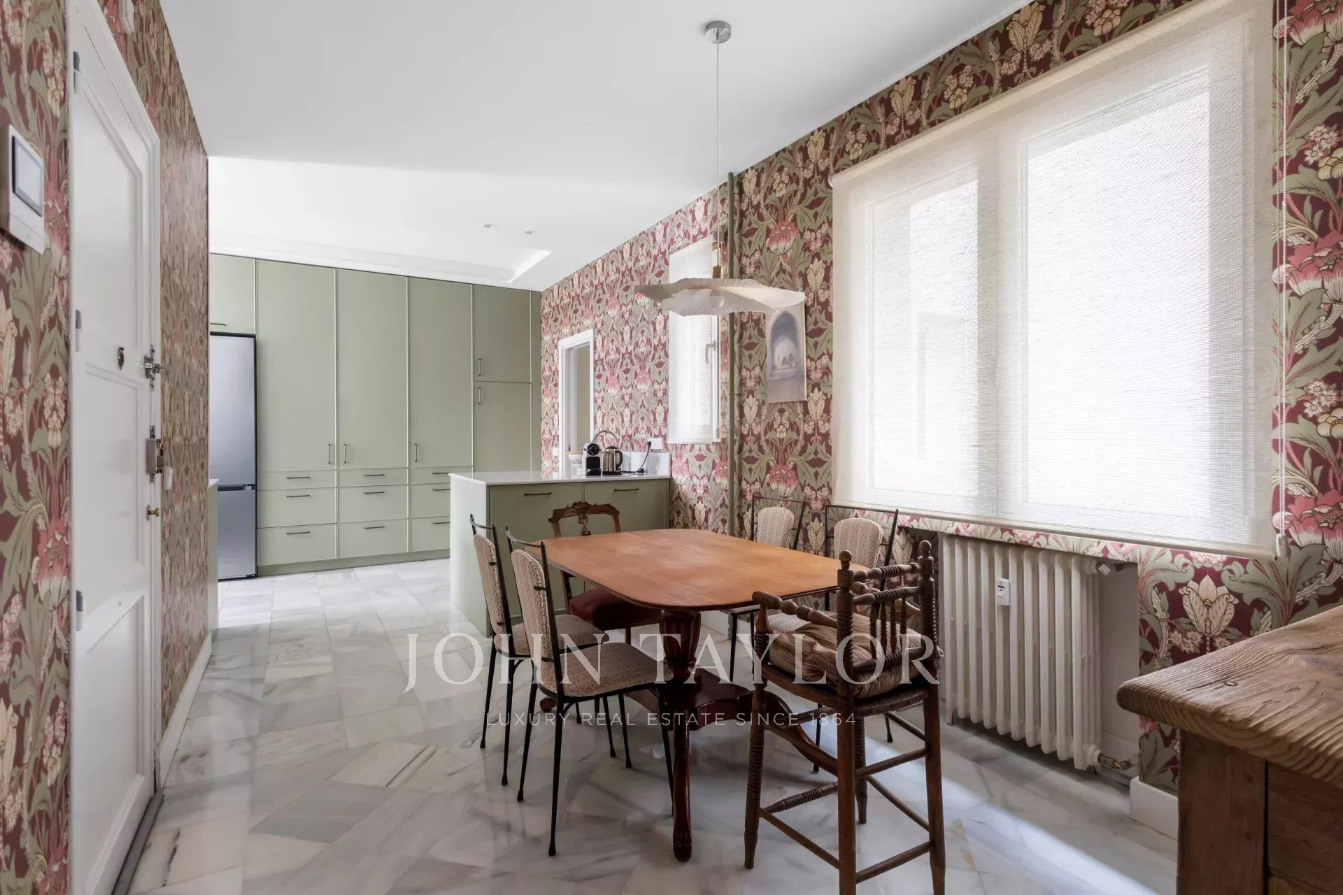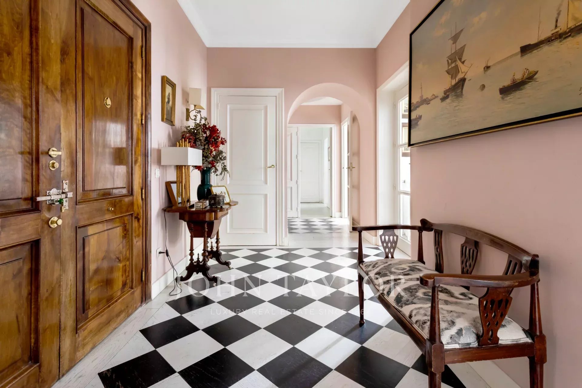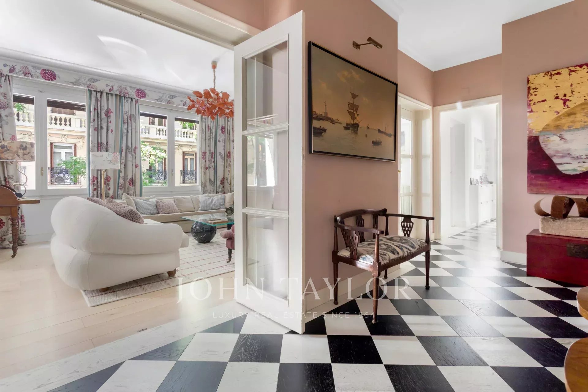 Une résidence exclusive de 305 m² avec une entrée majestueuse et un hall d'entrée de caractère, où les sols en marbre et en damier anticipent le ton élégant de la maison. L'étage intermédiaire, extérieur et orienté à l'est, permet à la lumière d'inonder les pièces à vivre dès le premier instant, mettant en valeur les proportions généreuses et la circulation entre les pièces : de grands salons représentatifs avec cheminée et moulures, une bibliothèque ou un bureau intégré et des salles à manger qui invitent à la fois à la vie de famille et à la réception d'invités.