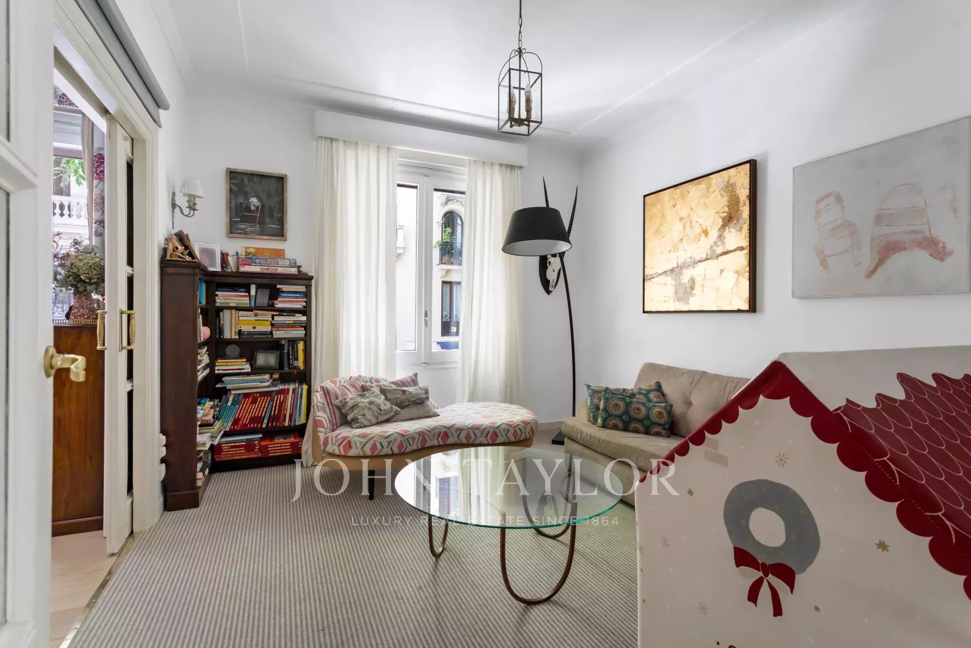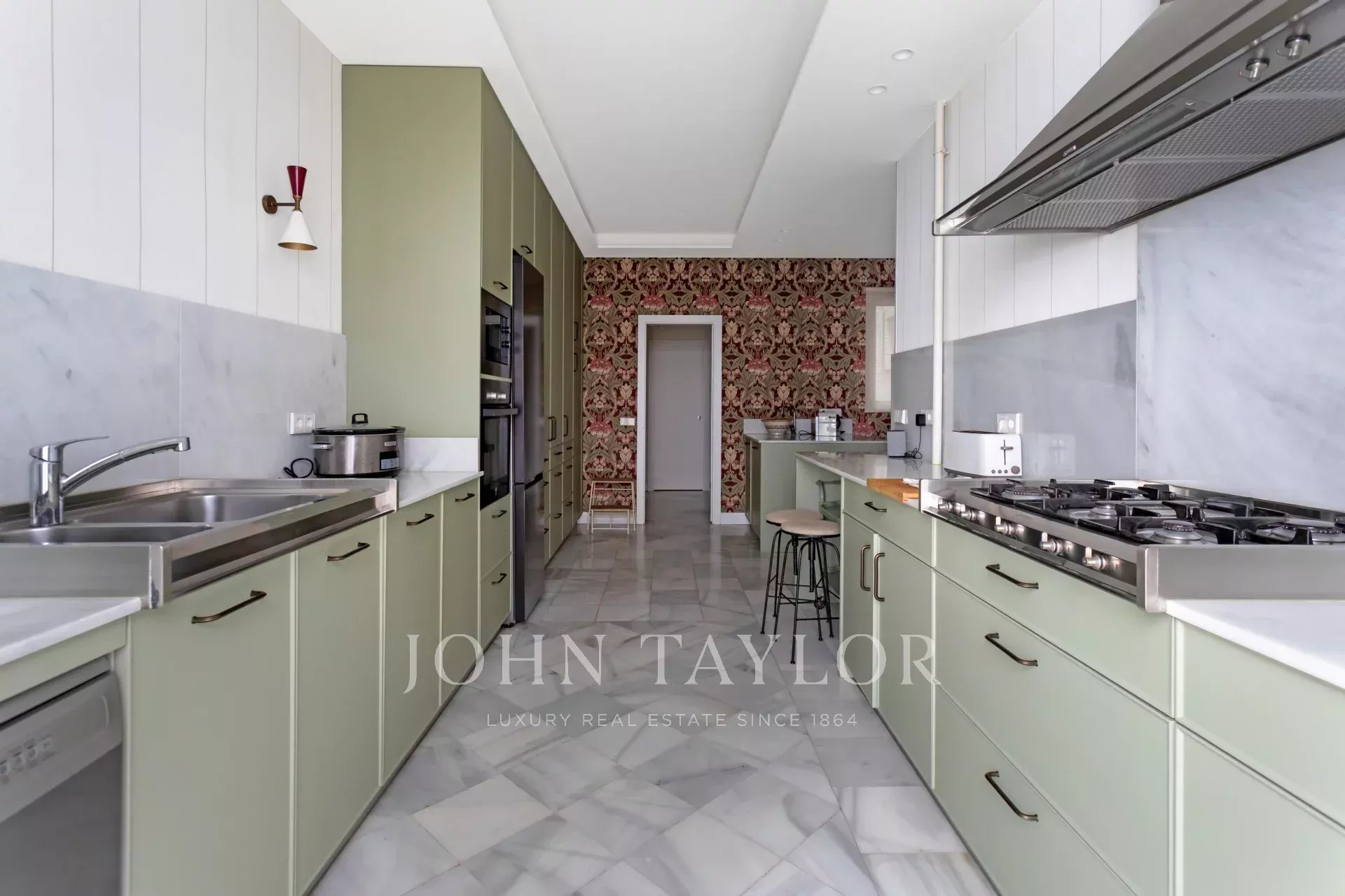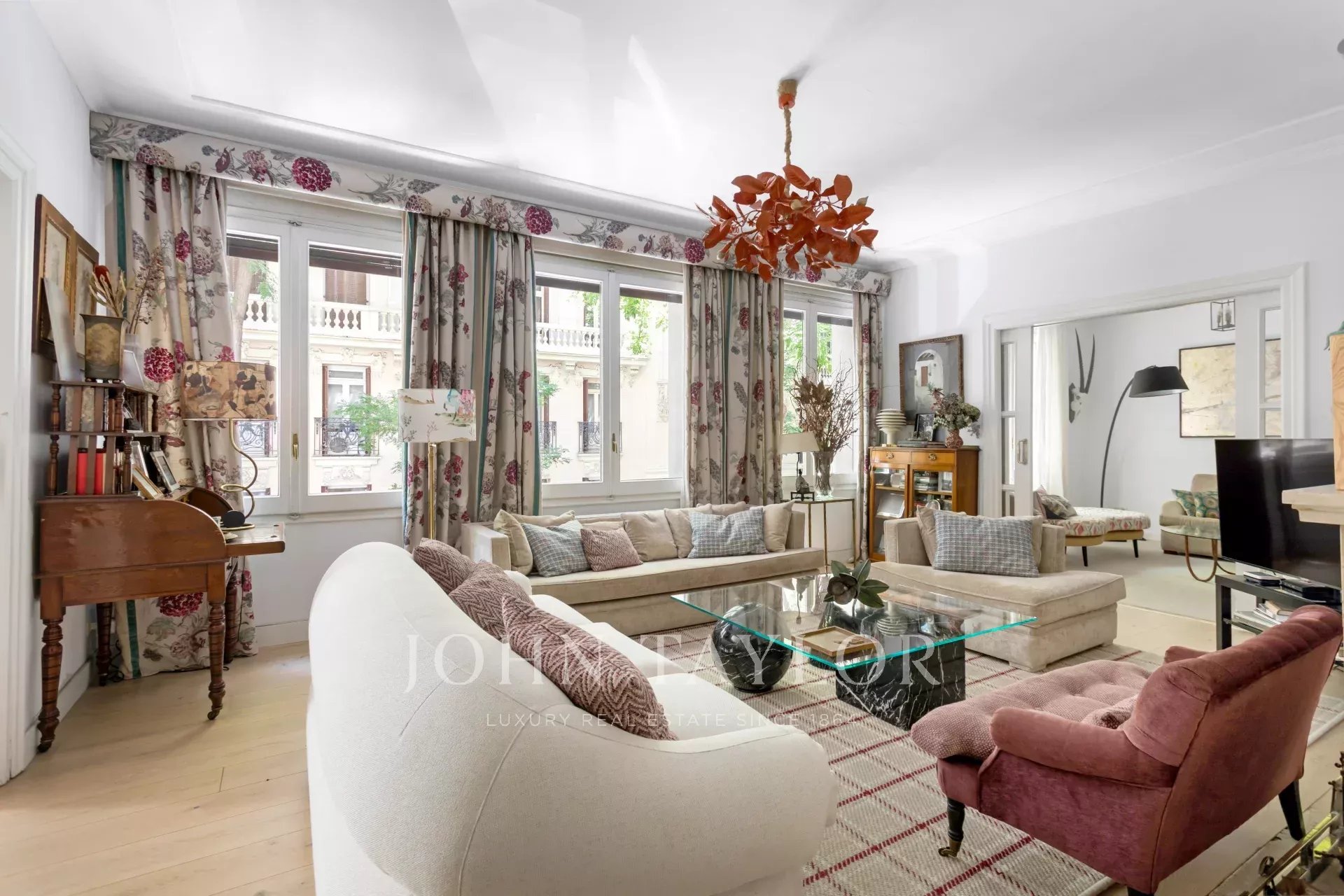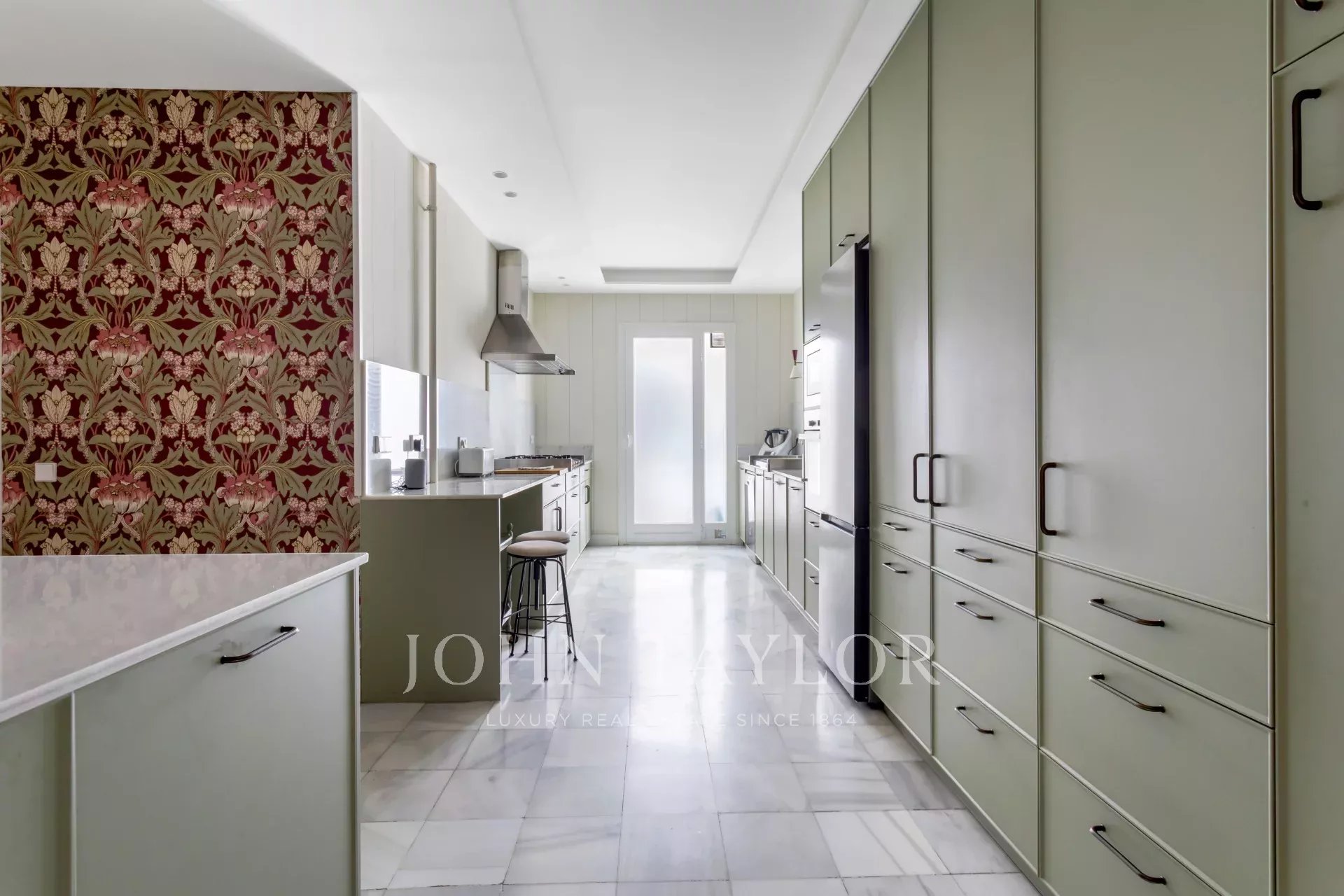 Une résidence exclusive de 305 m² avec une entrée majestueuse et un hall d'entrée de caractère, où les sols en marbre et en damier anticipent le ton élégant de la maison. L'étage intermédiaire, extérieur et orienté à l'est, permet à la lumière d'inonder les pièces à vivre dès le premier instant, mettant en valeur les proportions généreuses et la circulation entre les pièces : de grands salons représentatifs avec cheminée et moulures, une bibliothèque ou un bureau intégré et des salles à manger qui invitent à la fois à la vie de famille et à la réception d'invités.