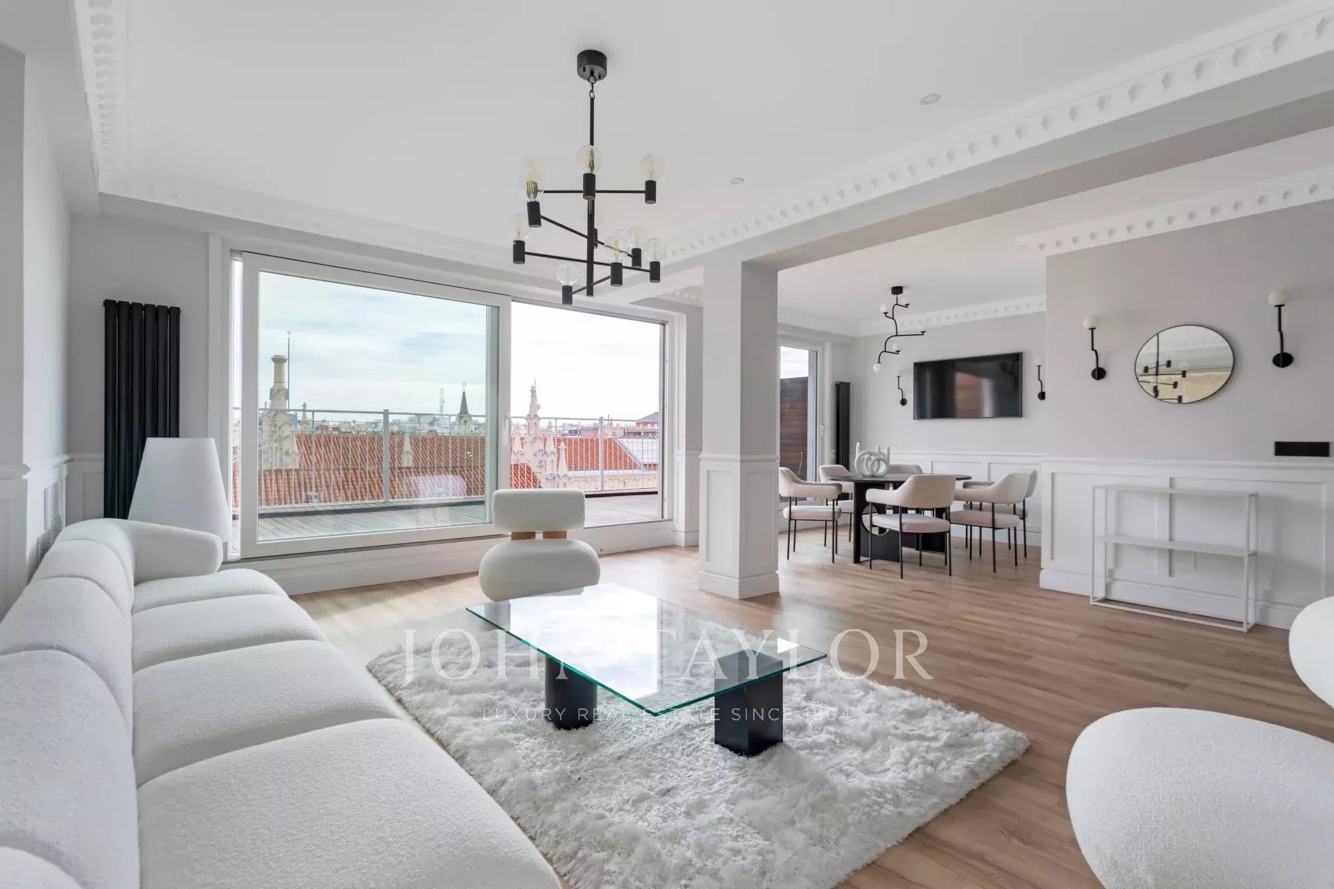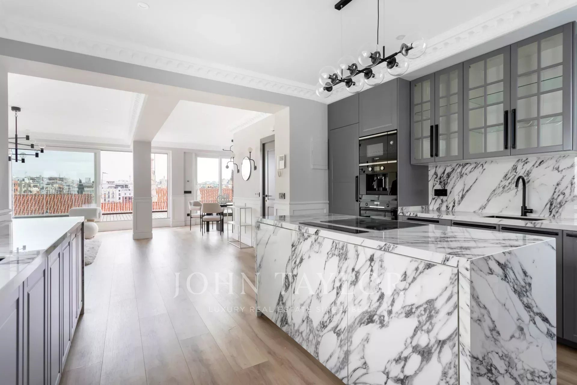 L'espace extérieur est occupé par le grand salon/salle à manger avec cuisine ouverte équipée d'appareils électroménagers haut de gamme. Une grande fenêtre coulissante permet d'accéder à la grande terrasse orientée à l'est et offrant une vue panoramique imprenable sur le Colegio de Nuestra Señora del Pilar.